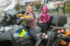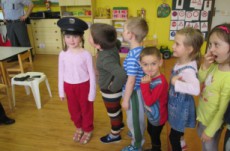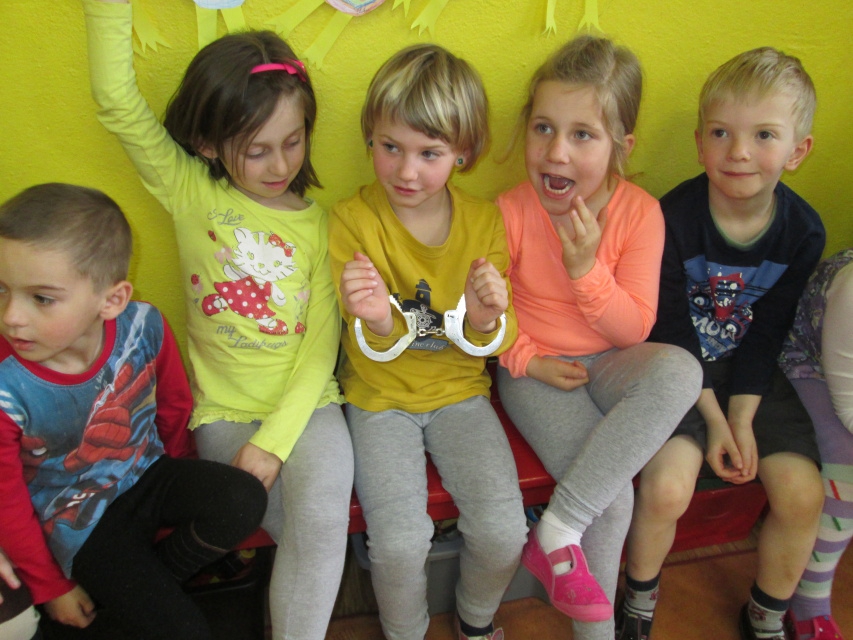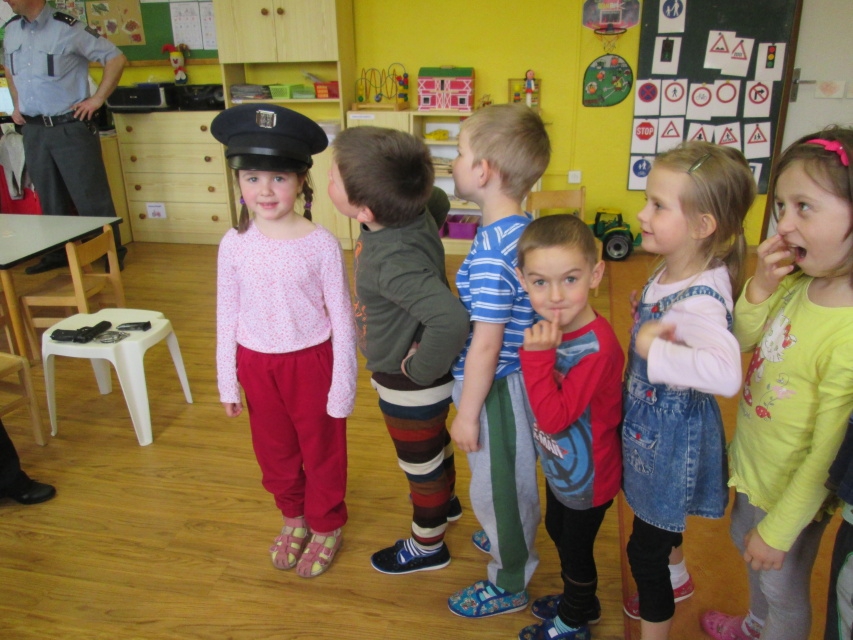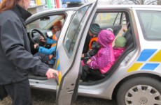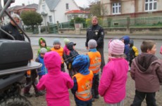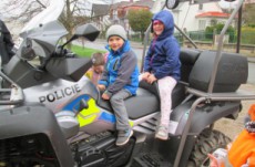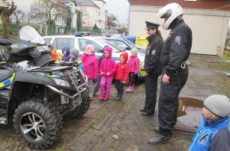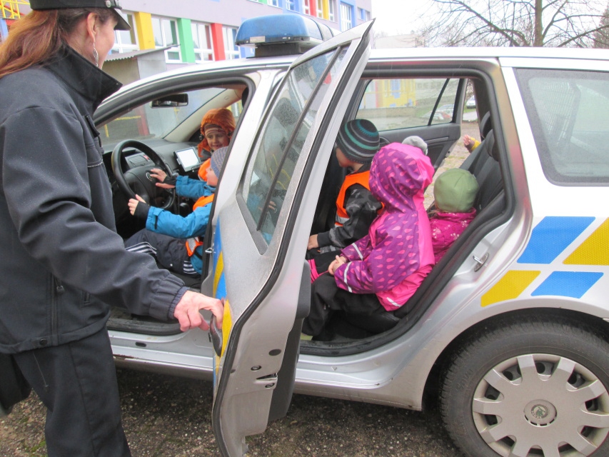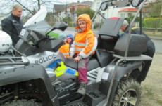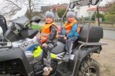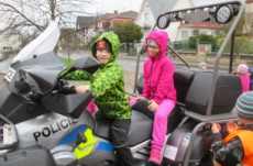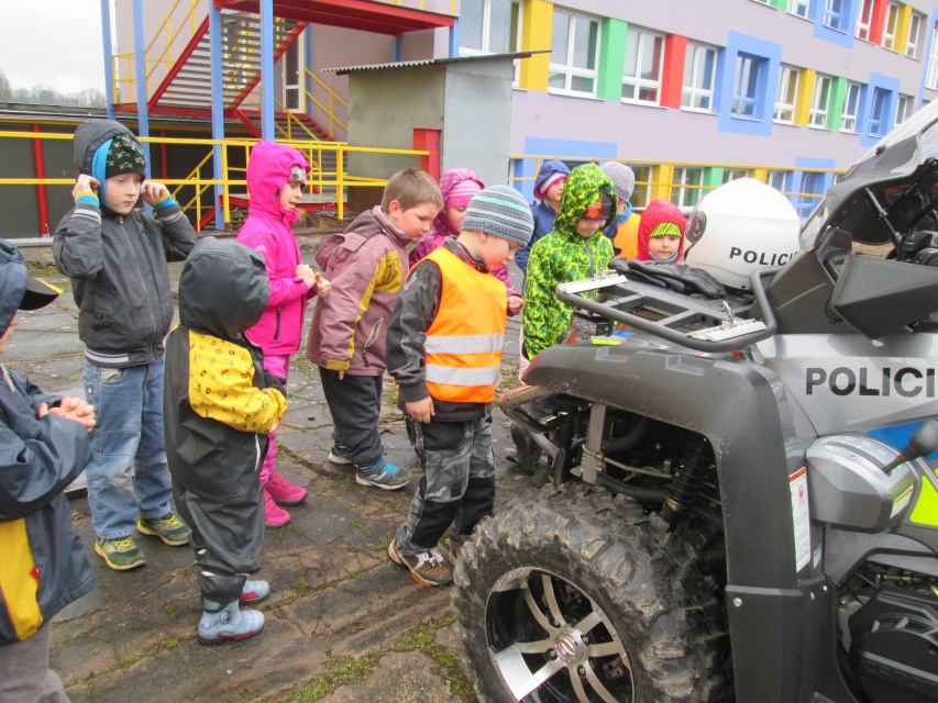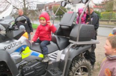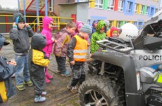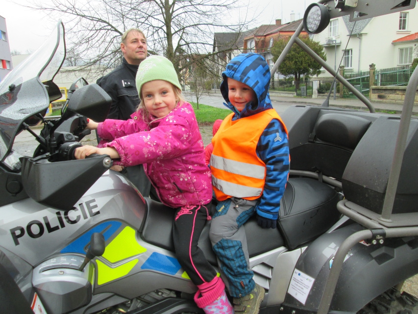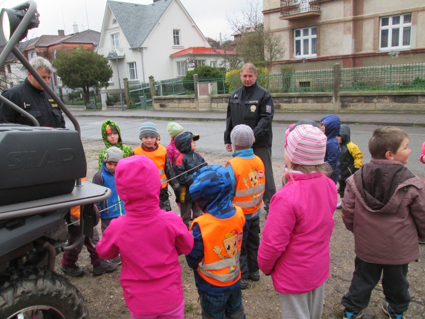 V dubnu jsme se učili poznávat význam dopravních předpisů a značek nejenom pro chodce. Byli jsme rádi, že náši školku navštívili dva policisté i mluvčí policie z Náchoda. U školky nám předvedli vybavení policejních aut i čtyřkolky, do kterých si děti mohly i sednout.