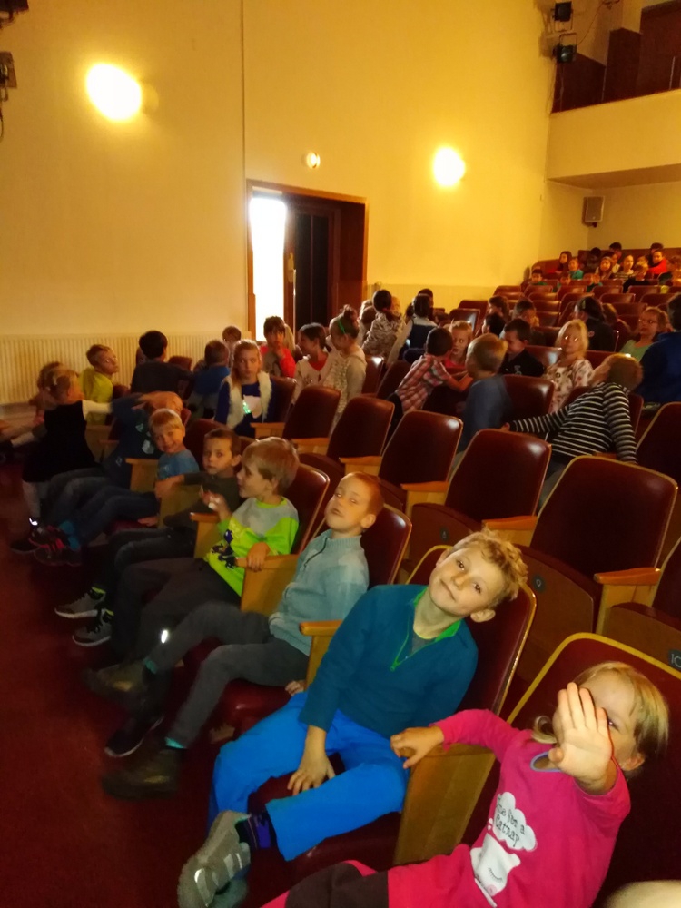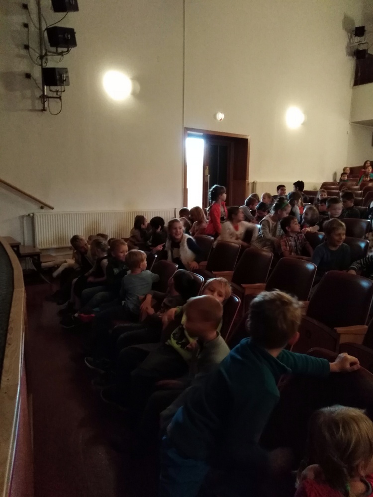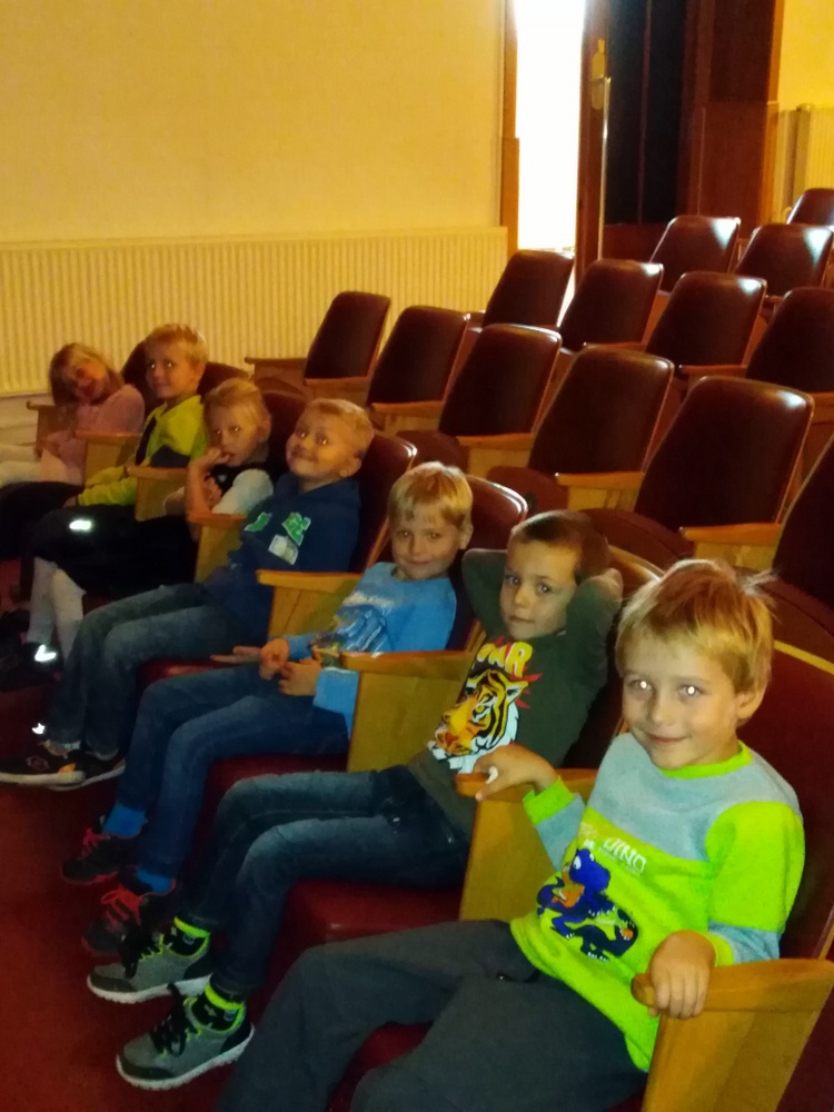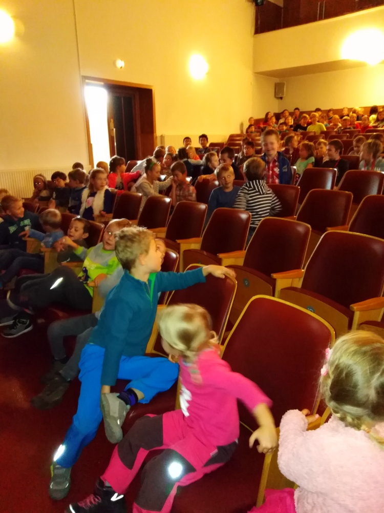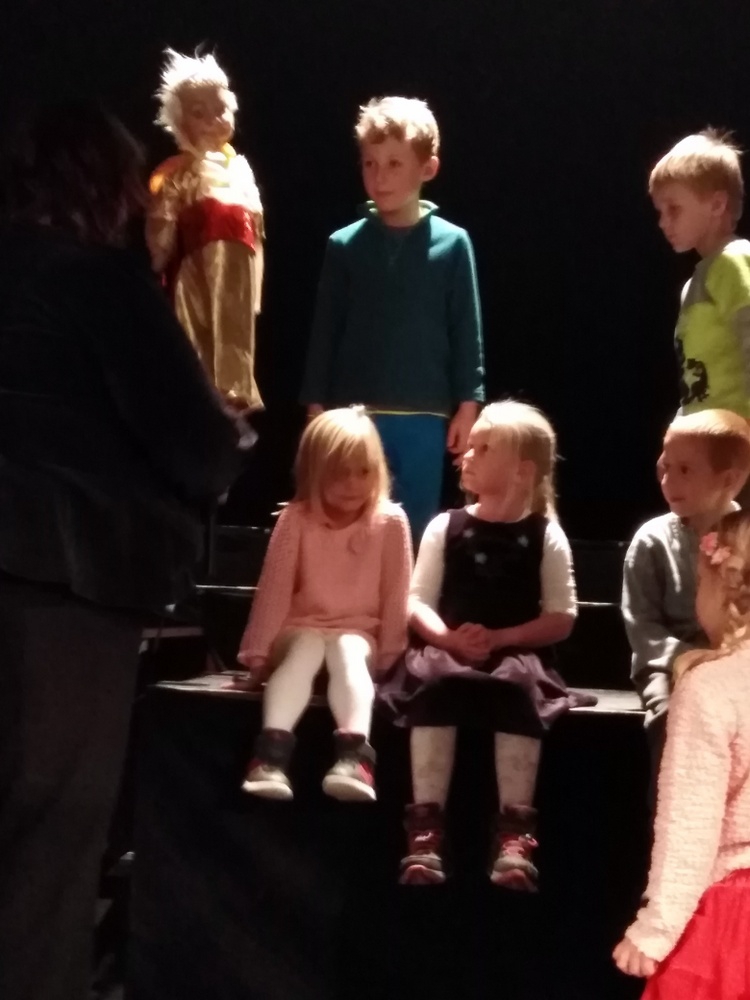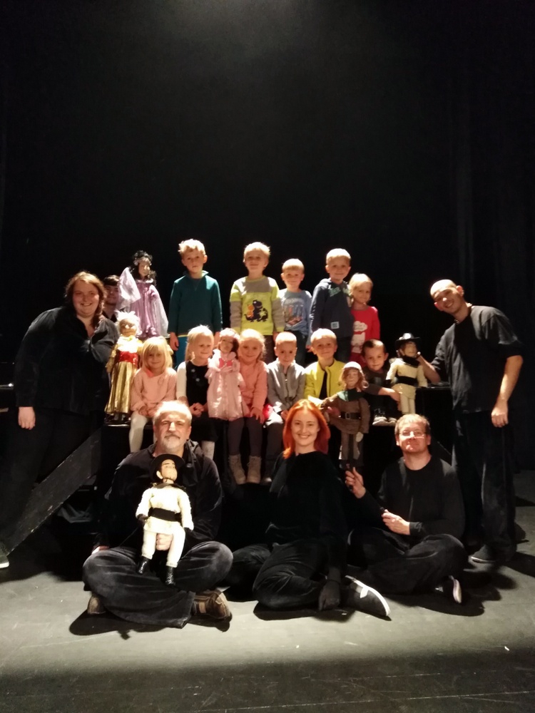 Děti se po skončení představení seznámily s loutkami i loutkoherci. Vše zakončilo společné focení na pódiu divadla.