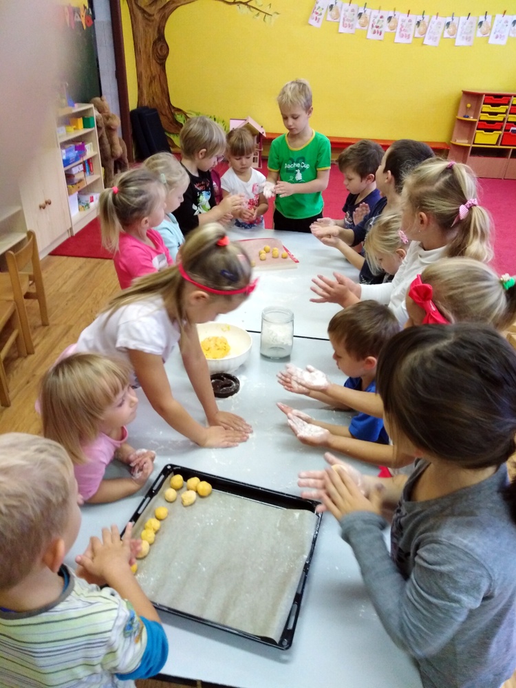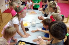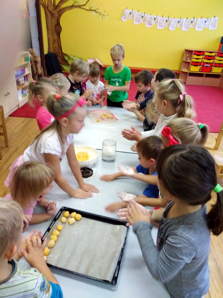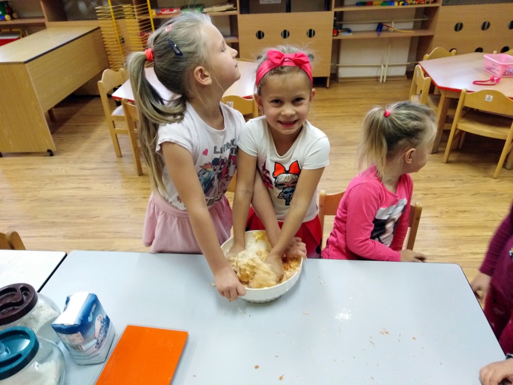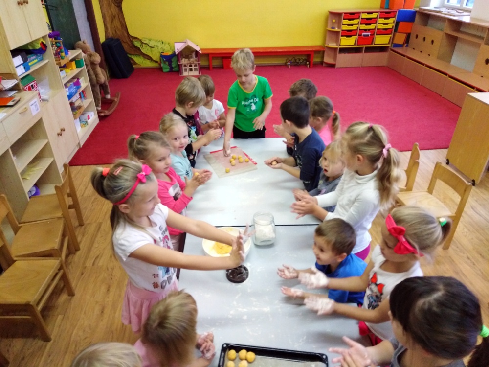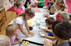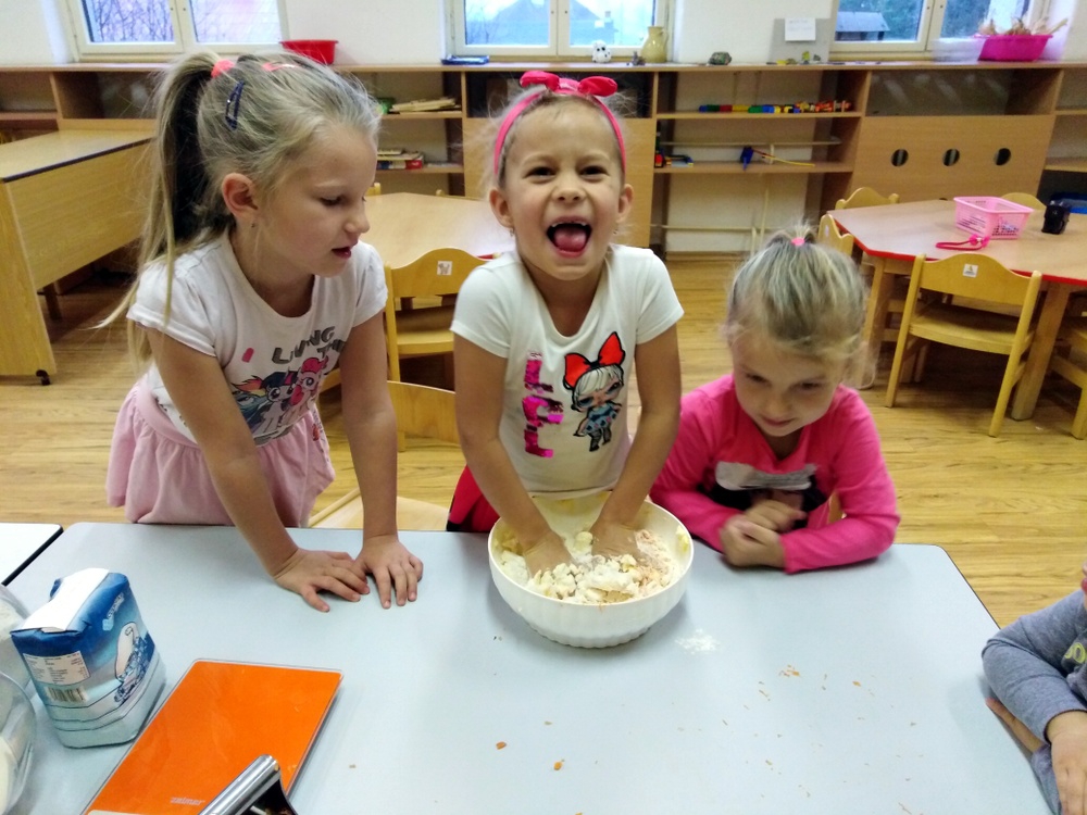 Povídali jsme si o tom, co která pranostika říká a společně jsme si ji vyvětlily. Nejvíc děti bavilo pečení: míchání těsta a výroba koláčků.