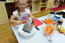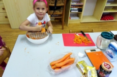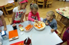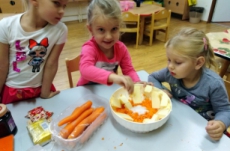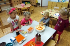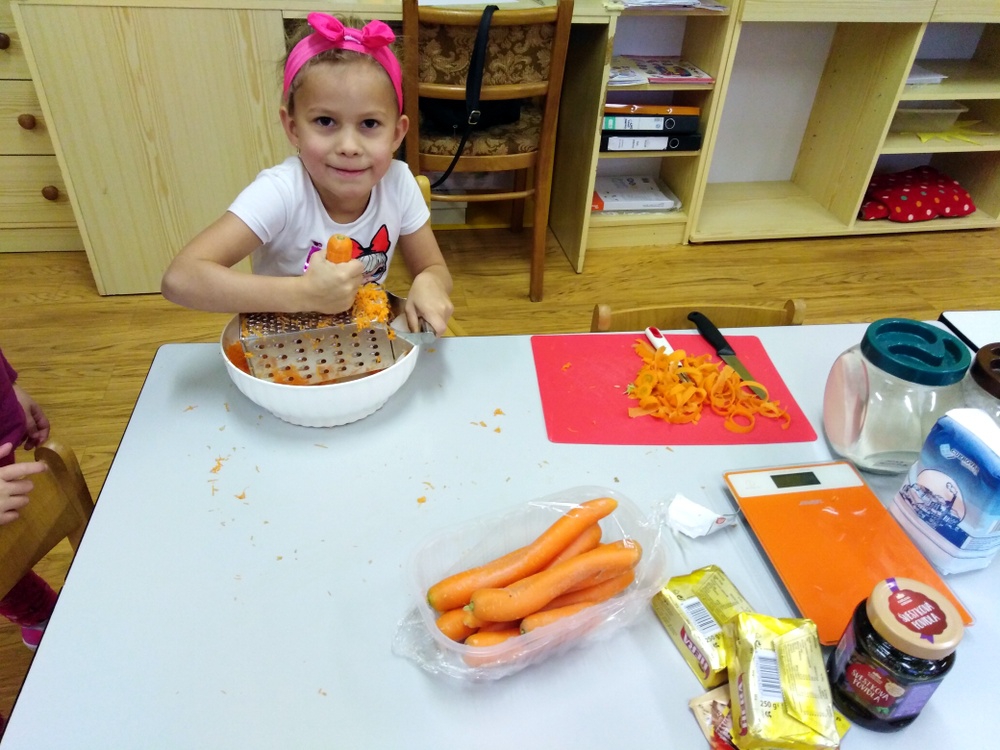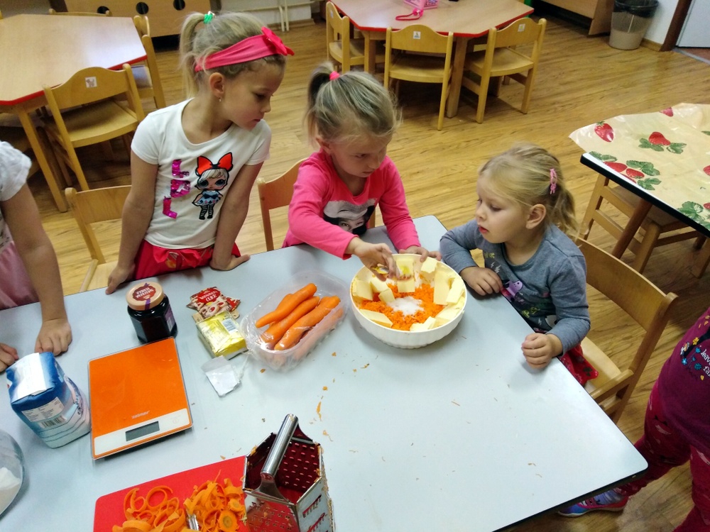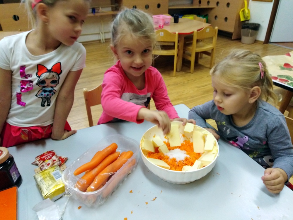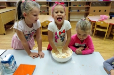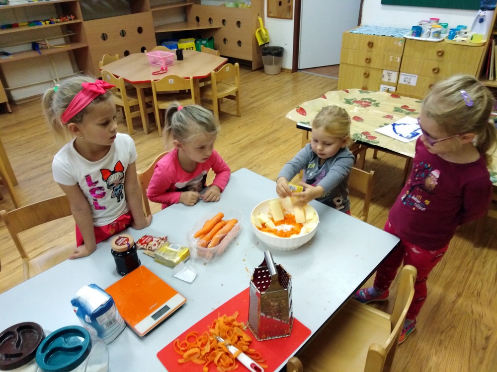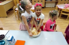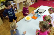 Povídali jsme si o tom, co která pranostika říká a společně jsme si ji vyvětlily. Nejvíc děti bavilo pečení: míchání těsta a výroba koláčků.