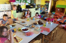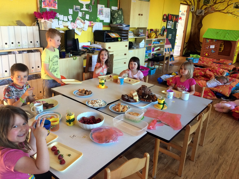 Tentokrát jsme se sešli na zahradě v 17:00, kde děti plnily různé soutěže a poté jsme si s rodiči opekly špekáčky a poseděli u plného stolu dobrot, které rodiče přinesli. Všem moc chutnalo.