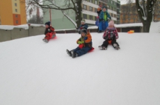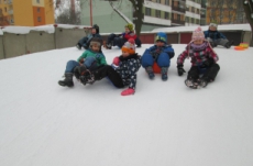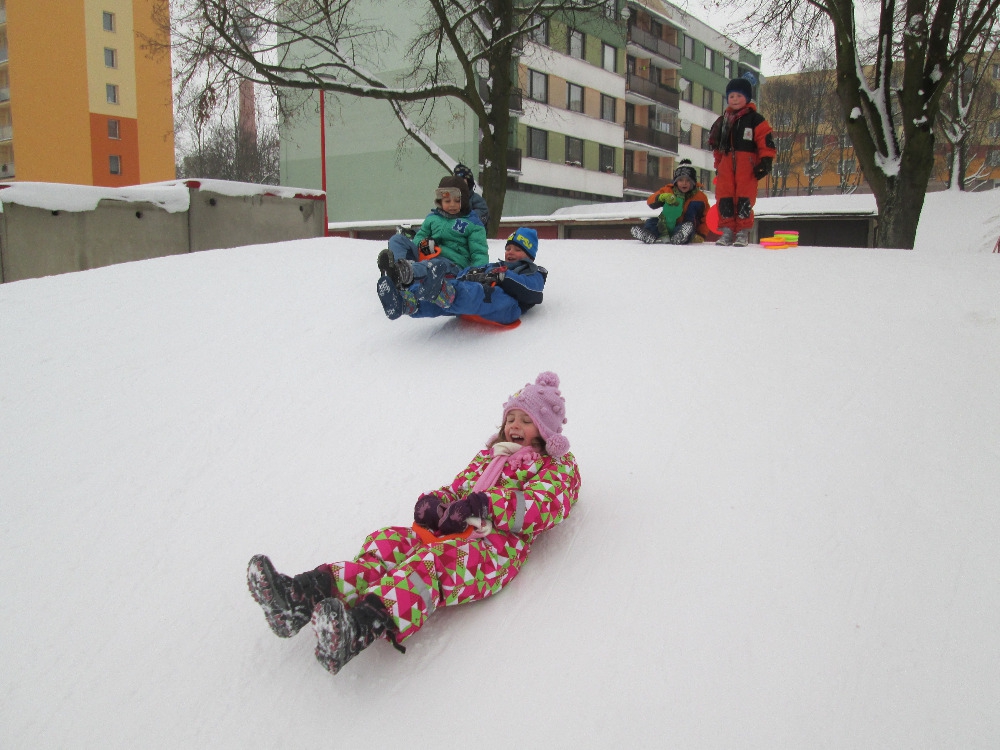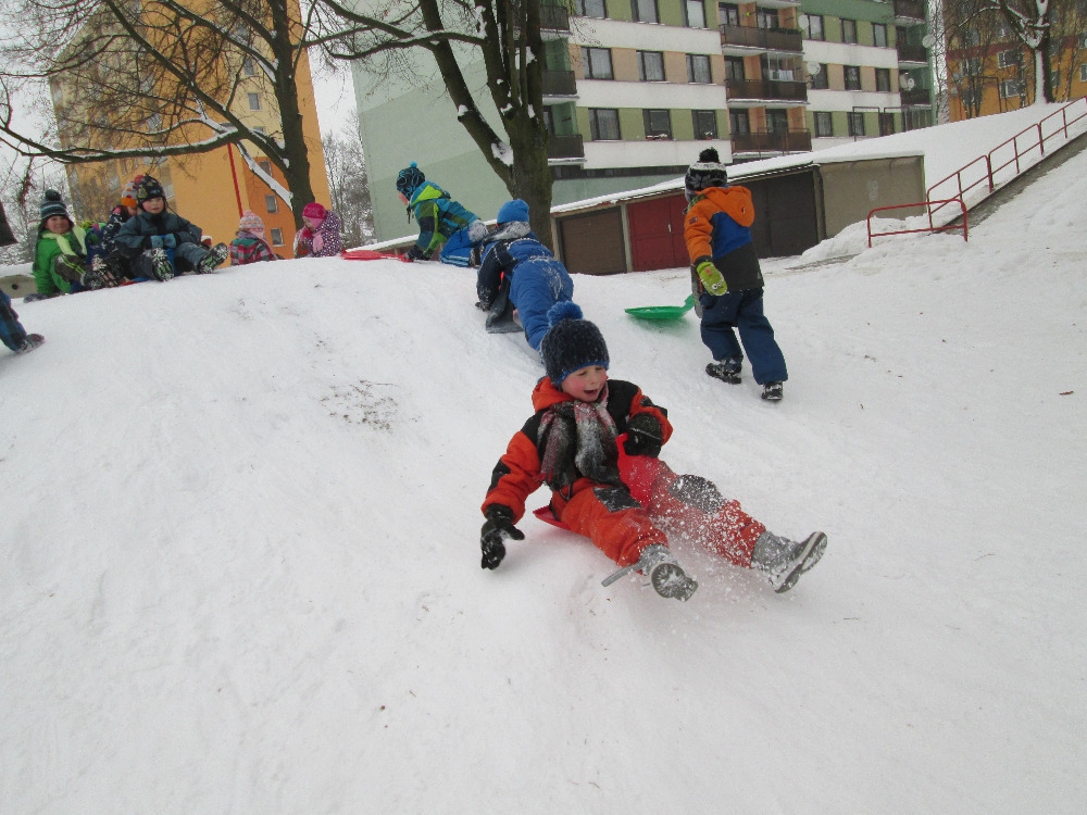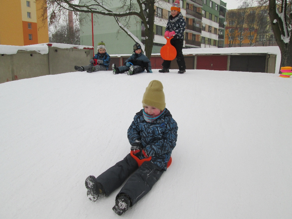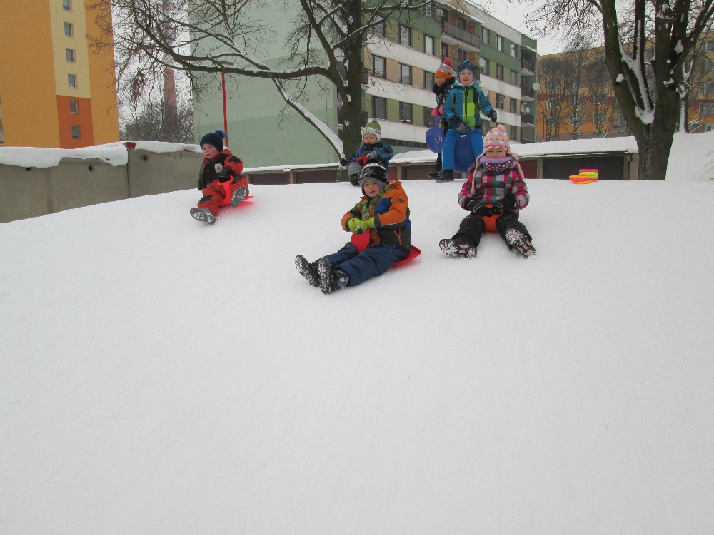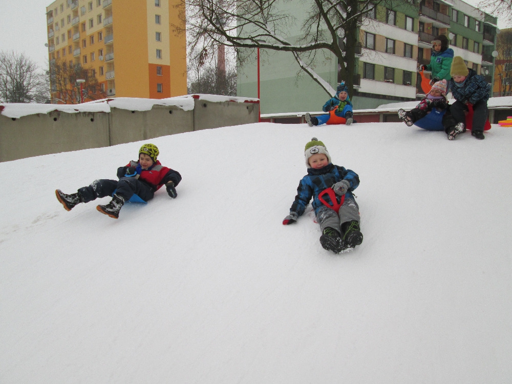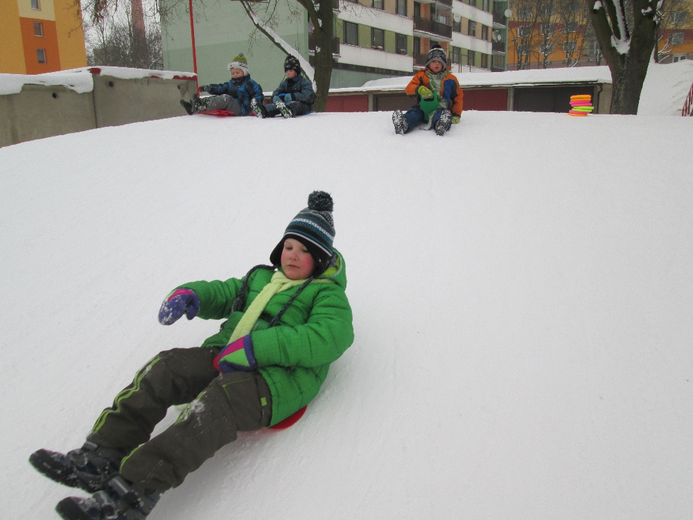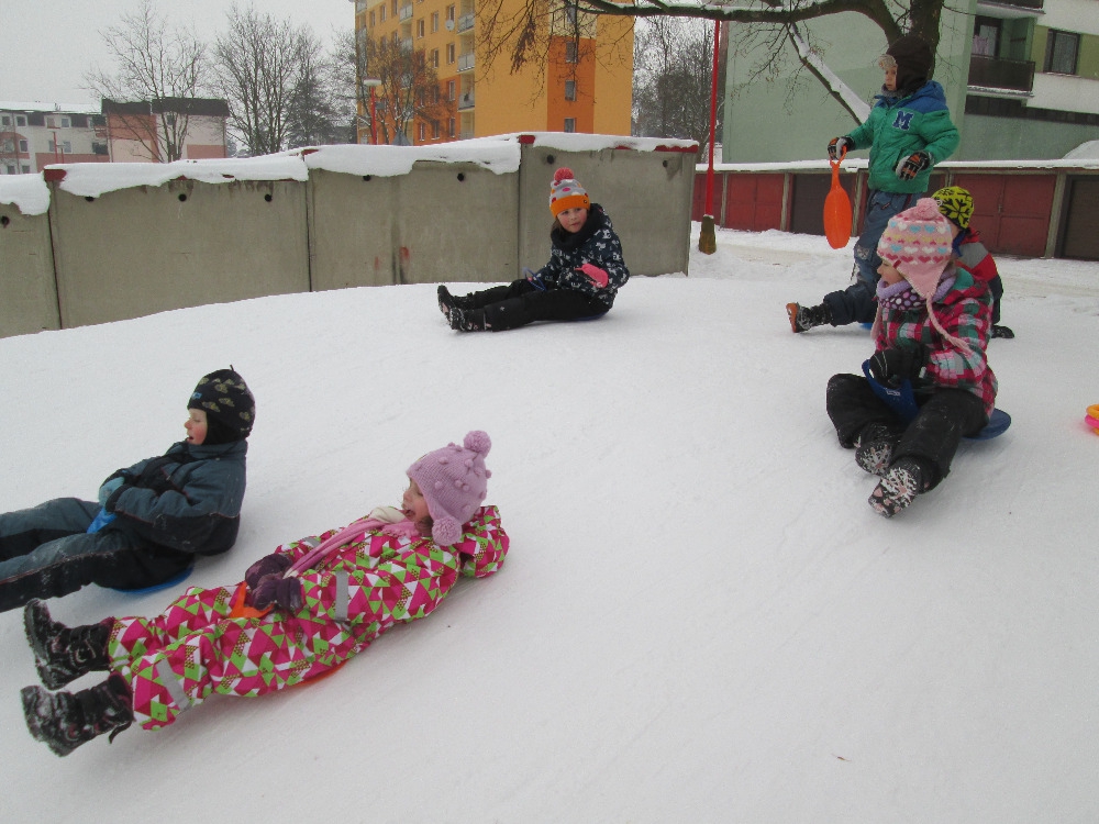 Konečně jsme se dočkali sněhové nadílky. Chodíme s dětmi jezdit na plastových lopatách, tvoříme stavby ze sněhu, vyšlapujeme obrazy a cesty ve sněhu.