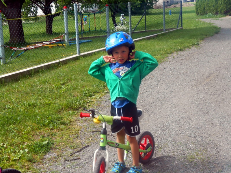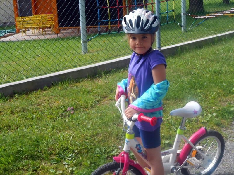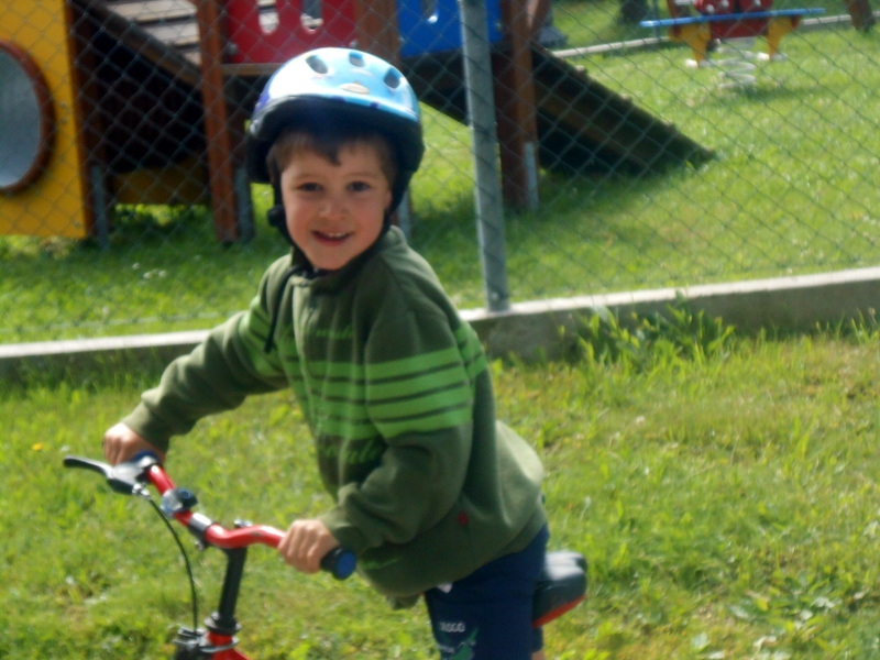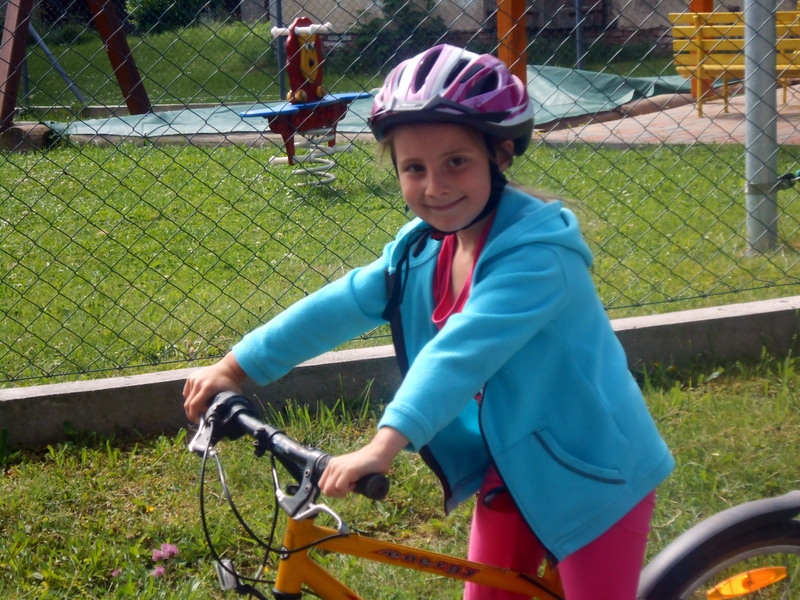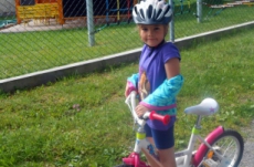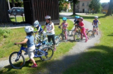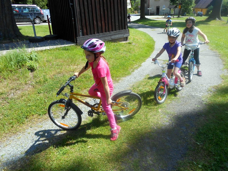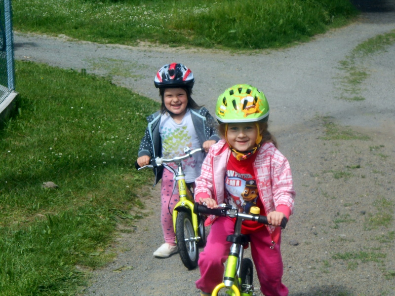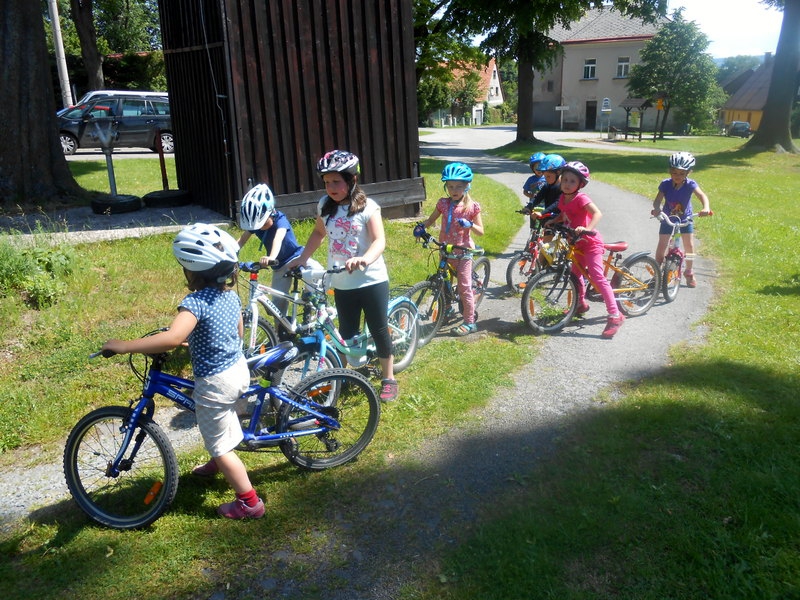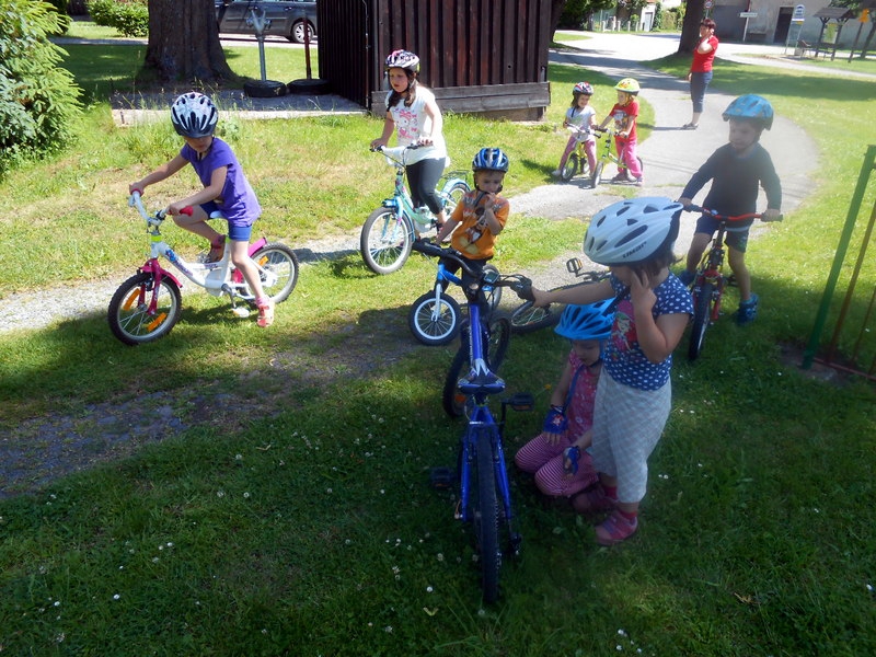 Na školním výletě jsme se svezli autem, vlakem i autobusem. A protože má každý z dětí doma kolo nebo odrážedlo, využili jsme i těchto prostředků. Děti si je přivezly, společně jsme si je prohlédli a popovídali jsme si o bezpečnosti při jízdě na kolech – důležitá je helma, musí se jezdit opatrně, po pravé straně. Seznámili jsme se i nejznámějšími dopravními značkami. A potom nastala jízda, využili jsme terénu okolo školky, někdo si zkusil na kole i slalom. Nejzdatnějšími cyklisty byli Honzík Bernard a Julinka Pášmová. Všem dětem se jízda velice líbila!