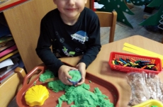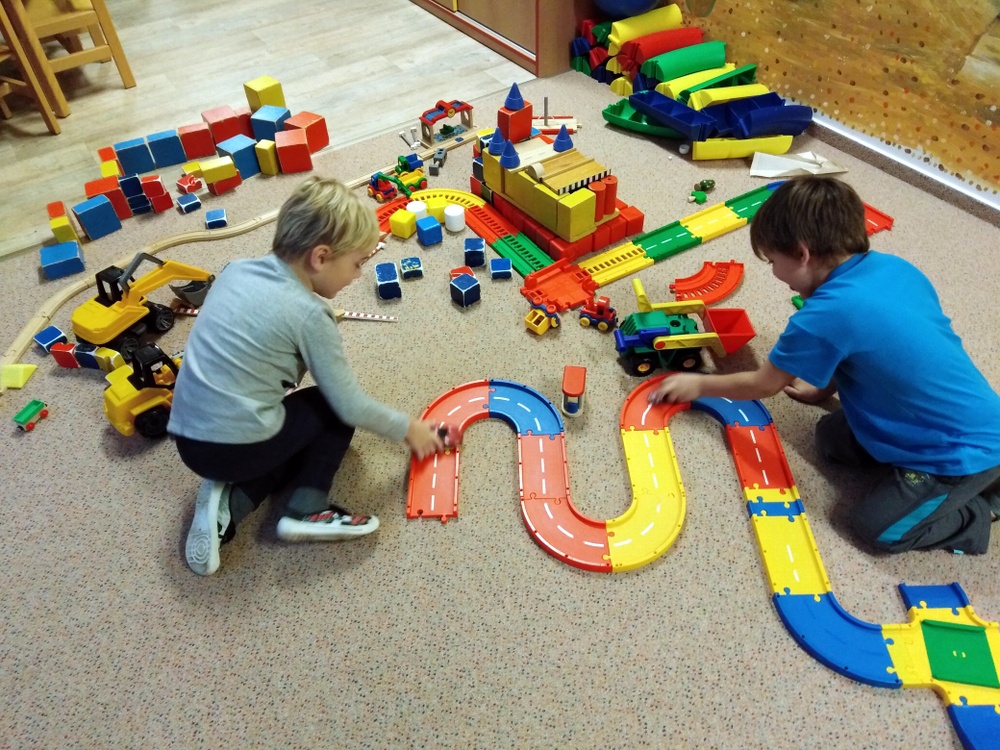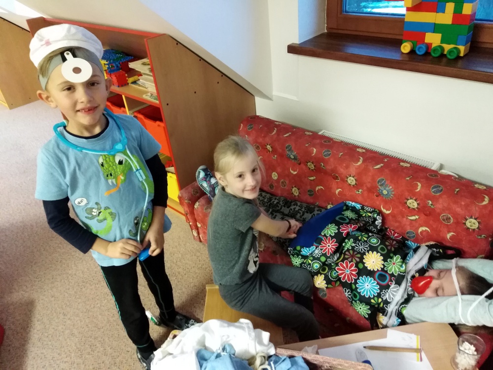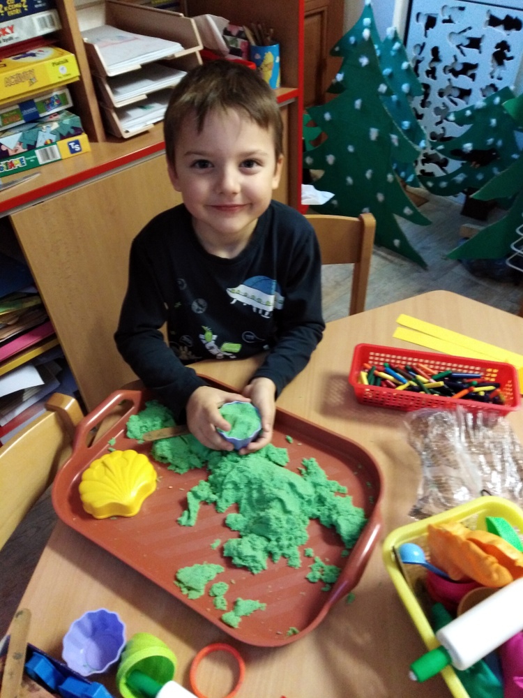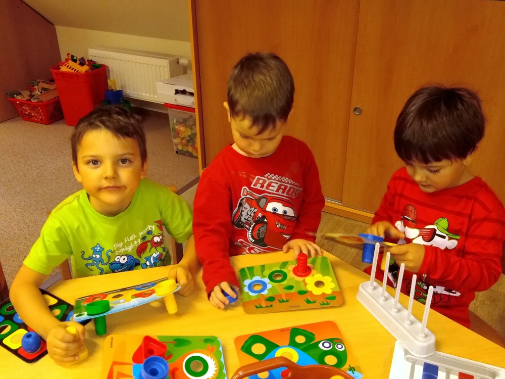 Ve dvou listopadových týdnech jsme se věnovali tématu povolání – „Ten dělá to a ten zas tohle“, děti si vyzkoušely různá povolání prostřednictvím námětových her. Na doktora, na automechanika, stavitele, cukráře, závozníka apod. Zkoušely si upéct z vizovického těsta housky a vánočky, navrhovaly svoje vlastní košilky a trička, tvořily dortíky z kinetického písku, stavěly silnice, domy a vyzkoušely si, jak se odlívá beton.
