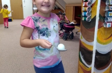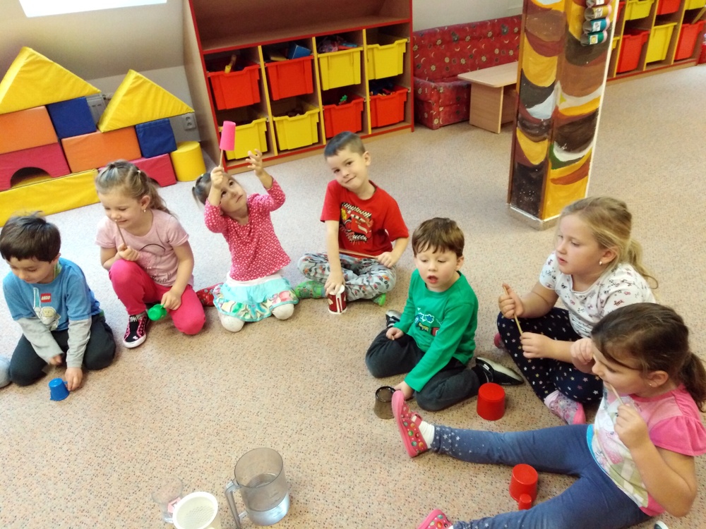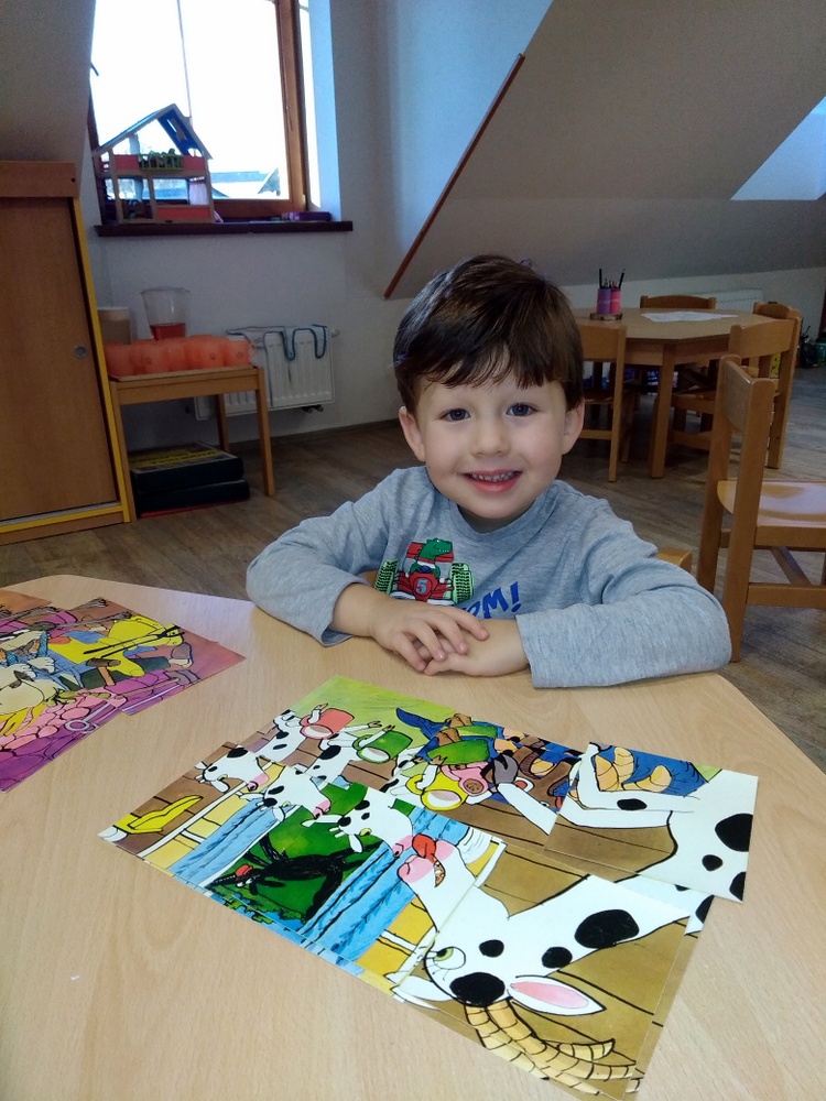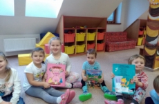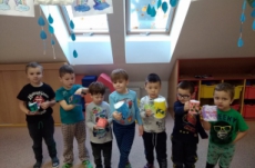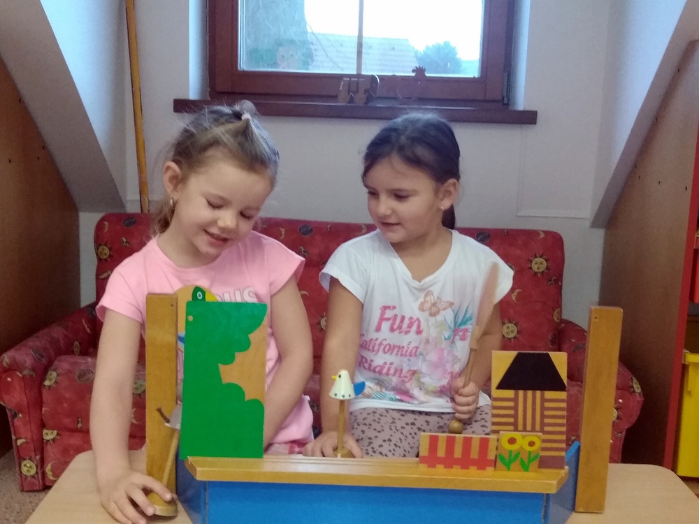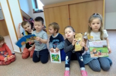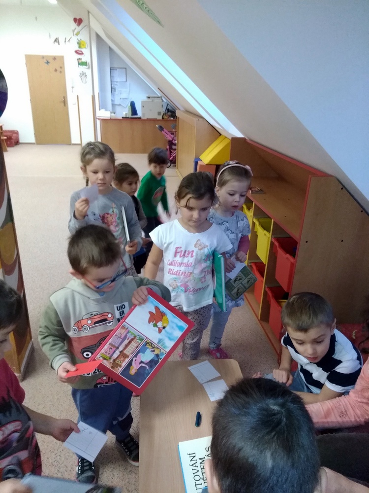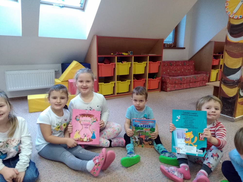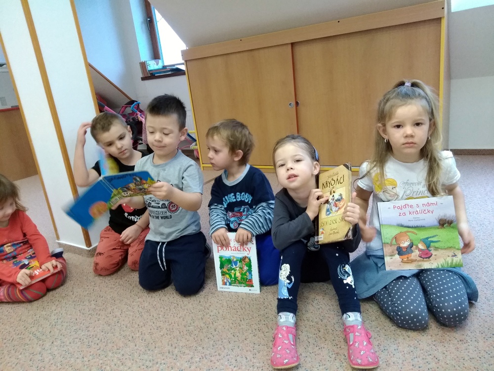 Dokonce si i zabojovaly s drakem. Jeden týden jsme věnovali knihám, děti měly možnost přinést si svou oblíbenou knihu. Z knih jsme si vytvořili výstavku, děti se učily šetrně zacházet s knihou. Seznámily se s pojmem knihovna, na kterou jsme si i zahráli. Poslední týden byl Večerníčkový, děti poznávaly různé melodie z pohádek, některé pohádky jsme i zhlédli. Největší úspěch měl Pat a Mat, vyzkoušeli jsme si i použití nevídaných předmětů. Jeden z našich kamarádů oslavil čtvrté narozeniny.