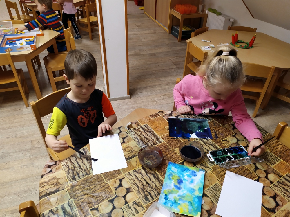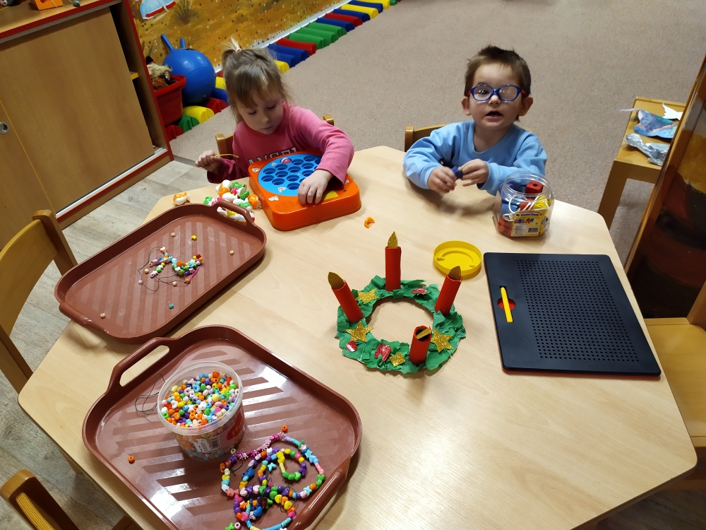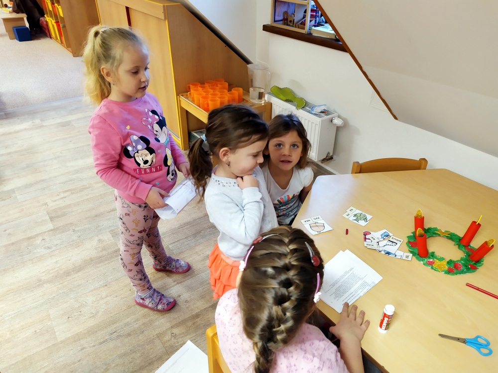 Adventní období jsme si zpříjemnili spoustou vánočních aktivit, jako je třeba vykrajování perníčků, tvorba čertovských řetězů, andílkovských přáníček, zdobení kapříků, tak i poslechem koled. Každý den na nás čekal jeden adventní úkol, který byl ukryt v jednom z 24 domečků. Také nás neminula návštěva sv. Mikuláše s andělem a čertem. Za písničku nebo básničku děti dostaly dárek a slíbily sv. Mikulášovi, že zlepší uklízení a že si navzájem nebudou ubližovat.