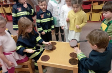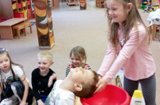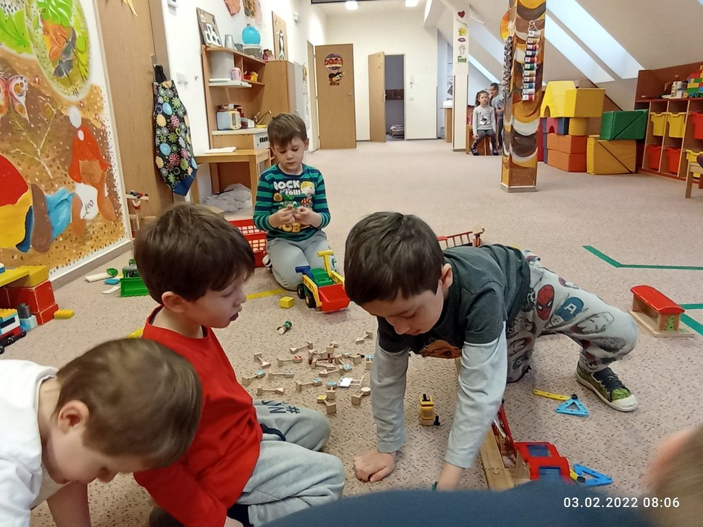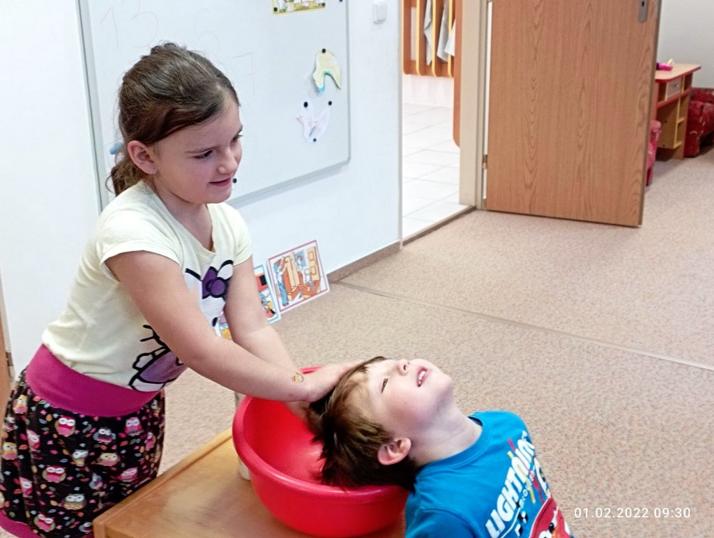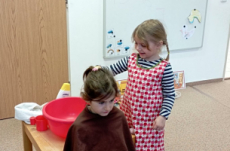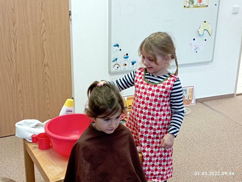 Zkraje měsíce jsme se věnovali řemeslům a povoláním. Především dívky zaujala hra Na kadeřnictví – učily se pečovat o vlasy, vytvářely různé účesy, učily se pracovat s natáčkami. Někteří chlapci se nechali od dívek učesat a moc jim to slušelo! Pro kluky jsme přichystali různé hry s vlakem – poznali jsme povolání strojvedoucího, výpravčího a průvodčího.