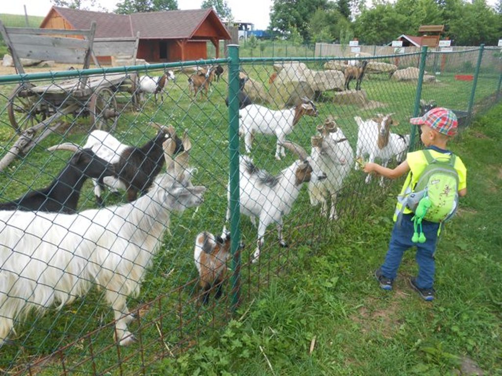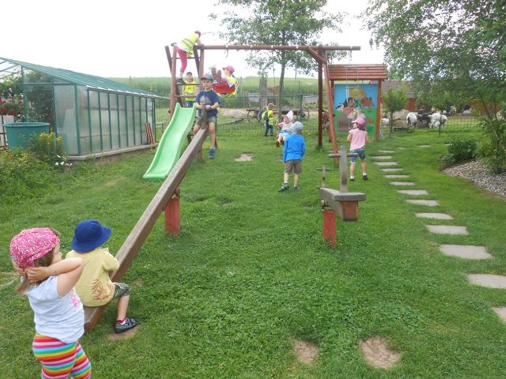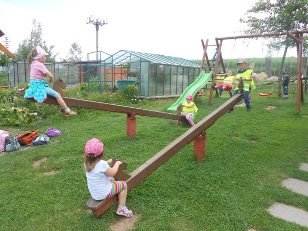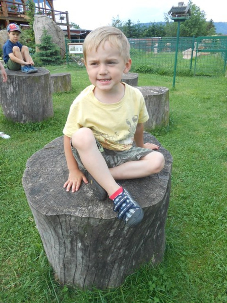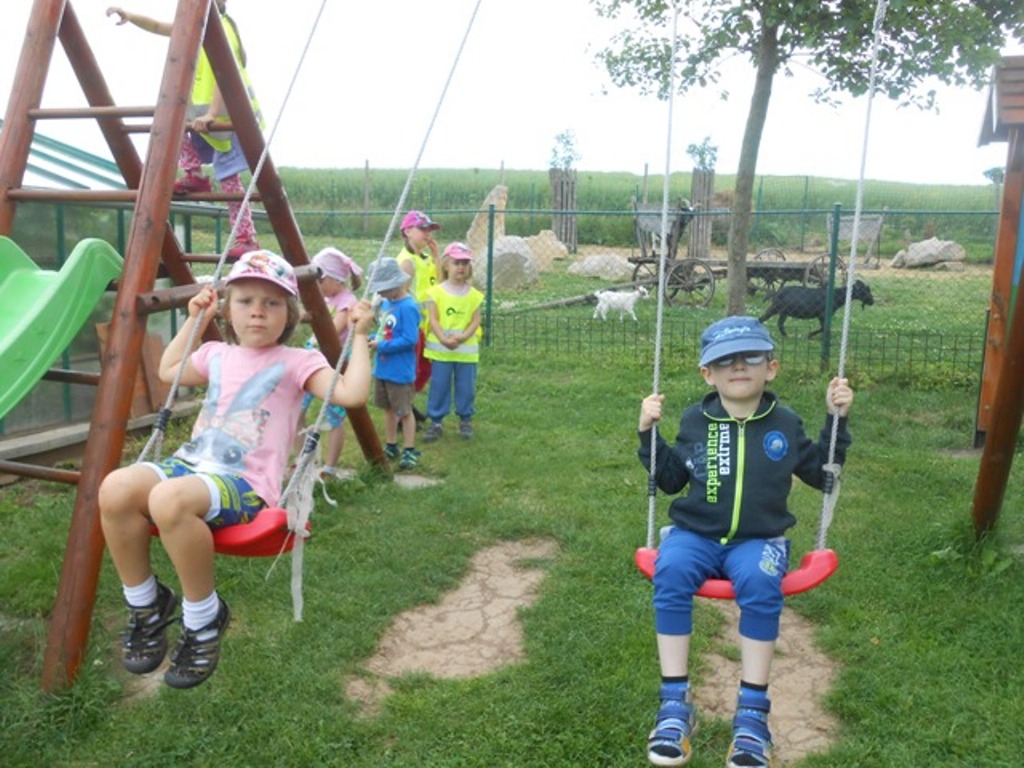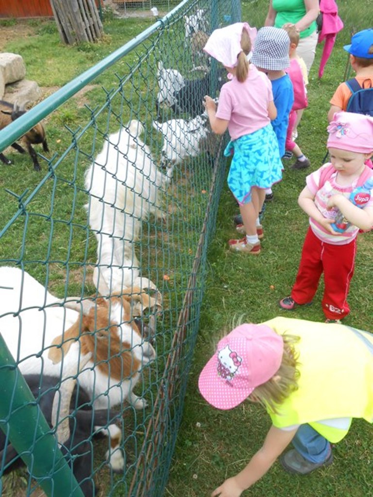 V Broumově na nádraží jsme si pochutnali na svačince a vydali se směrem Farma Wenet. Pan Weber nás provedl farmou, viděli jsme celou řadu zvířátek – kozy, pávy, lamy, pštrosy, velbloudy. Některým zvířátkům jsme mohli dát mrkev, některé jsme si i pohladili. Dokonce jsme viděli i čerstvě vylíhnuté kuřátko a dvoudenní prasátka. Na farmě jsme využili i malé hřiště s houpačkami a klouzačkou. A pak už nás čekal autobus, aby nás převezl ke klášteru, kde jsme si nejprve v parku pochutnali na „obědě“. Po jídle jsme si vyslechli vzdělávací program – Do podzemí za permoníky. Děti se zábavnou formou seznamovaly s různými kameny, pozorovaly jejich velikost, povrch. Později jsme kladívky drtili kámen na menší kousky, u kterých jsme pozorovali barvu. Vylezli jsme i na vysokou skálu, ze které jsme kamarádům zamávali. Na závěr si každý ve staré učebně svůj kamínek namaloval. Z Broumova jsme jeli domů autobusem. Jen co jsme si sedli, začalo pršet. Spousta dětí v autobuse usnula, ještě že byl pod kopcem pan starosta s autem! Výlet se opravdu vydařil, škoda jen, že nás bylo málo. Přes víkend dostaly děti teplotu a velký kašel.