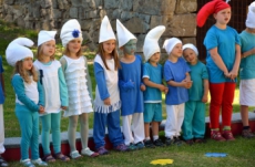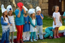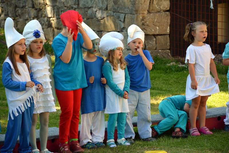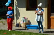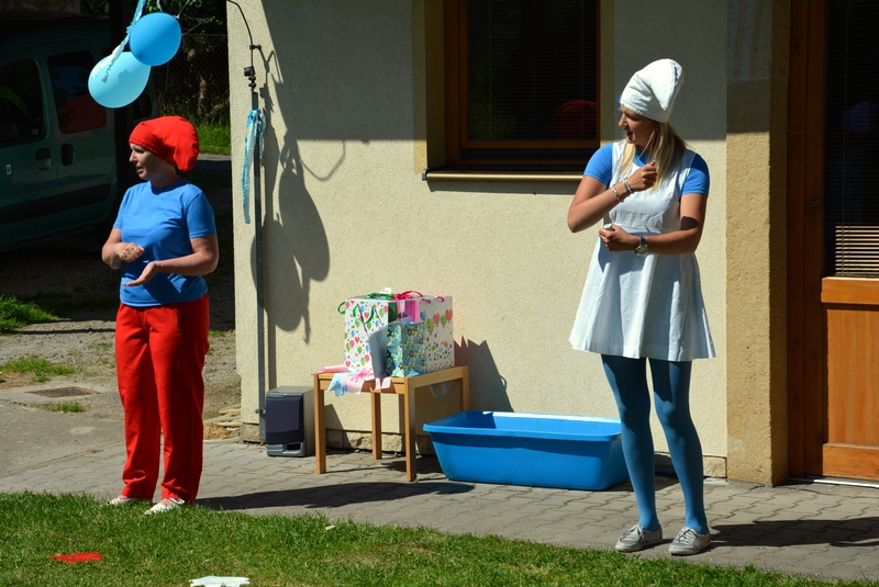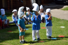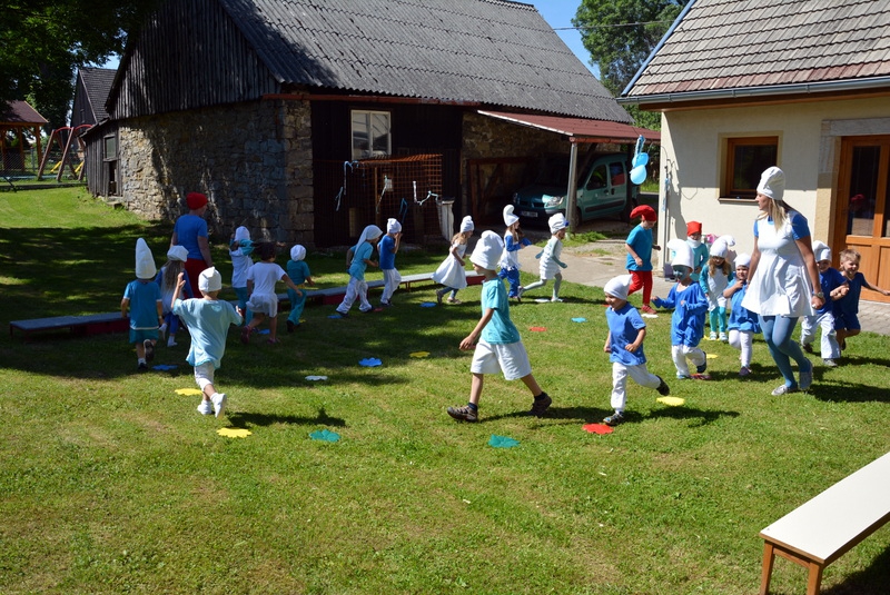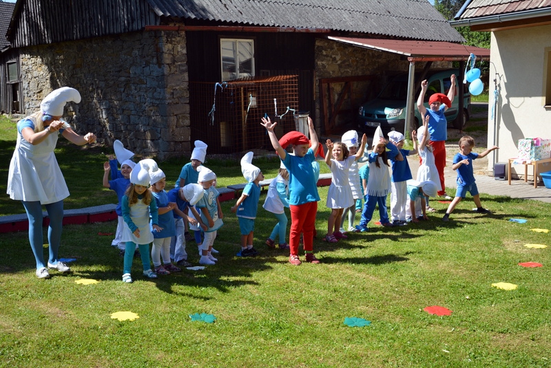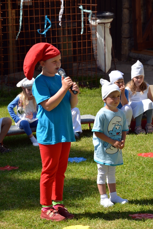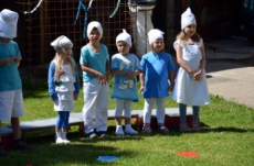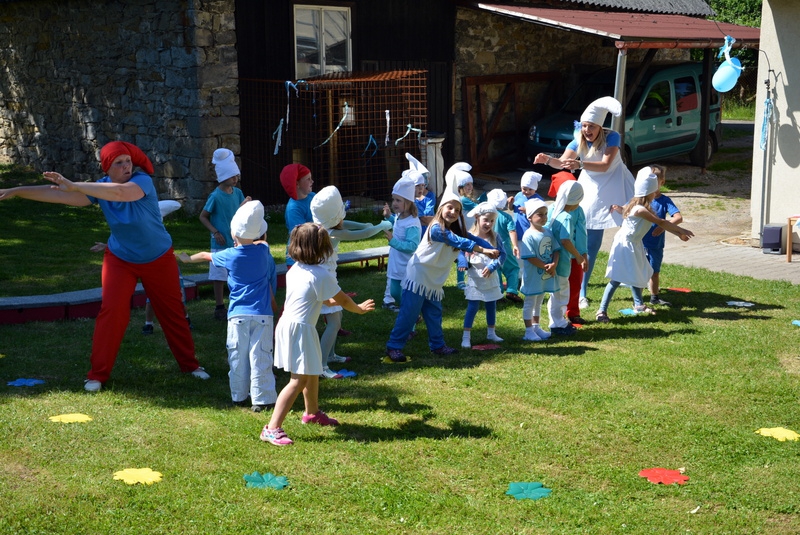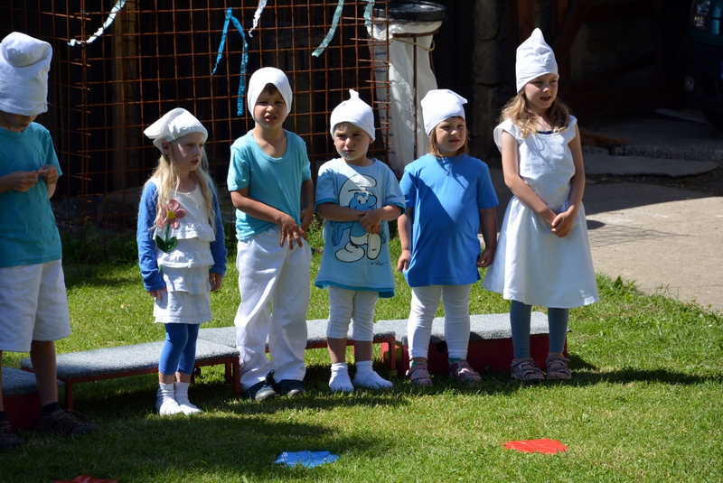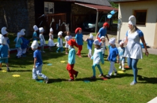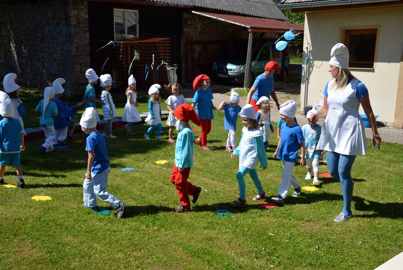 Všichni jsme se převlékli za šmoulíky a předvedli jsme rodičům spoustu básniček, písniček a tanečků. Nakonec jsme se rozloučili kytičkou, dárečky a šerpou s Rozálkou Šedkovou, Matyáškem Páslerem, Magdalénkou Jorovou, Tadeáškem Grumlíkem a Lucinkou Stodolovou. Po našem vystoupení na děti čekalo zasloužené překvapení – skákací hrad, který všem udělal velkou radost a děti si to moc užily! Rodiče jsme pozvali na kávu a maminky nám k tomu přinesly různé dobrůtky – sladké, slané, ovoce, zeleninu. Moc si toho vážíme a za všechno ještě jednou děkujeme!