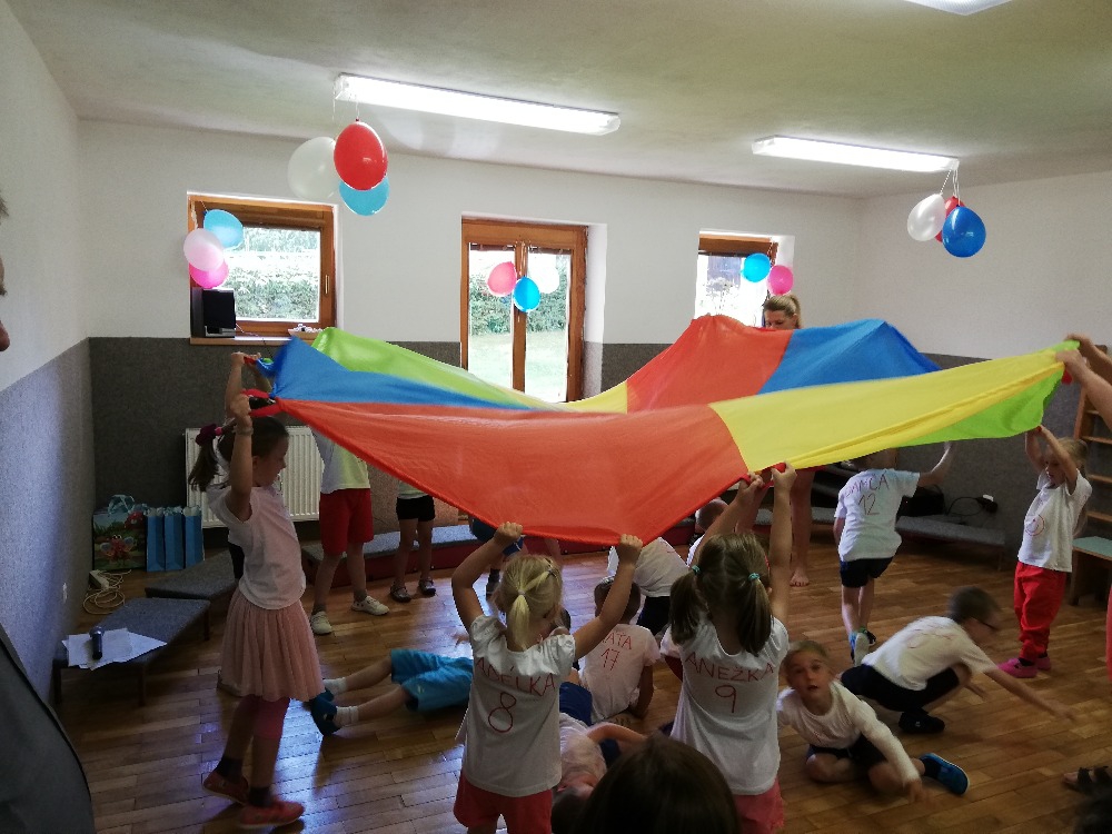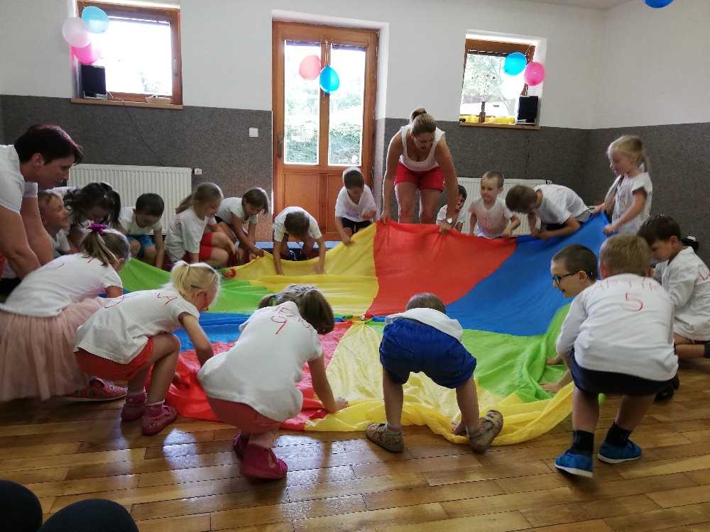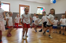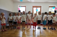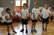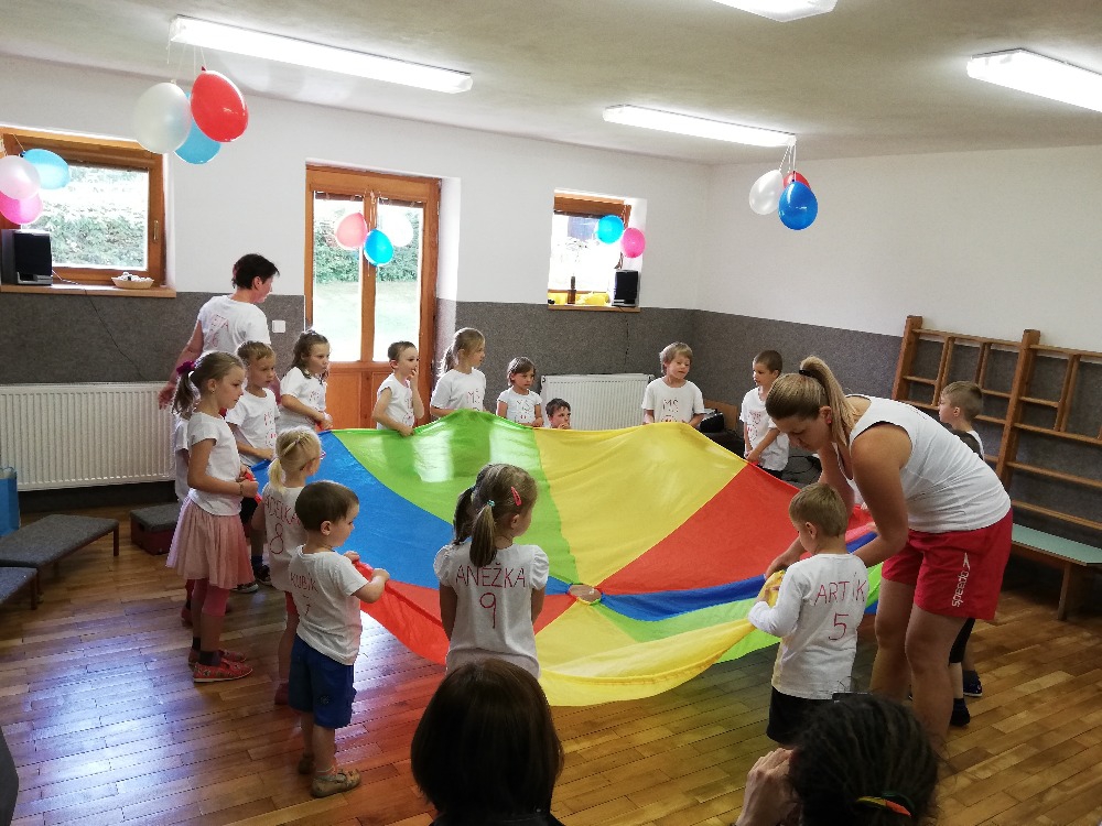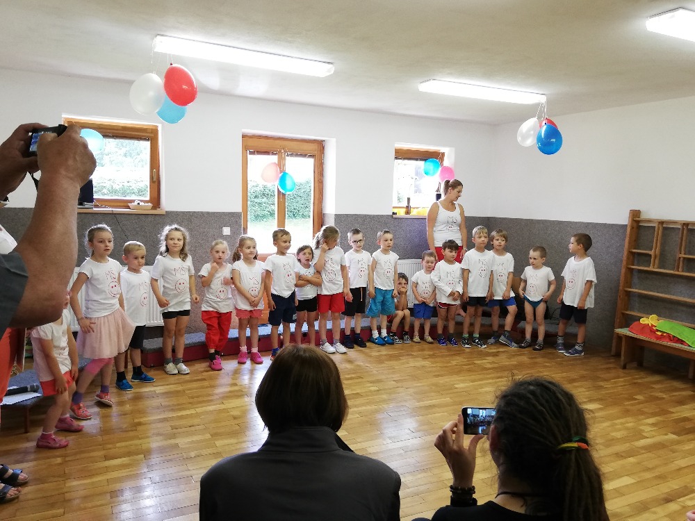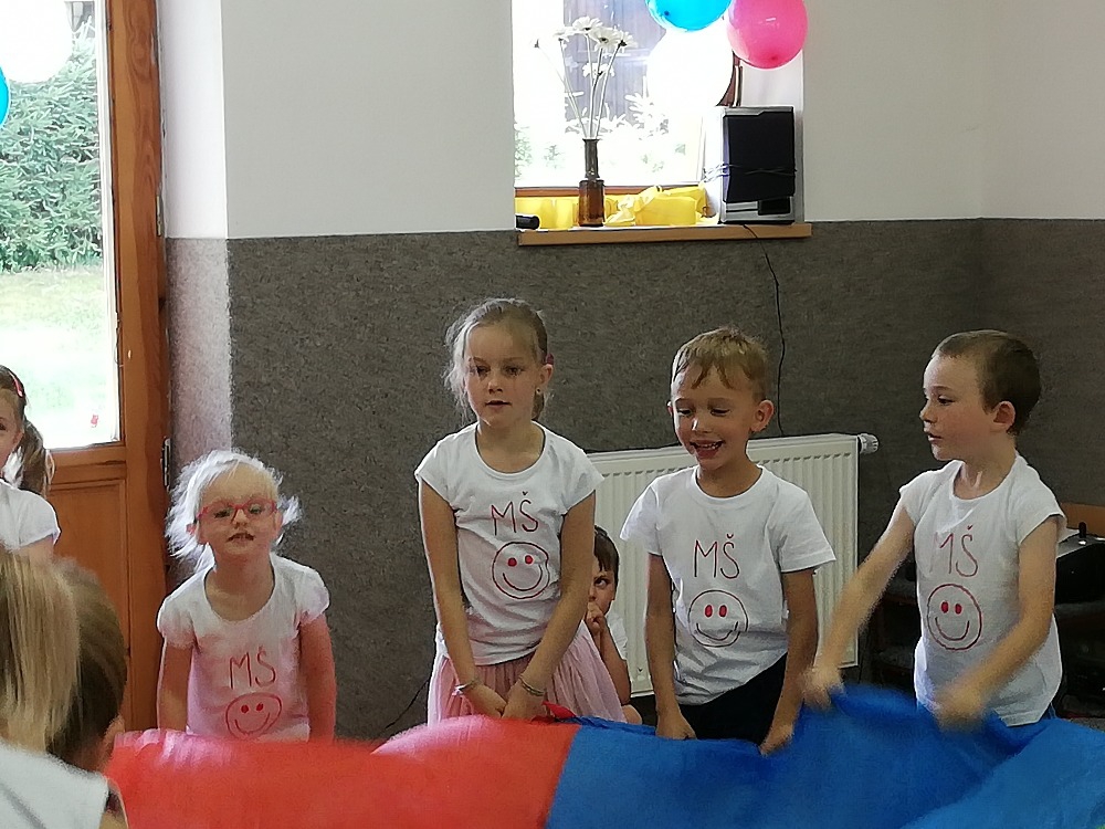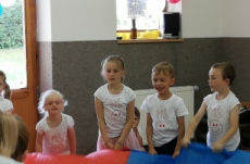 Vrátili jsme se do doby spartakiády – nastoupili jsme s písní Poupata. Říkanky a písničky byly ve sportovním duchu, zacvičili jsme si i s padákem. Na závěr jsme se rozloučili se šesti předškoláky, 5 dětí půjde do ZŠ Police nad Metují, 1 chlapec bude navštěvovat ZŠ Machov. Přejeme co nejúspěšnější start! Dětem popřál i pan starosta Friml.