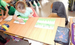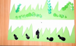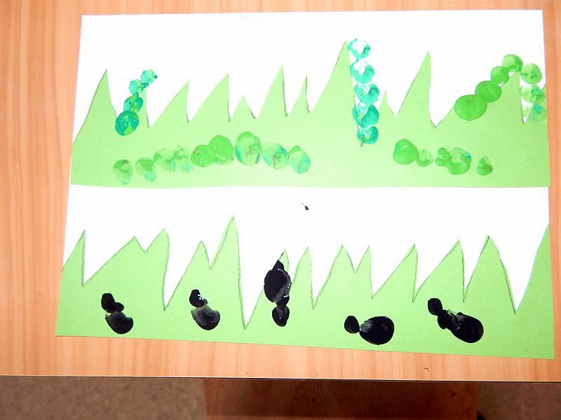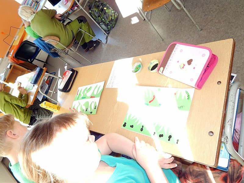 Úterý byl ZELENÝ DEN – zde jsme vyráběli trávu pomocí prstů, která byla plná housenek a človíčků, kteří si v ní zasportovali.