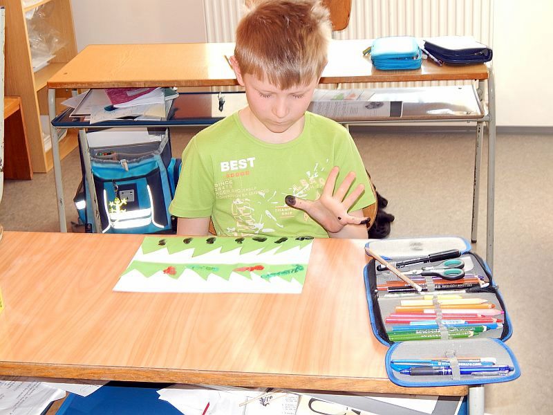 A pátek byl MODRÝ DEN – v rybníce plavaly rybičky, některé jsme mohli i foukáním vylovit z misky. Kytičkou byl modrý karafiát. Pak jsme si ještě vyrobili pampelišku, na kterou ve středu nebyl čas. Všechny květiny si žáci odnesli domů.