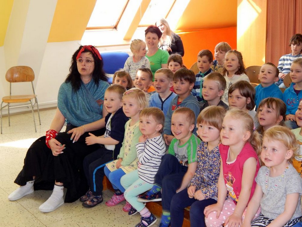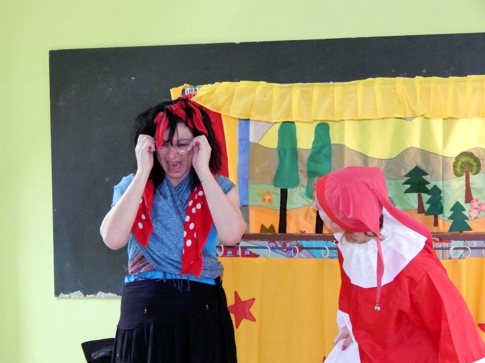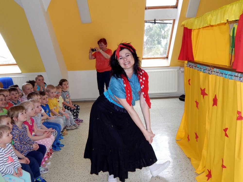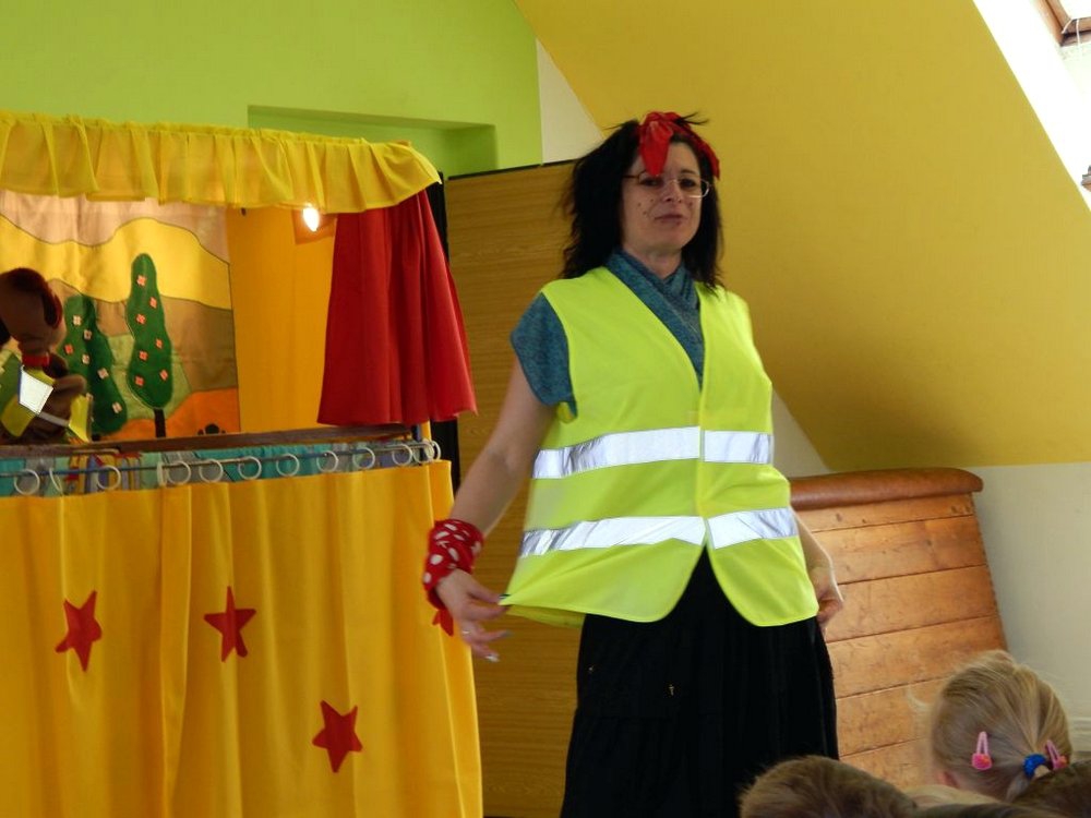 Ve středu 11.4. za námi přijelo divadlo Úsměv s pohádkou „Červená, stát!“. Čarodějnice při letu na koštěti měla nehodu, kdy se vyhýbala vráně a narazila do stromu.