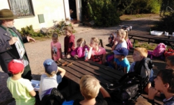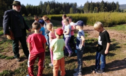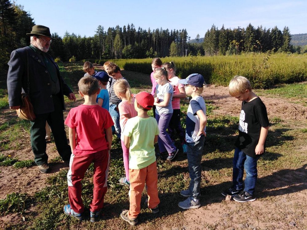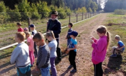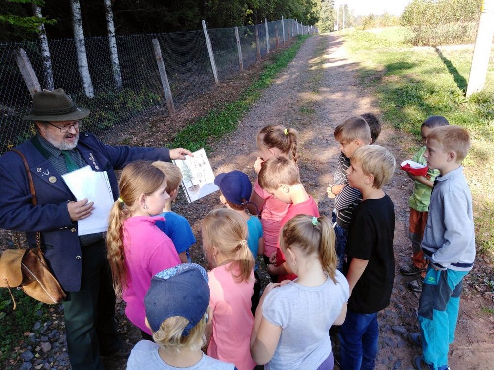 Zaměstnanci školky pro nás připravili milé uvítání v podobě čaje a sušenek. Přivítal nás pan Kubeček, který pracuje ve školce jako „školkař“. Na uvítanou nám zatroubil na lovecký roh a k tomu i krásně zazpíval, což se nám moc líbilo. Pak jsme si představili z čeho získáváme semínka stromečků, jaké známe šišky a podle čeho je poznáme.