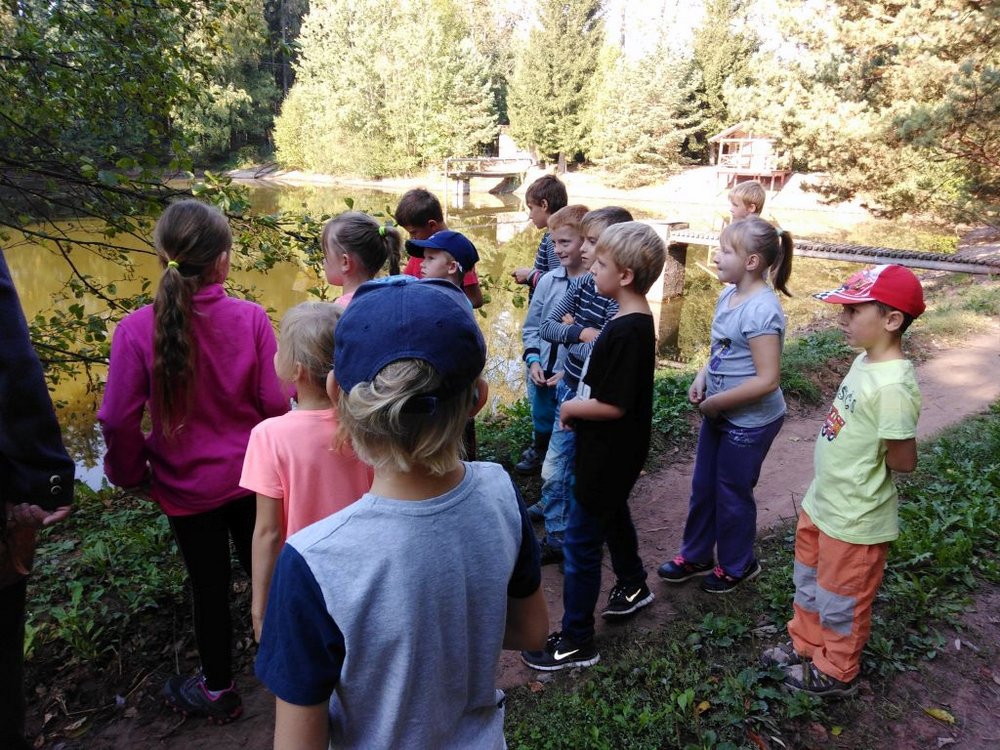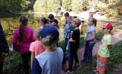 Prohlédli jsme si celý areál školky včetně rybníku, který úplně lákal k lenošení. Zkoušeli jsme rozeznávat různé listnaté a jehličnaté stromy podle listů, plodů , podle toho kde stromy rostou. Dozvěděli jsme se také mnoho zajímavostí o zvířatech, která můžeme v lese potkat, která lesu pomáhají a která mu naopak škodí.