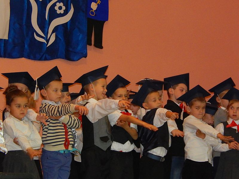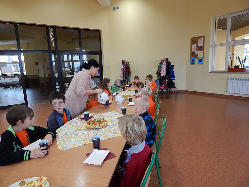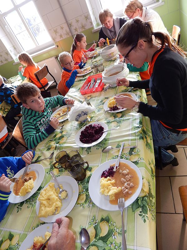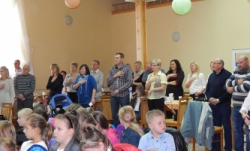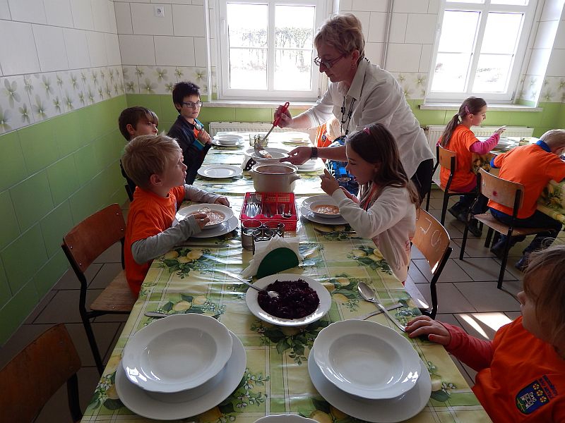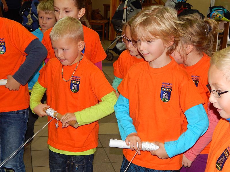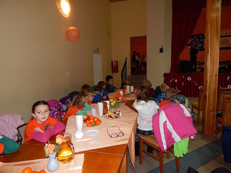 Pak děti z druhých a třetích tříd odešli zpět do školy, aby pokračovali ve výuce. A my společně s prvňáčky se začali bavit. Společně jsme si zatančili na tři písničky a pak jsme závodili v navíjení provázku, na jehož konci byl velký papírový bonbón. Po zábavě jsme se též přesunuli zpět do školy. Zde nás čekalo vystoupení děvčat, která navštěvují kroužek tanců a rytmiky. Tečkou za celou návštěvou byl velmi chutný oběd ve školní jídelně.