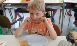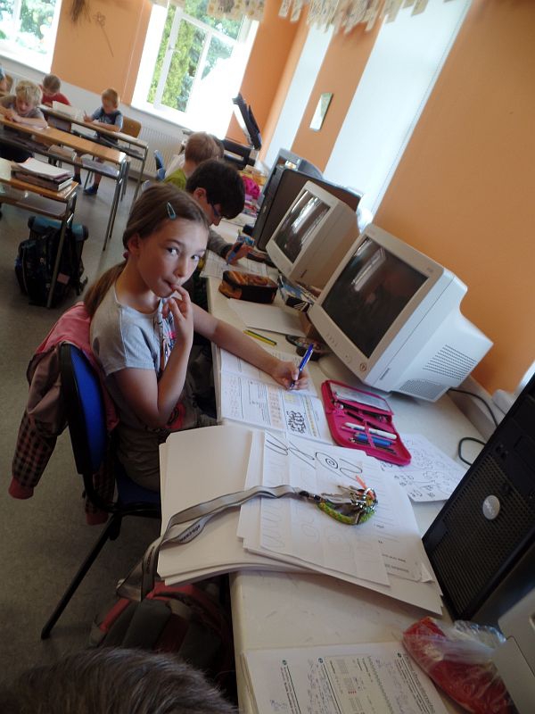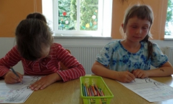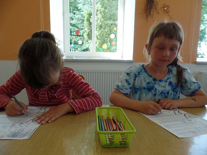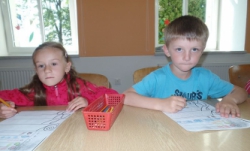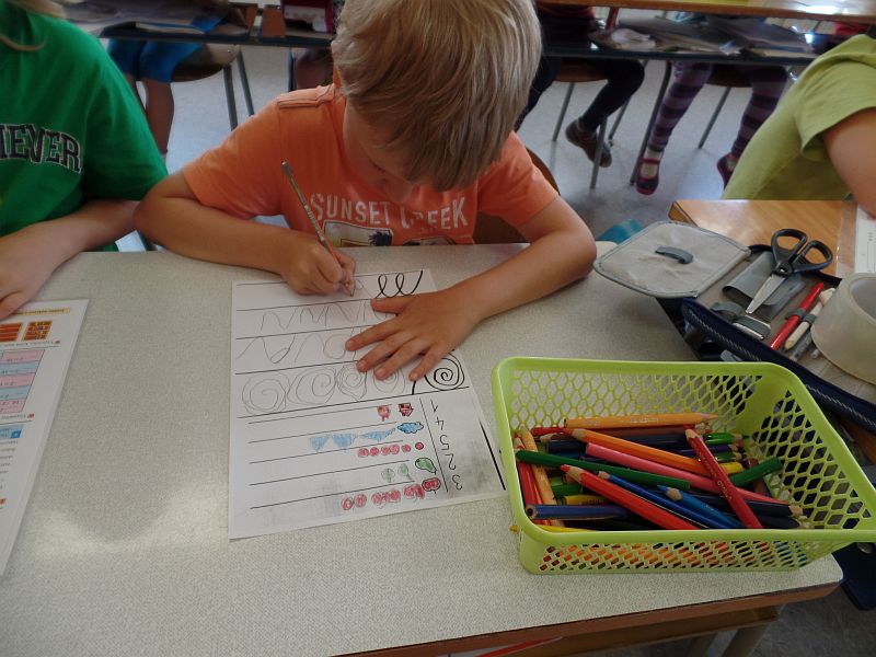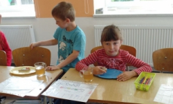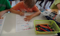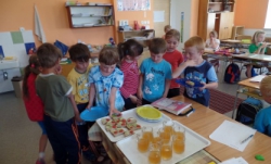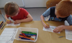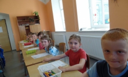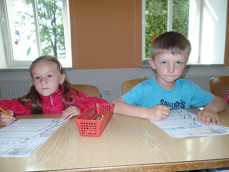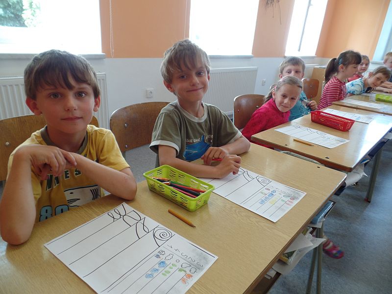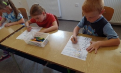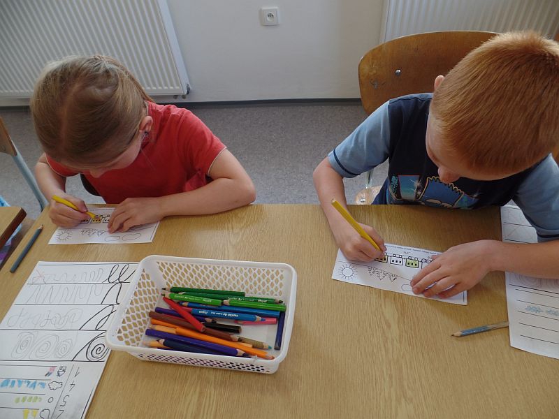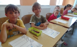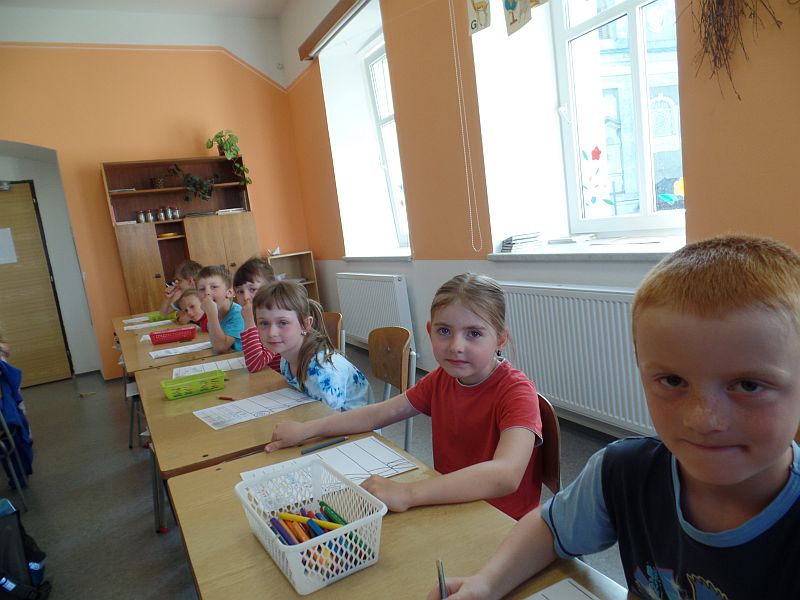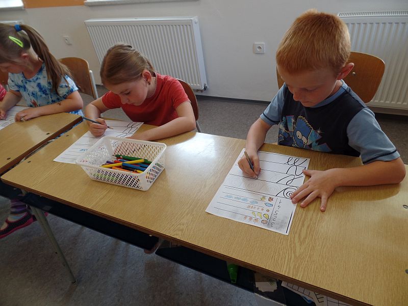 Při českém jazyce si vyzkoušeli tleskat slabiky ve slovech, vyhledali písmenko, kterým začíná jejich jméno a pak písmenka, kterými začínala jména jejich kamarádů. Malovali správný počet prvků, vybarvovali vagonek u vlaku podle zadání. Poslední zkouškou bylo několik psacích tvarů.