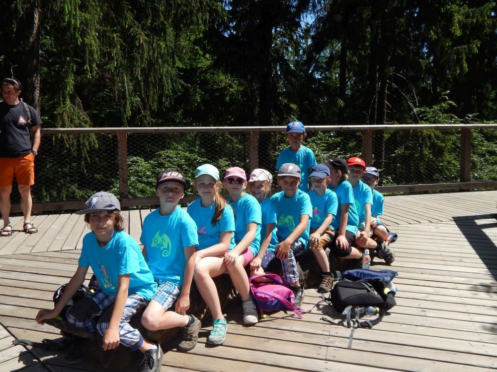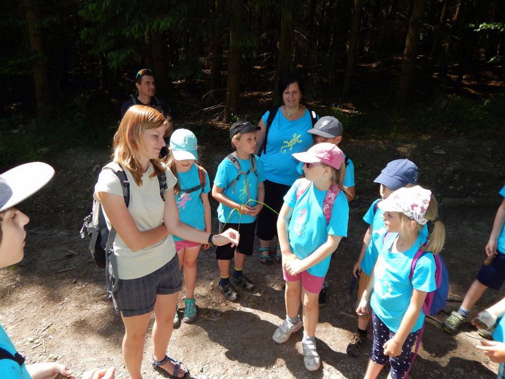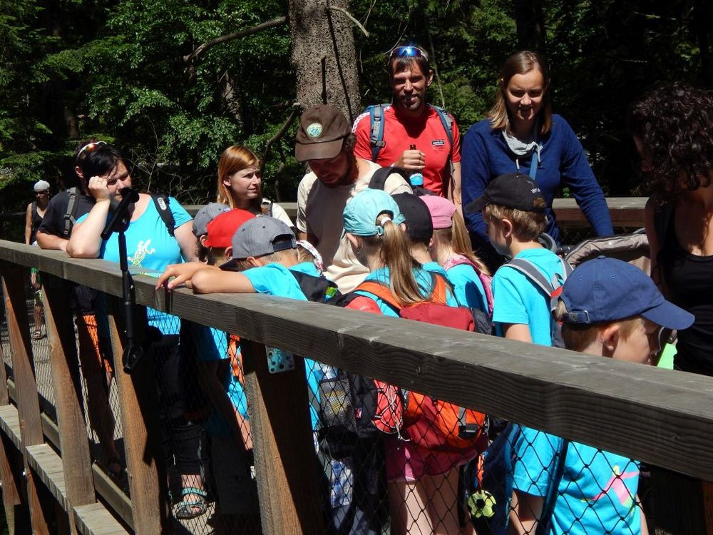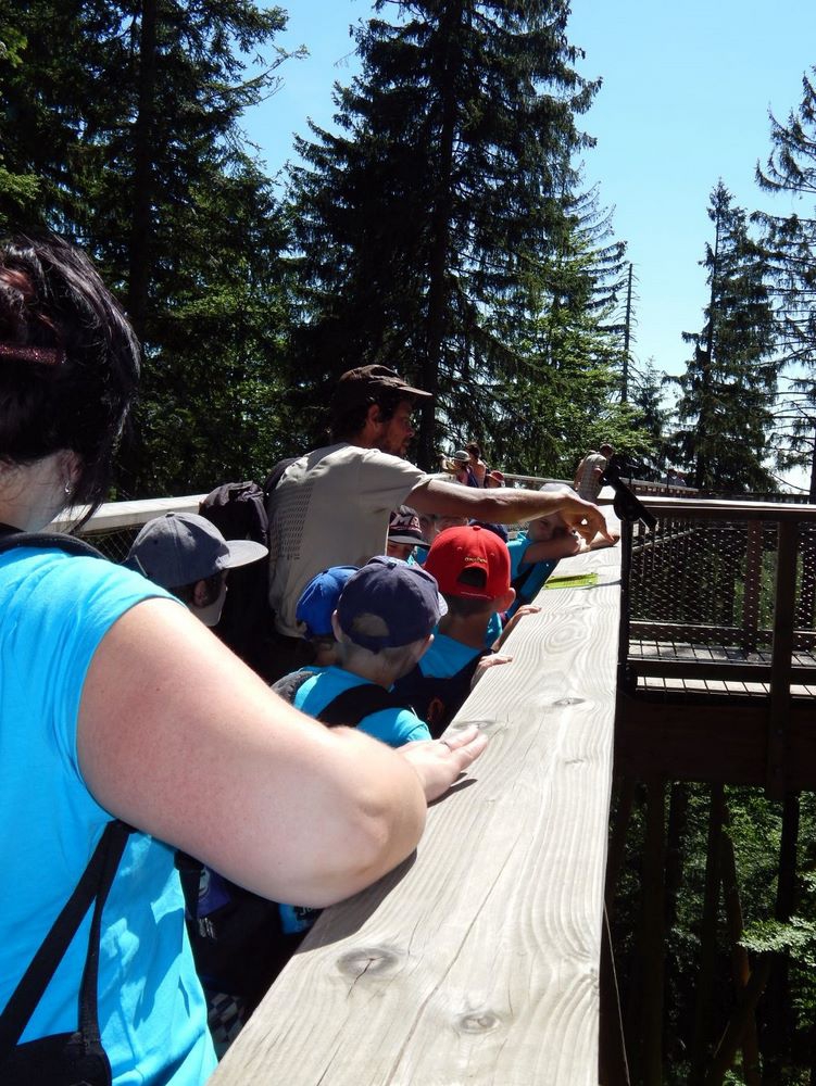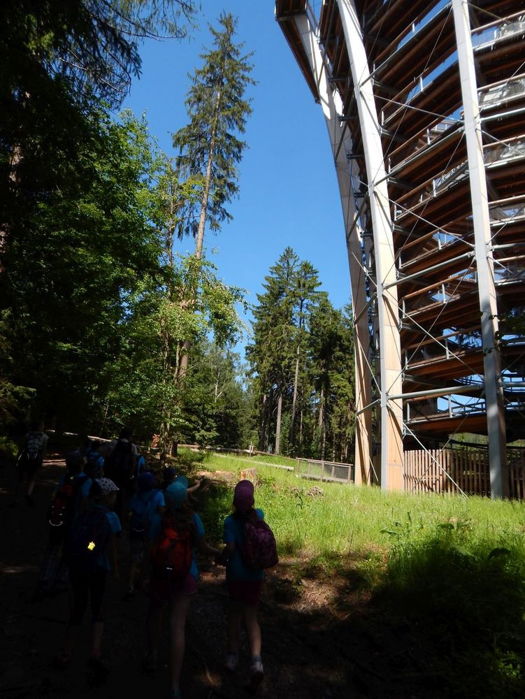 Procházka začala u dolní stanice lanovky na Černou horu. Po seznámení představení jsme vyšli značenou cestou ke Stezce. Cestou jsme pozorovali brouky, rostliny, larvy, poslouchali zpěv ptáků a snažili se odpovědět na otázky pana lektora. Ten nám sděloval velmi zajímavé informace. Dozvěděli jsme se spoustu zajímavostí o lese i jeho obyvatelích, hledali jsme vyklíčená semínka jedlí, ukázal nám, jak vypadá larva kůrovce i samotný kůrovec. Objevili jsme i první houby. Společně jsme došli ke vchodu na Stezku korunami stromů a při stoupání po jejich cestičkách jsme měli možnost si ověřit, co jsme si z pozorování v lese zapamatovali. Na vrcholu Stezky jsme ještě využili interaktivní hodiny se zvuky našich ptáků. Pak již se s námi pan Tlakač rozloučil.