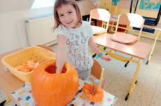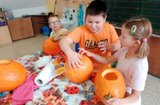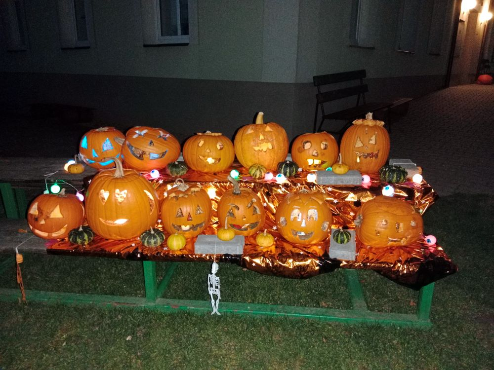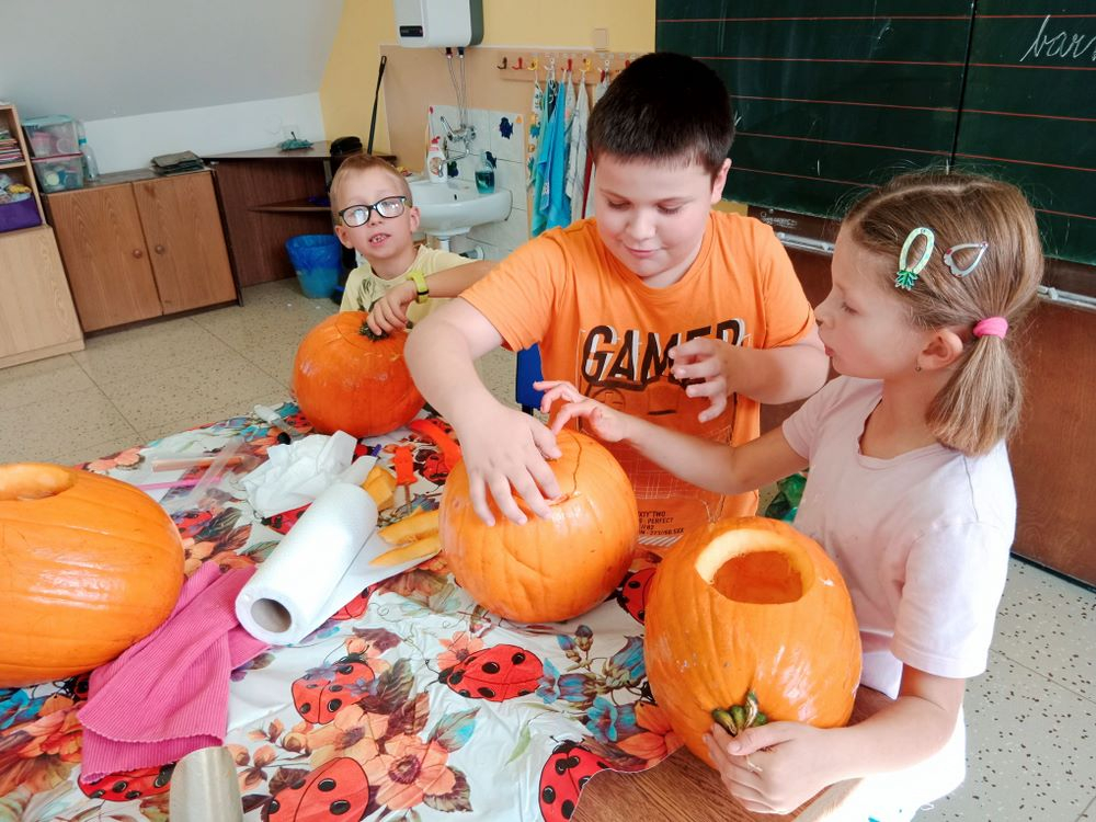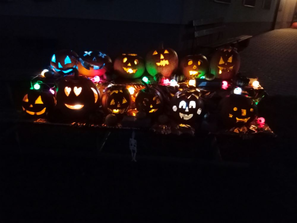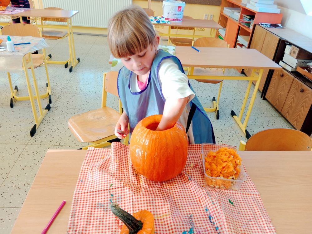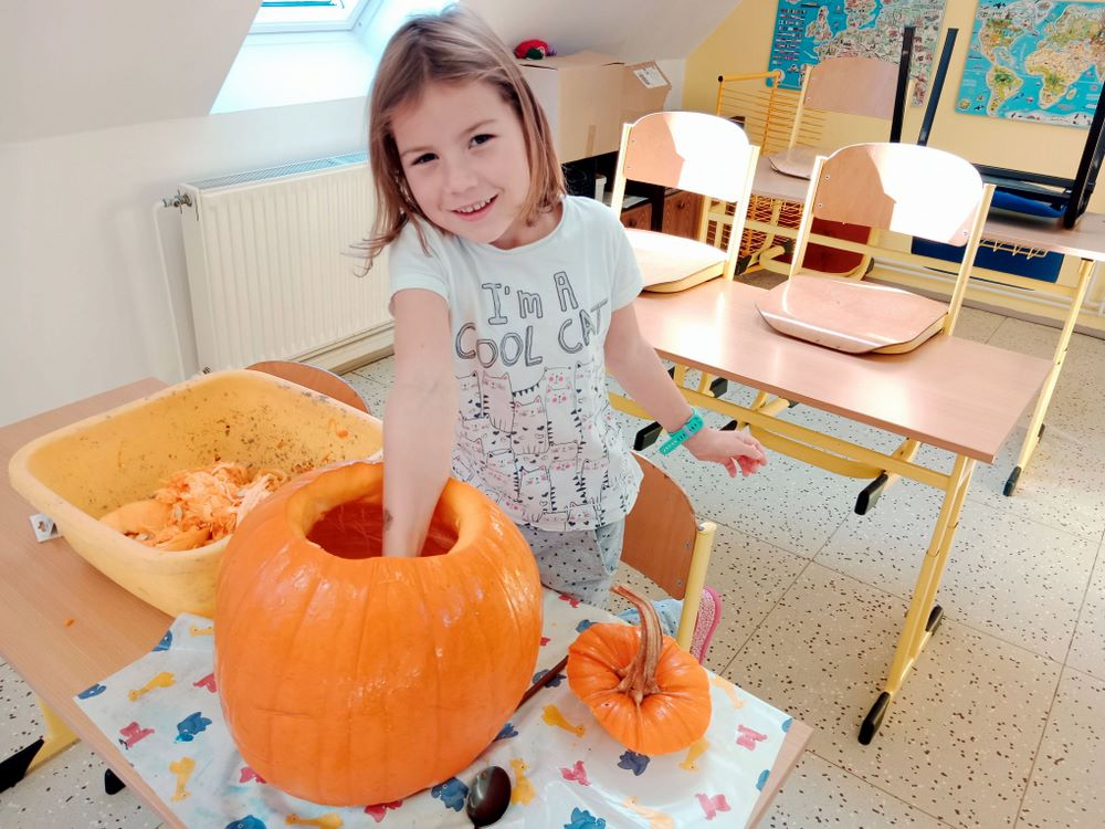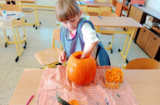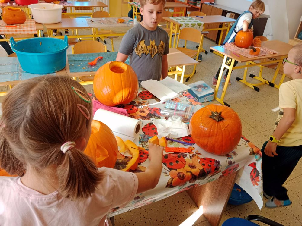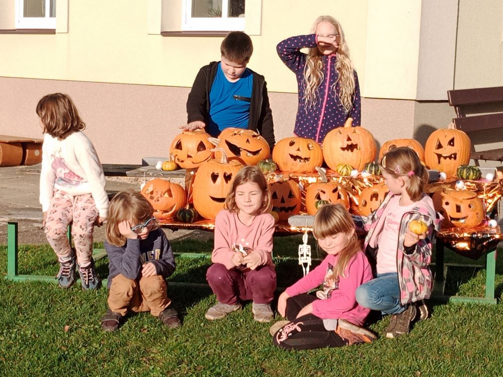 Již několik dní před podzimními prázdninami jsme se začali připravovat na oslavu svátku Halloween. Jako každým rokem jsme společně vydlabali a vyřezali každý svou dýni. Ty jsme potom vystavili venku před školou, aby nám všem mohli po setmění dělat radost.