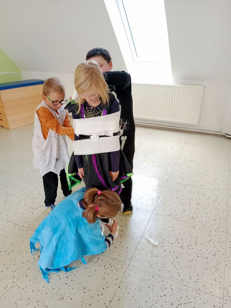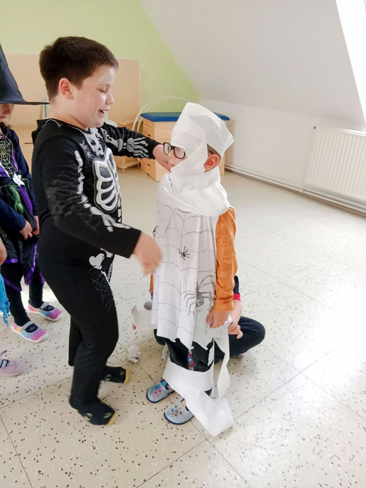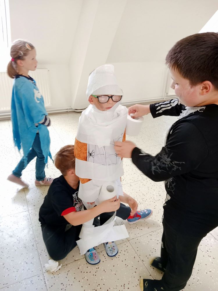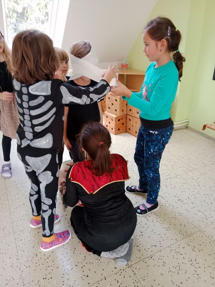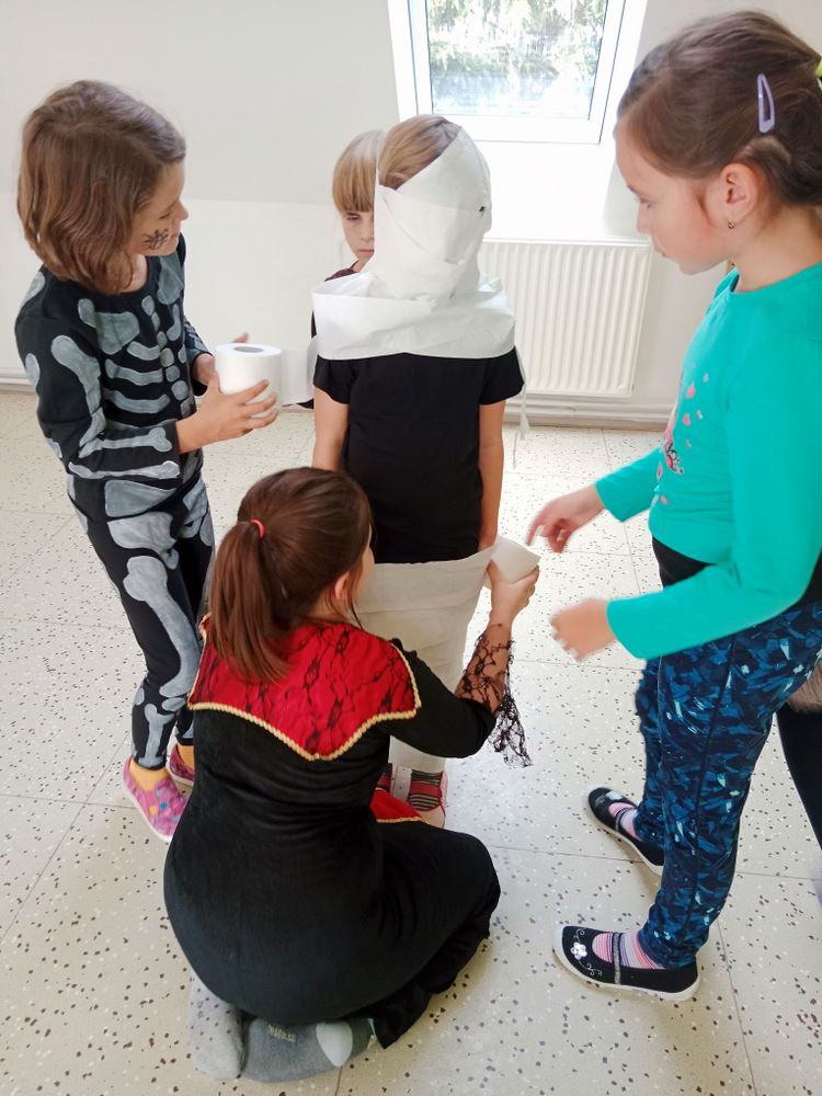 Nejdříve jsme si zahráli několik soutěží – házeli jsme netopýrem i pavouky, závodili ve foukání okem na rychlost, zahráli jsme si na „mumie“, kdy jsme pomocí toaletního papíru měli za úkol co nejlépe a nejrychleji omotat spolužáka jako mumii.