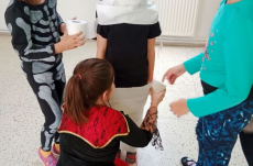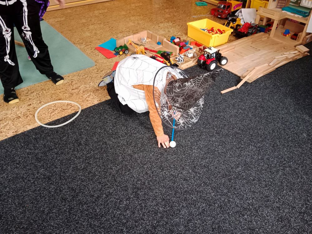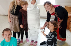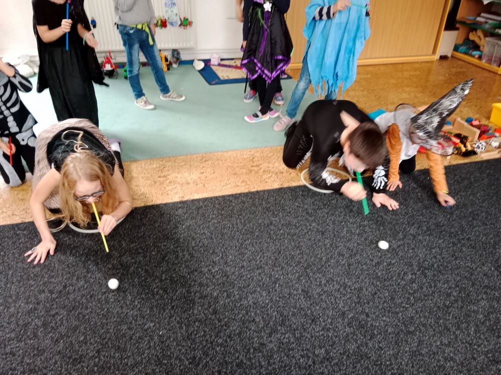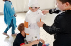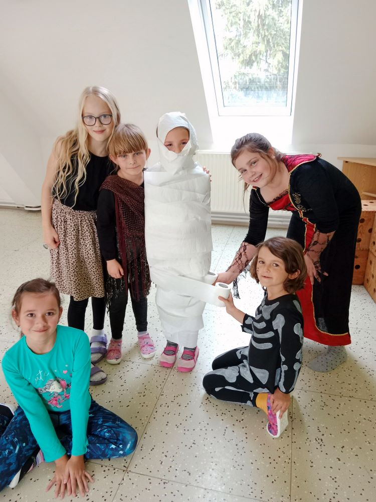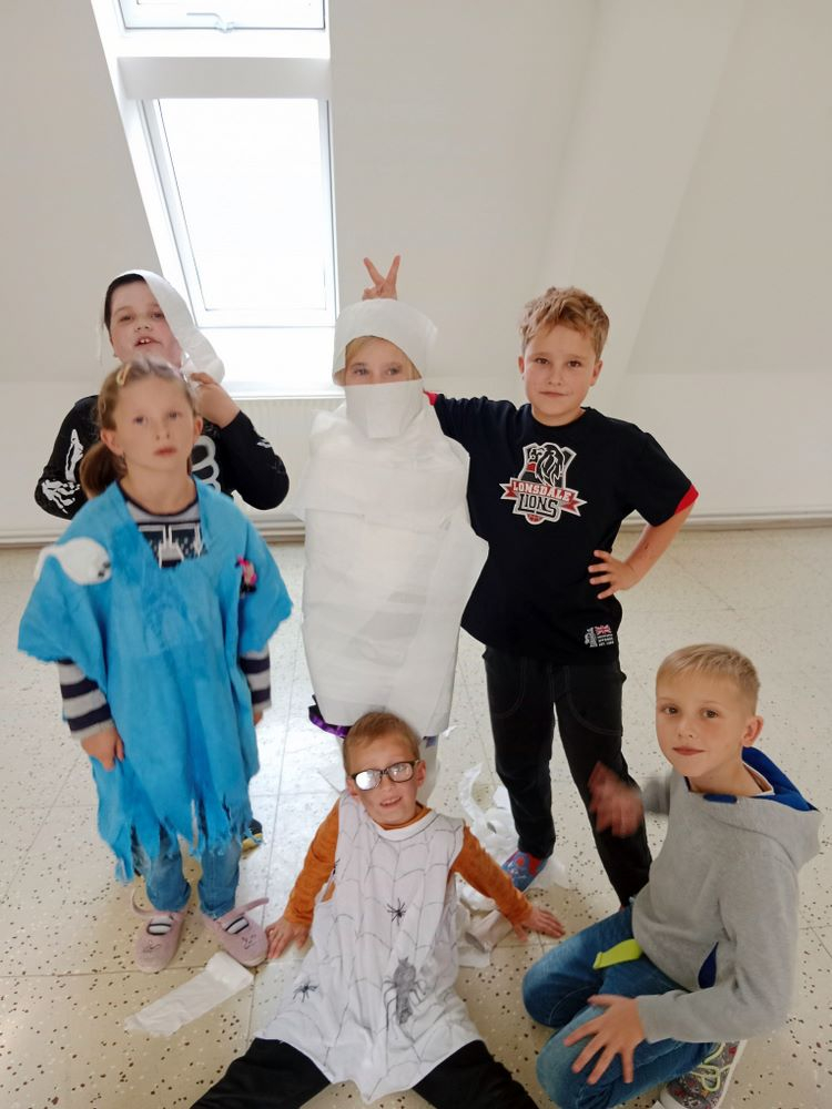 Nejdříve jsme si zahráli několik soutěží – házeli jsme netopýrem i pavouky, závodili ve foukání okem na rychlost, zahráli jsme si na „mumie“, kdy jsme pomocí toaletního papíru měli za úkol co nejlépe a nejrychleji omotat spolužáka jako mumii.