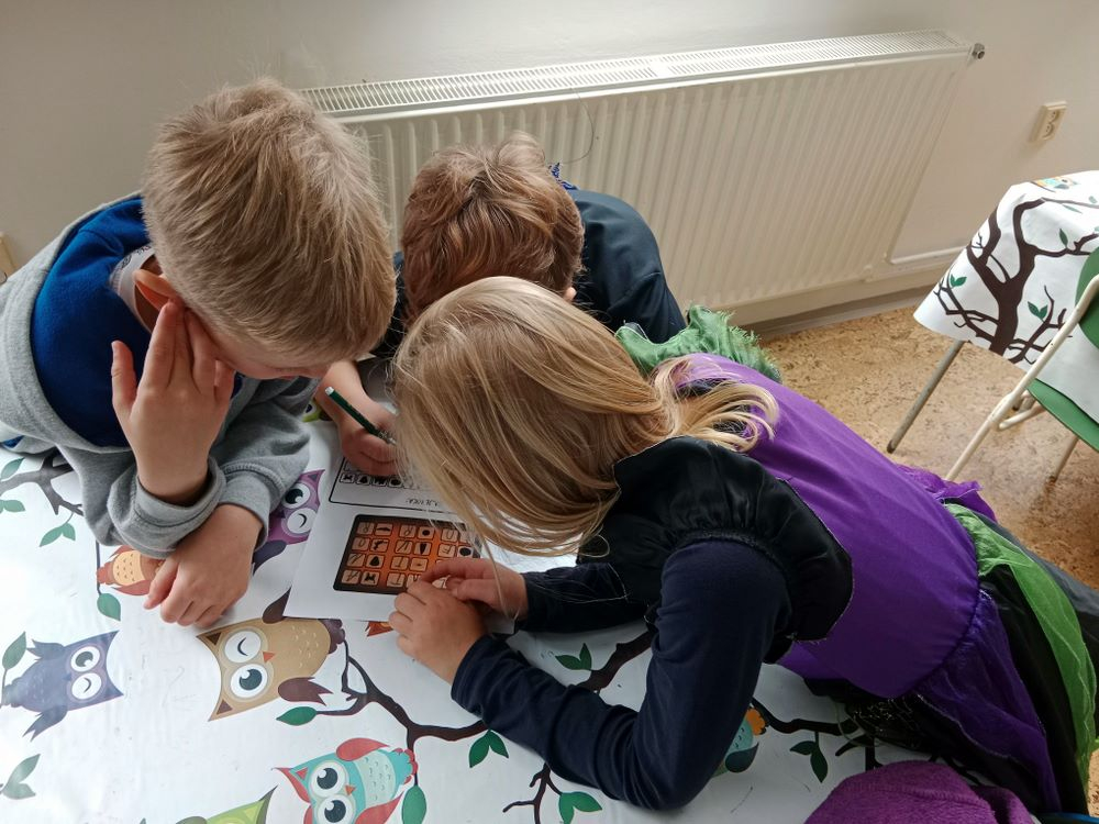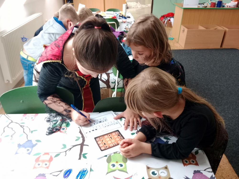 Na závěr jsme si zahráli halloweenskou bojovku, plnili jsme strašidelné úkoly na kartičkách, které byly rozmístěné po celé družině i tělocvičně. Všichni dokázali správně vyluštit tajenku, která zněla „Strašidelná cesta“. Posledním úkolem bylo najít ukrytý poklad. To se nakonec podařilo a tak si každý vysloužil něco dobrého na zub, strašidelný přívěšek na klíče a svítící náramky. Moc jsme se pobavili a celé odpoledne jsme si užili.