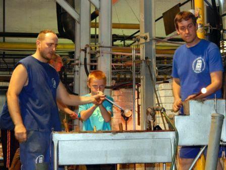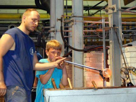 Poté jsme měli možnost si každý vlastnoručně vyzkoušet foukání skla. Věnoval se nám sklářský mistr, který vždy každému žákovi nabral odpovídající množství skloviny, vytlačil ji do formy, aby vznikl jednoduchý vzor na skle a pak už jsme jeden po druhém zkoušeli jak složité je vyfouknout sklářskou píšťalou co nejpravidelnější skleněnou kouli. Při foukání do píšťaly je třeba neustále píšťalou otáčet, aby se sklo vyfukovalo pravidelně. Námi vyrobené skleněné výrobky nechali skláři vychladnout a poté nám je připravili, abychom si je mohli všichni odnést domů a pochlubit se, co jsme dokázali.