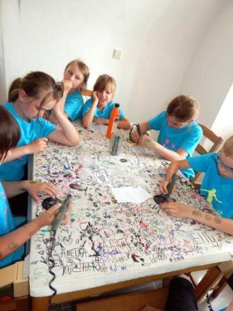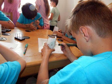 Práce se sklem nás natolik zaujala, že jsme se rozhodli naše zkušenosti ze sklářského umění ještě rozšířit a na pondělí 24. 6. jsme získali možnost navštívit brusičskou dílnu na Bezděkově, kde se brousí sklo na tradiční i moderní vzory a pískují nápisy a obrázky na sklo. Vše jsme si opět mohli sami vyzkoušet a naše sklenice, které jsme si namalovali ve sklárně v Harrachově si doplnili ještě o vlastnoručně napískovaná jména.