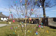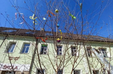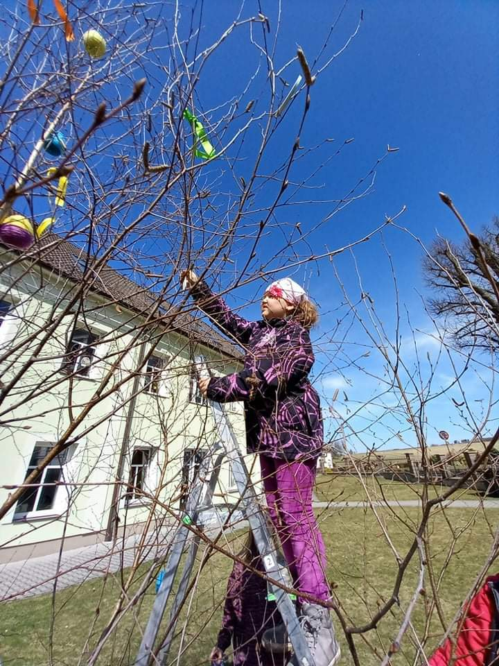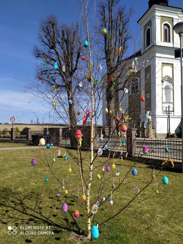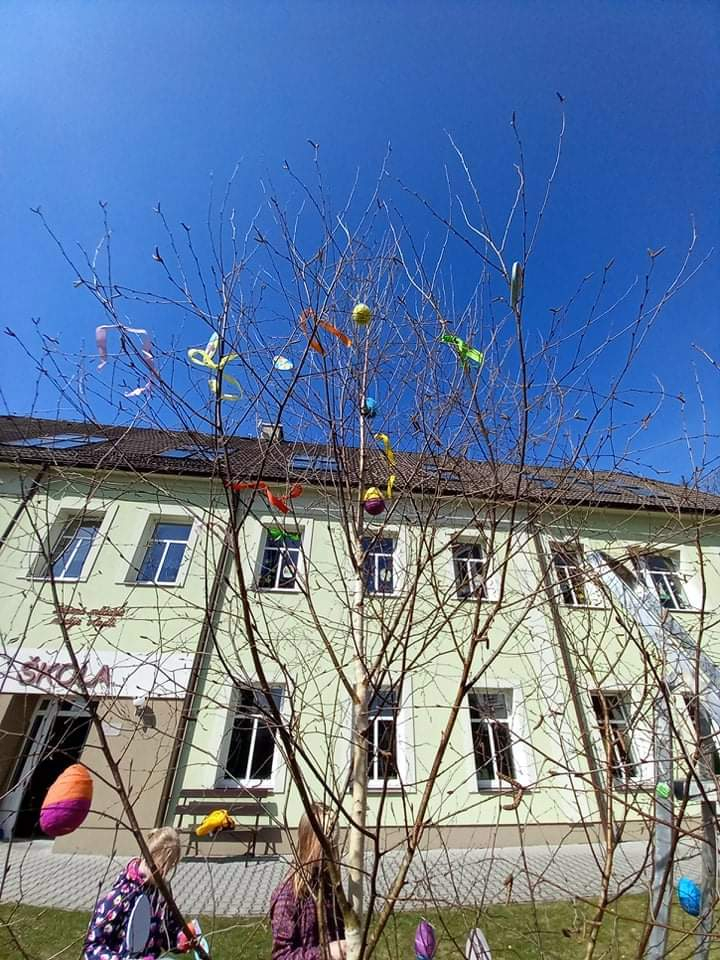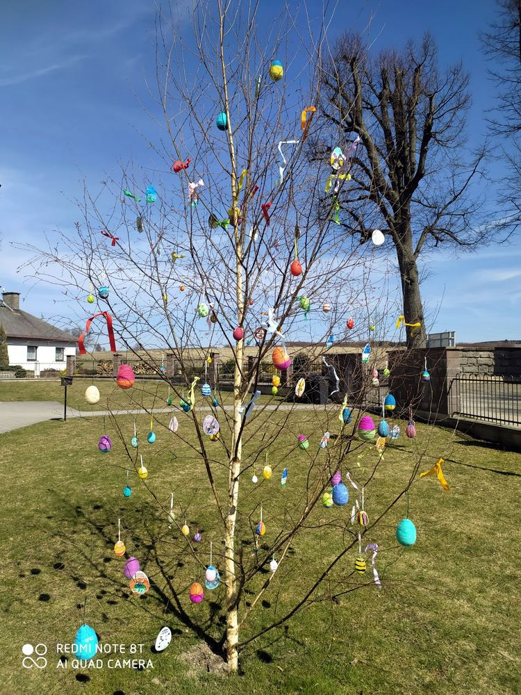 V pondělí před Velikonocemi jsme všichni společně ozdobili vyrobenými kraslicemi a barevnými stuhami břízku, kterou nám stejně jako vloni připravil pan školník.