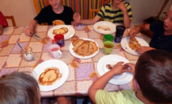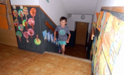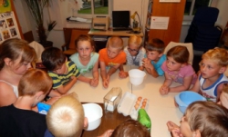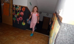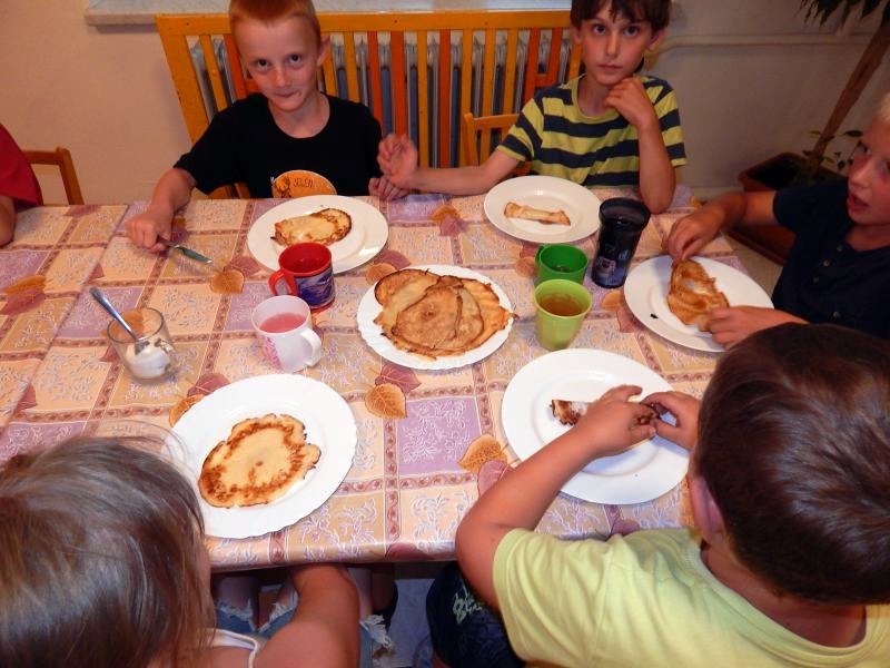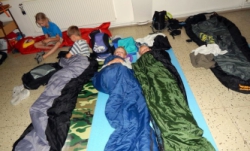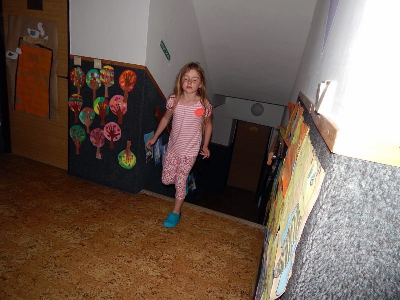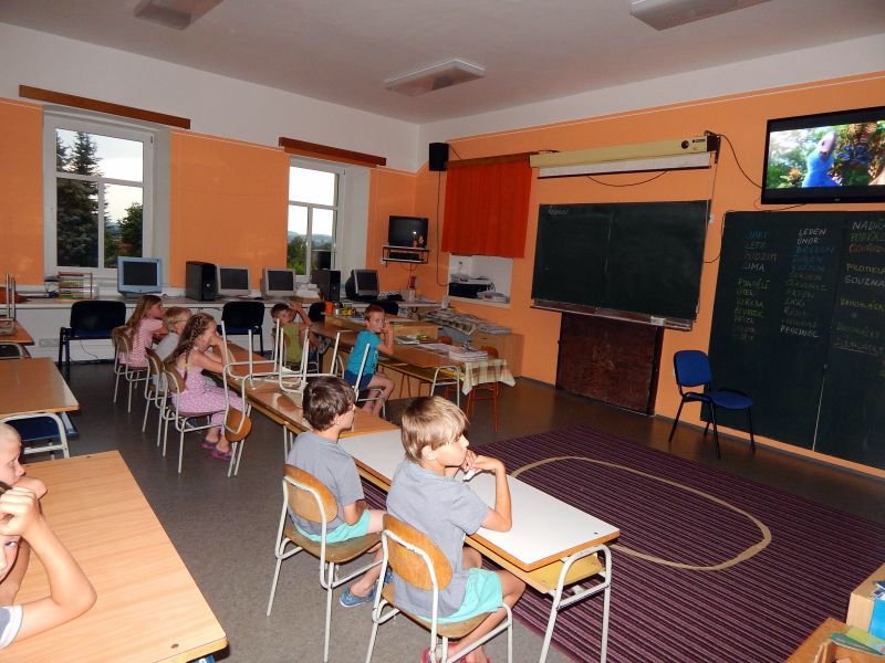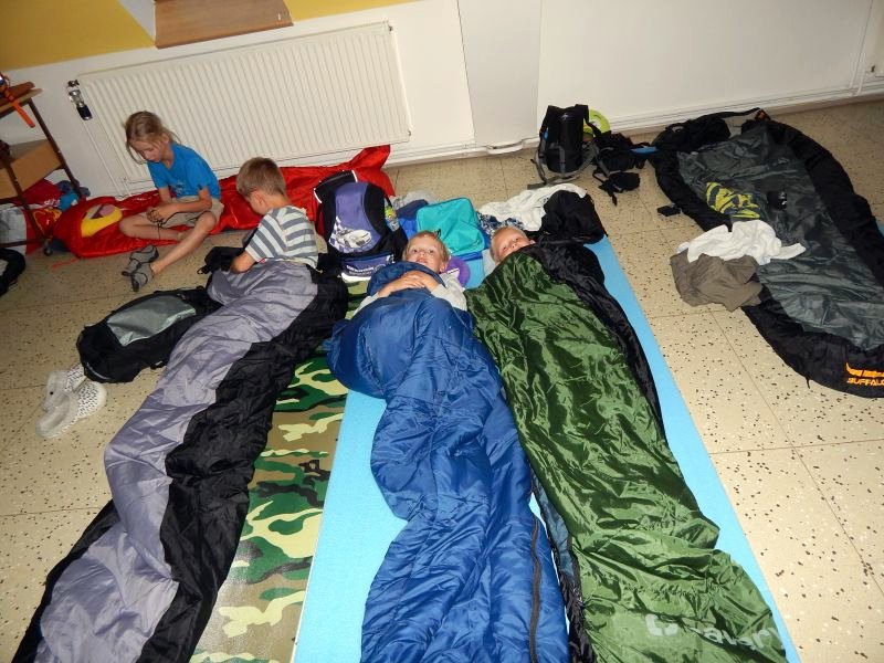 Pak nás ale čekala další akce. Místo domů k maminkách jsme šli do školy, kde jsme si nejprve připravili večeři – pekli jsme palačinky, pak si nachystali pelíšky na spaní, podívali se na film o papouškovi Rio a šli spát. Všichni jsme usnuli celkem rychle. Přes velkou únavu jsme ale o půlnoci vstali, abychom se zúčastnili „Stezky odvahy“. Protože venku pršelo a blýskalo se, byla stezka vedena po budově školy. Přestože jsme se někteří i trochu báli, zvládli jsme ji všichni. Cestou zpět nám na rtech hrál úsměv, zjistili jsme, že se opravdu nebylo čeho bát. A pak jsme již pokračovali ve spánku. Nejrannější ptáčci vstávali již v 5.30 hodin. Když jsme se všichni probudili, dali jsme si snídani a pak jsme den trávili ve třídě úklidovými pracemi. Před obědem jsme se šli projít po vesnici.