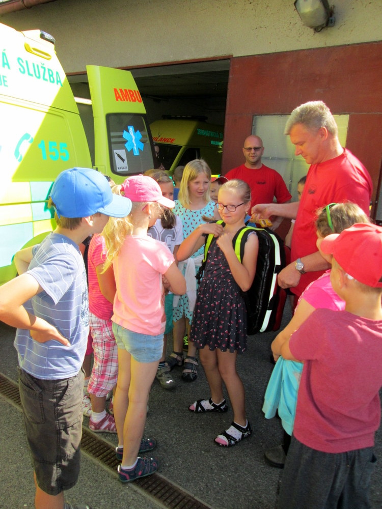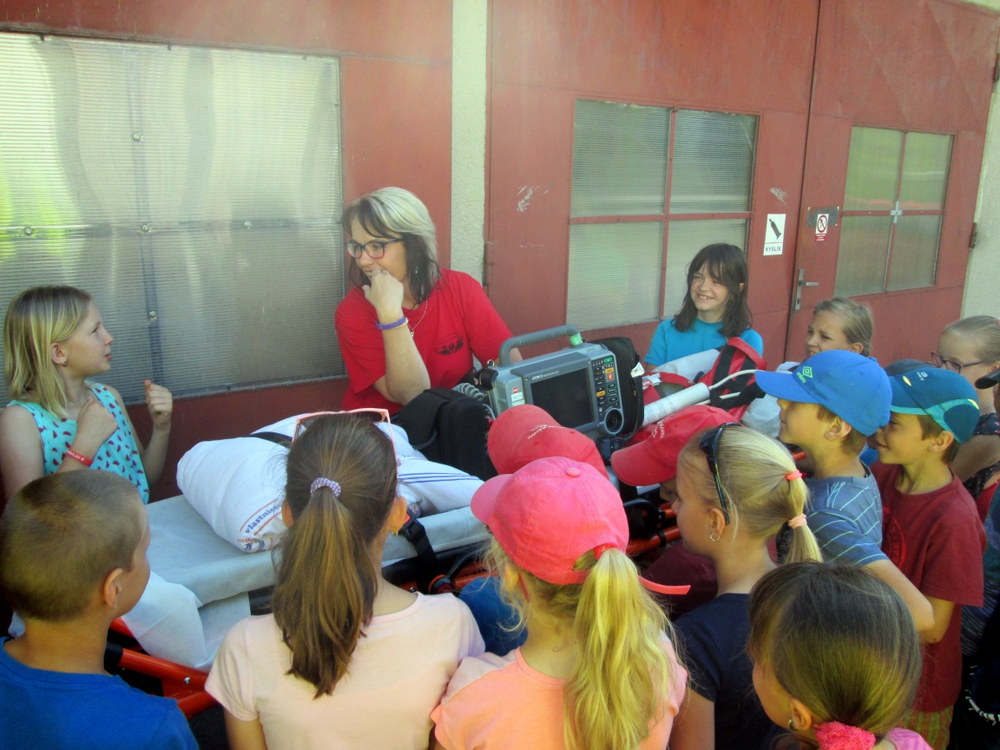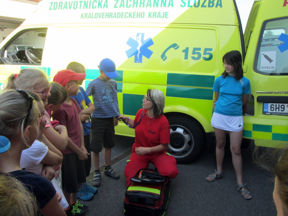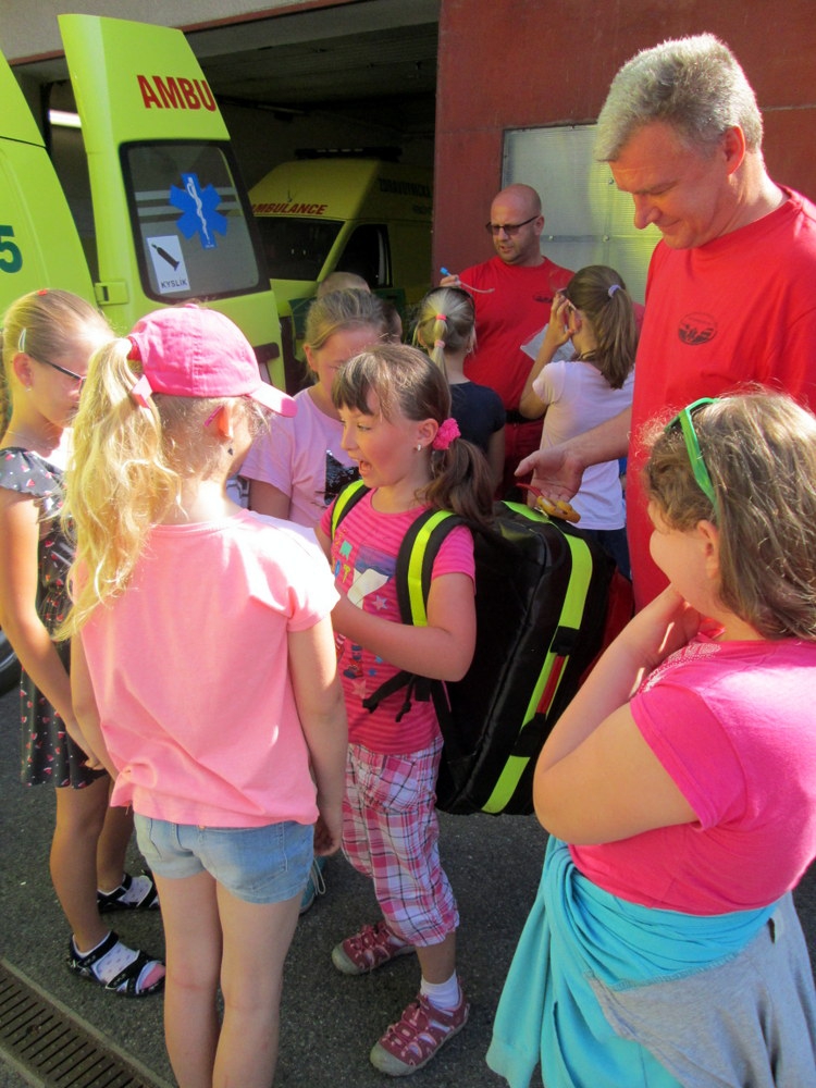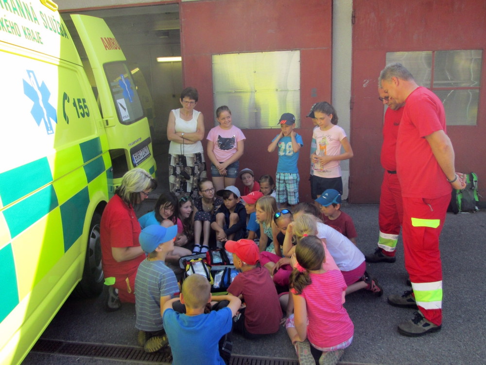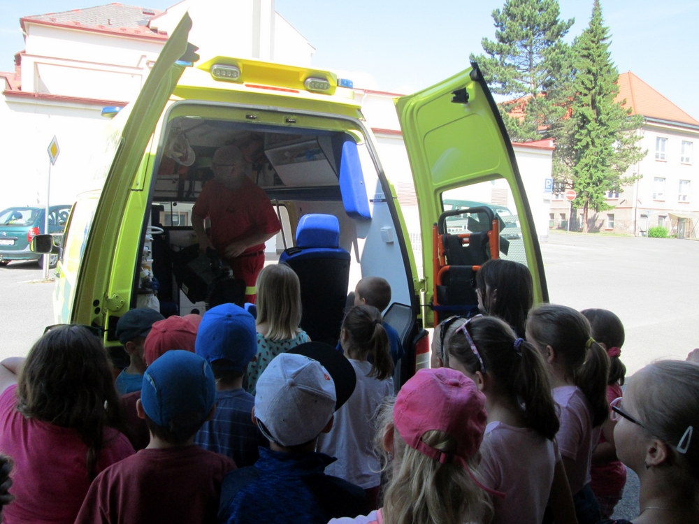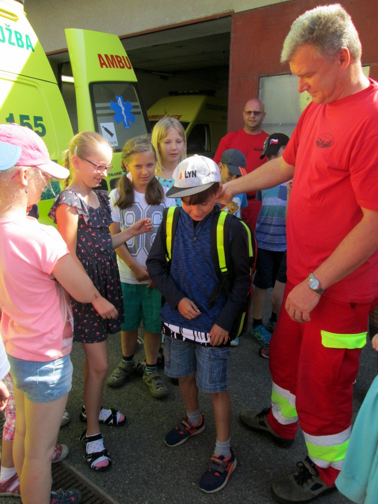 Zde nám záchranáři ukázali, s jakými pomůckami v terénu pracují, potěžkali jsme si jejich kombinovanou brašnu/batoh (2 v 1 J) se zdravotnickými potřebami, které berou s sebou na výjezdy a někteří žáci se nad tíhou až divili J…. Pan záchranář nám ukázal vybavení auta i téměř všechny důležité přístroje, vysvětlil nám, jak fungují a dokonce si někteří žáci mohli na vlastní kůži vyzkoušet, jaké to je ležet na lehátku a nechat si změřit své srdíčko, jak se ošetřují zlomené ruce apod… J. Také jsme byli svědkem zkoušky spojení s dispečinkem z Hradce Králové a nejenom to – dokonce jsme zažili i přímý výjezd jedné posádky záchranného auta. Exkurze nás všechny obohatila vědomostmi a všem záchranářům za zajímavé povídání moc děkujeme. . . . .