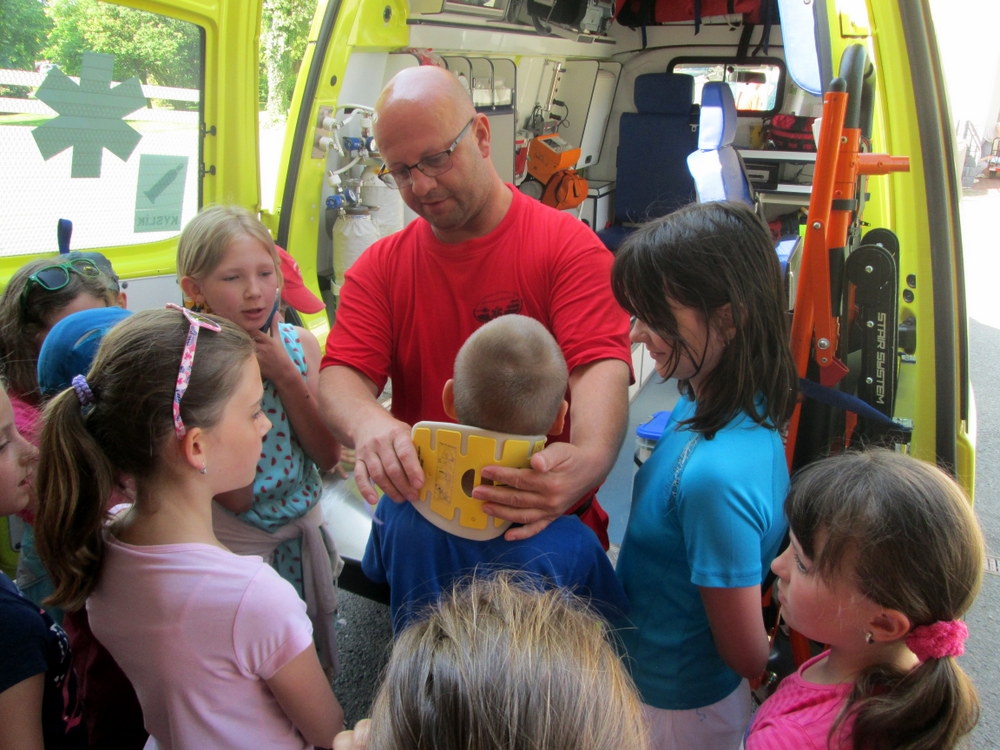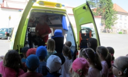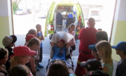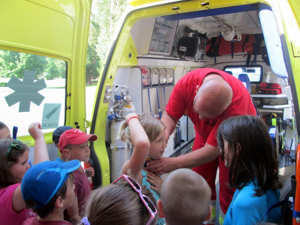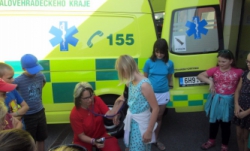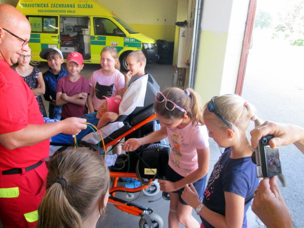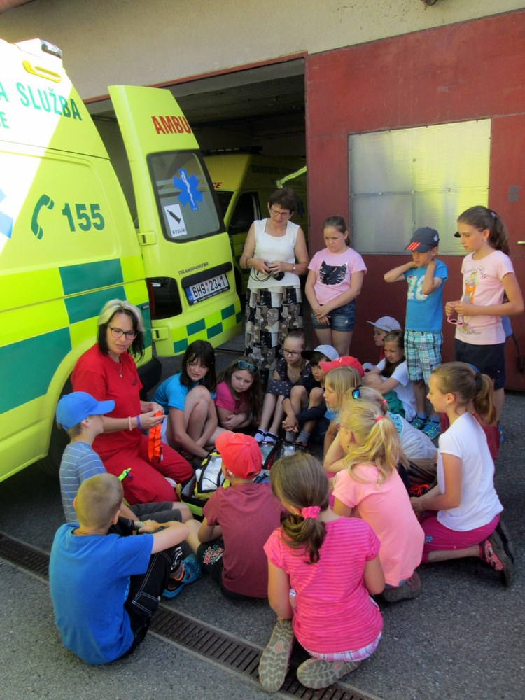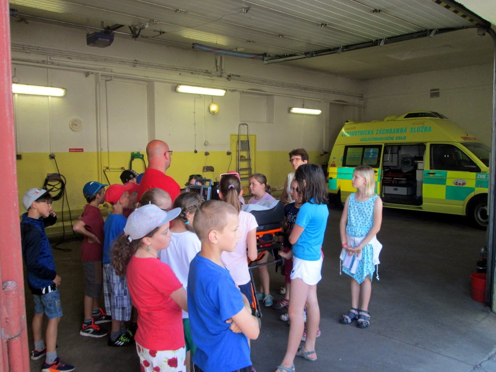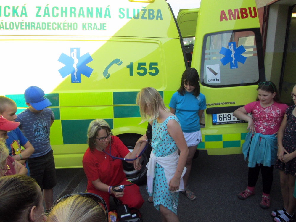 Zde nám záchranáři ukázali, s jakými pomůckami v terénu pracují, potěžkali jsme si jejich kombinovanou brašnu/batoh (2 v 1 J) se zdravotnickými potřebami, které berou s sebou na výjezdy a někteří žáci se nad tíhou až divili J…. Pan záchranář nám ukázal vybavení auta i téměř všechny důležité přístroje, vysvětlil nám, jak fungují a dokonce si někteří žáci mohli na vlastní kůži vyzkoušet, jaké to je ležet na lehátku a nechat si změřit své srdíčko, jak se ošetřují zlomené ruce apod… J. Také jsme byli svědkem zkoušky spojení s dispečinkem z Hradce Králové a nejenom to – dokonce jsme zažili i přímý výjezd jedné posádky záchranného auta. Exkurze nás všechny obohatila vědomostmi a všem záchranářům za zajímavé povídání moc děkujeme. . . . .