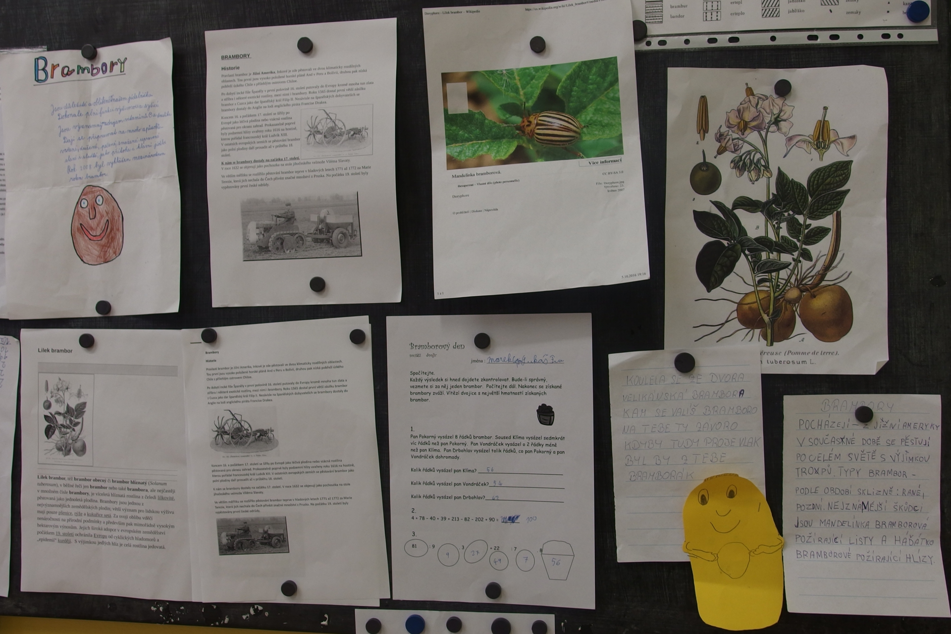 Pokračovaly ve třídě řešením bramborových příkladů, čtením referátů, vážením, soutěží dvojic a tvořením vlastní legrační brambory na počítači. Den žáci zakončili při odpoledním vyučování. Vyrobili si bramborová razítka a tiskli bramborový hrad, zbytek brambor nakrájeli na plátky a upekli v troubě. Byla to dobrota.
