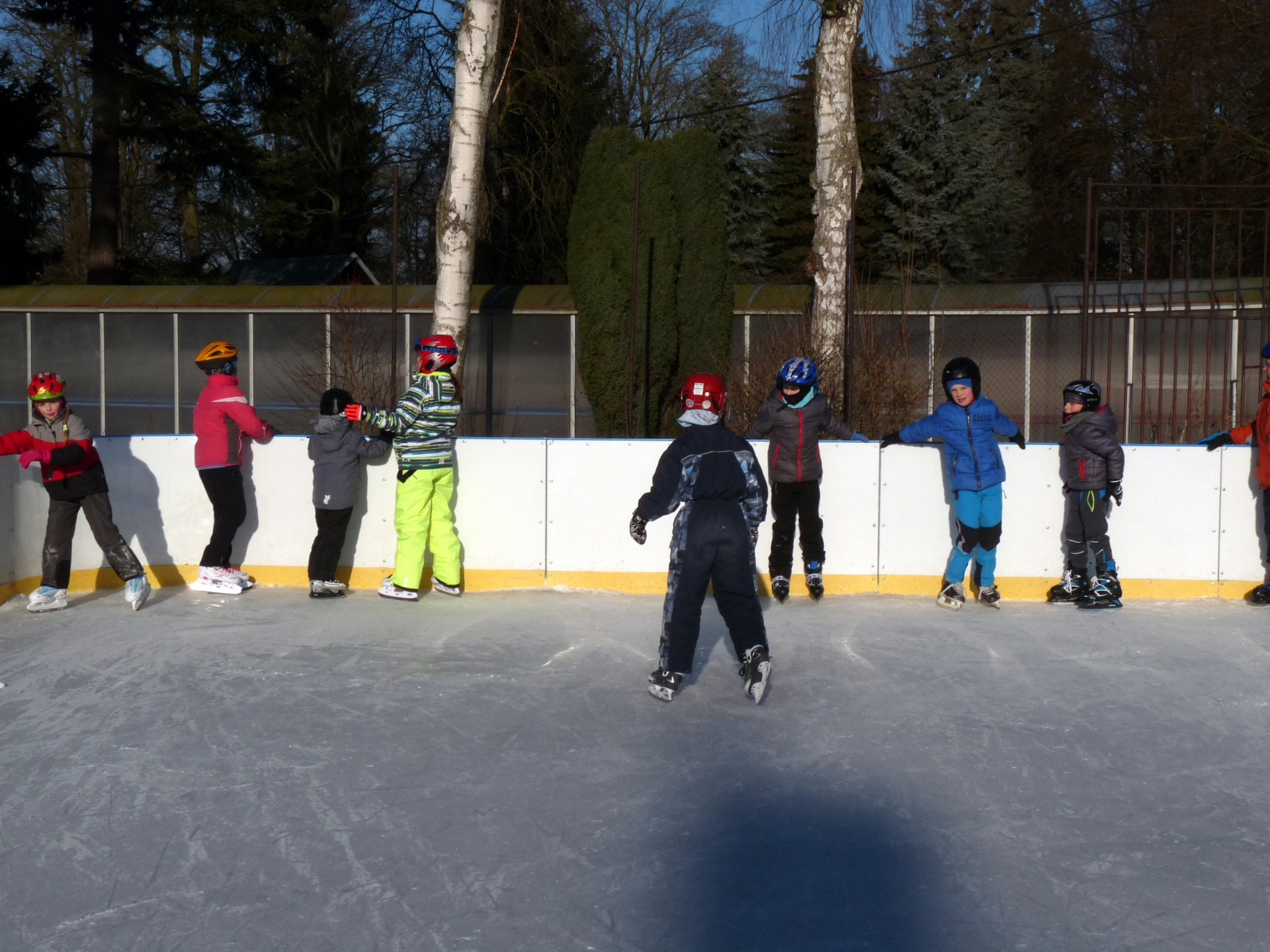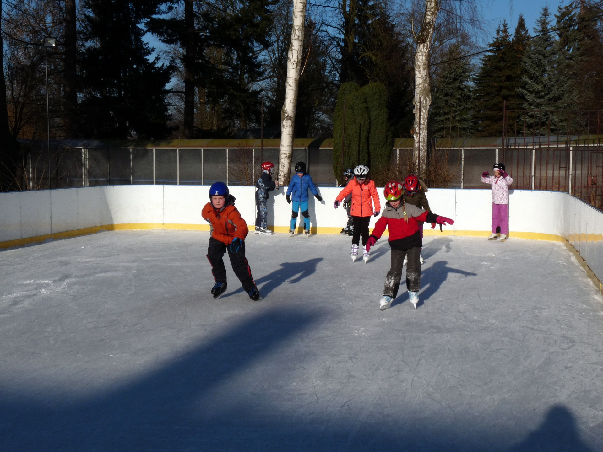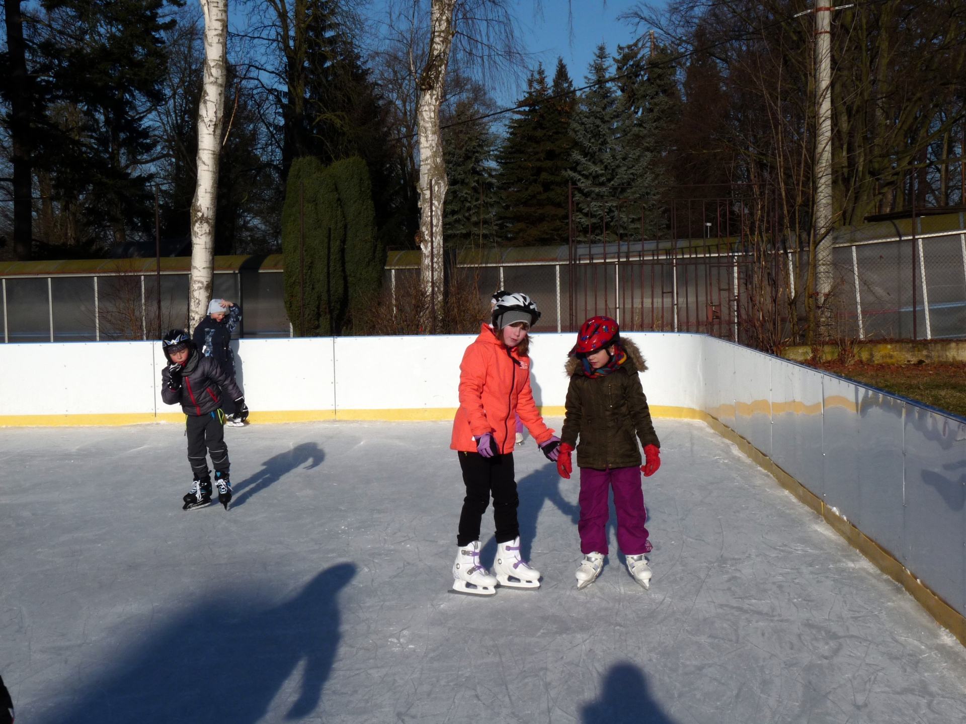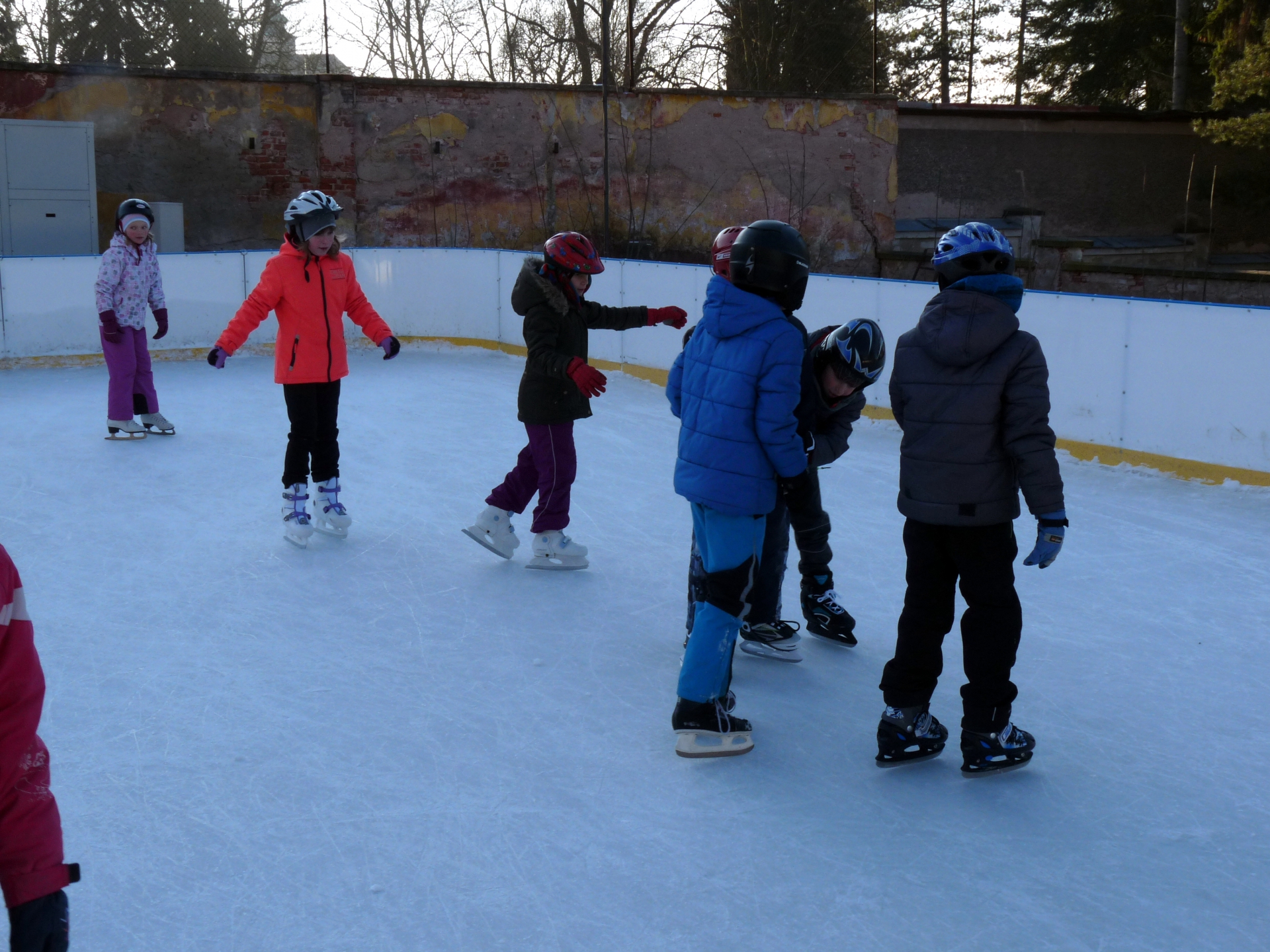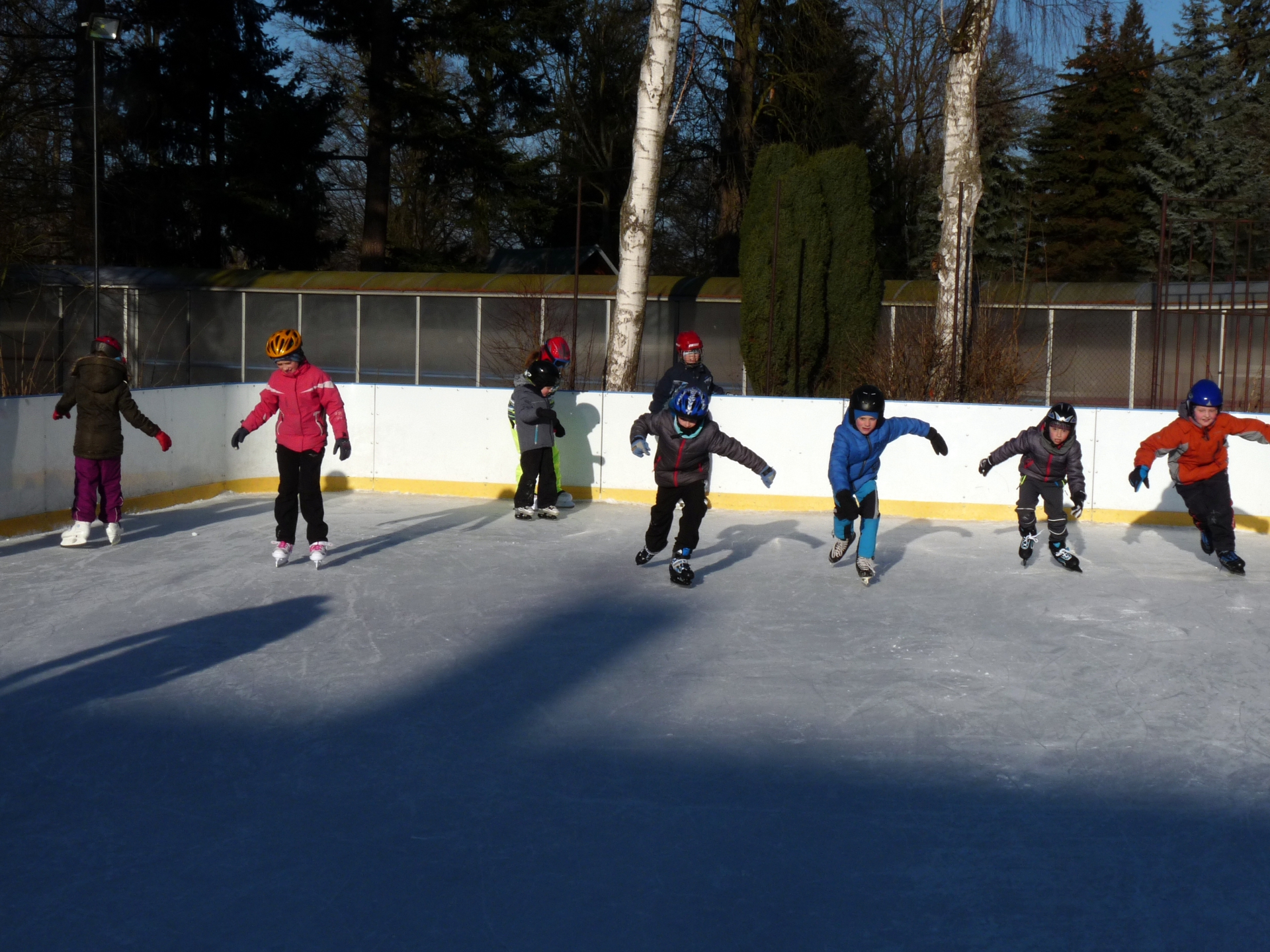 Navíc nám přálo počasí a ohřívalo nás sluníčko. Na ledě si děti zahrály na olympiádu, učily se bruslit a společně si zahrály na vlky a ovečky.