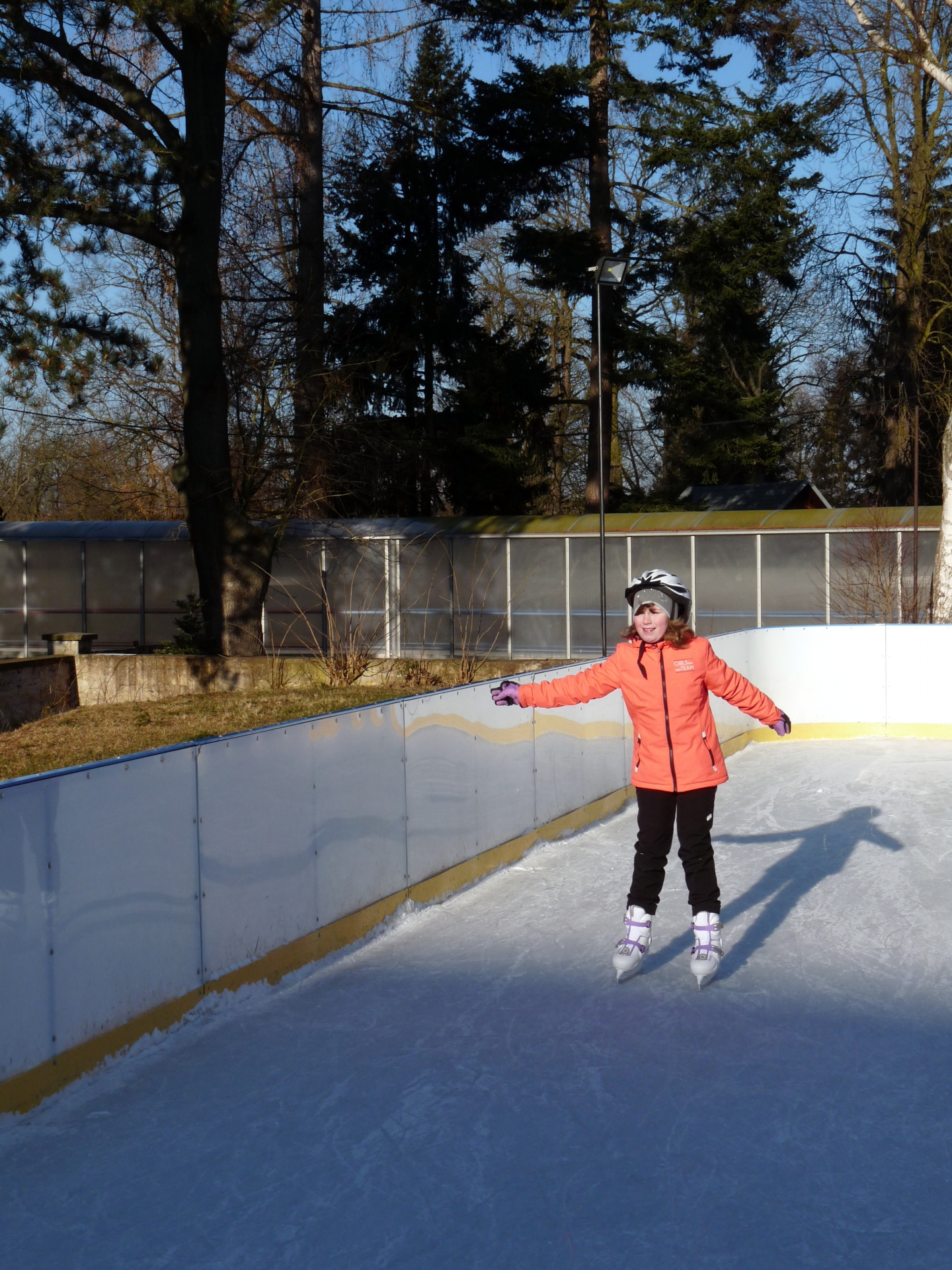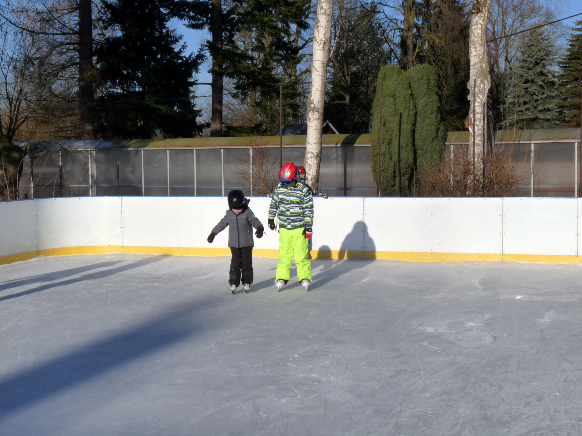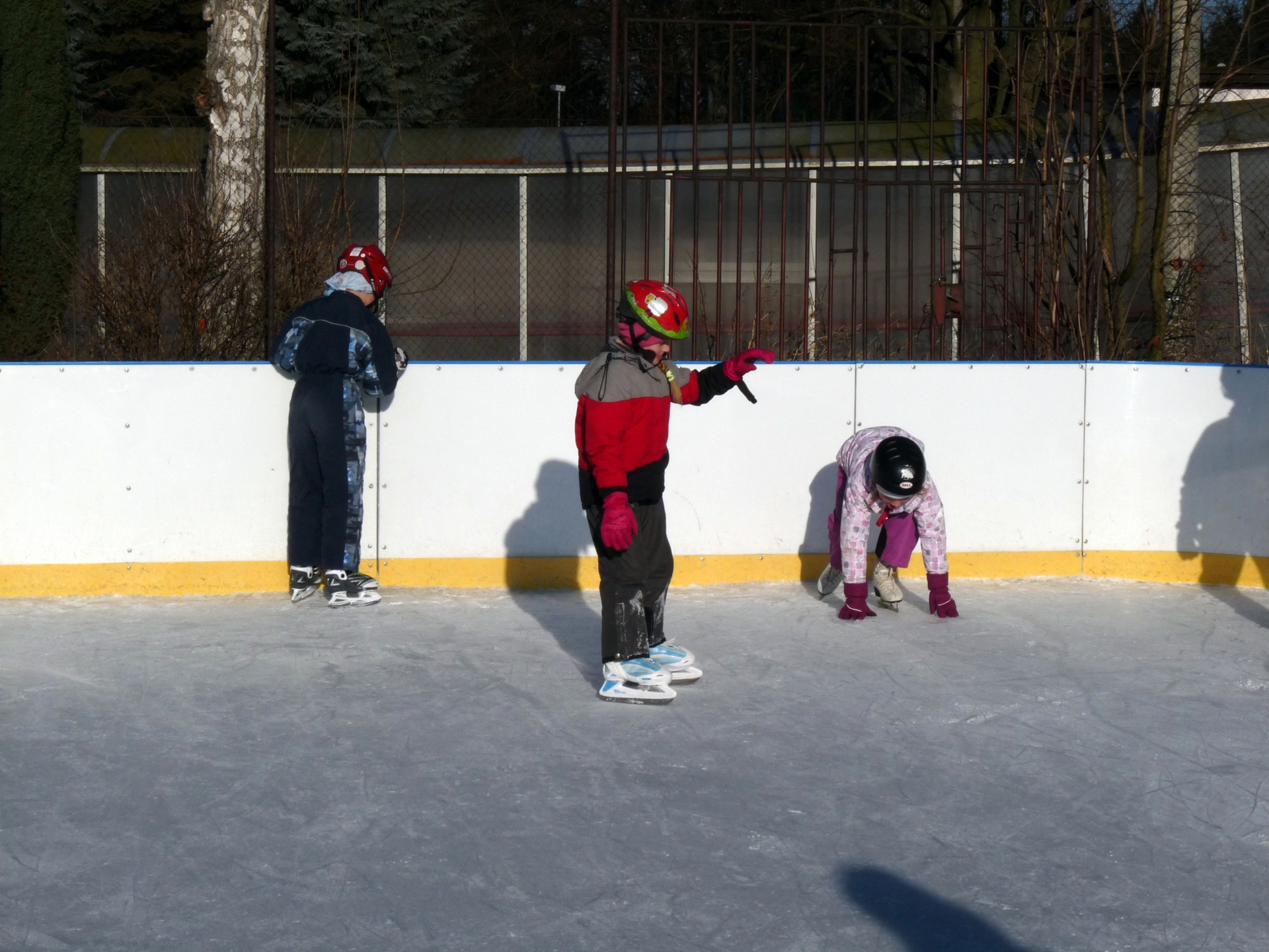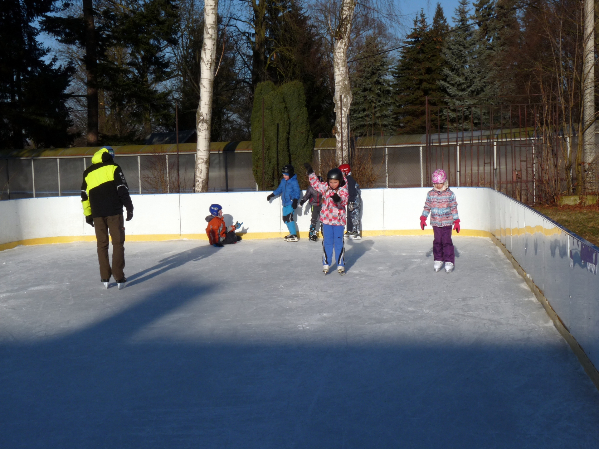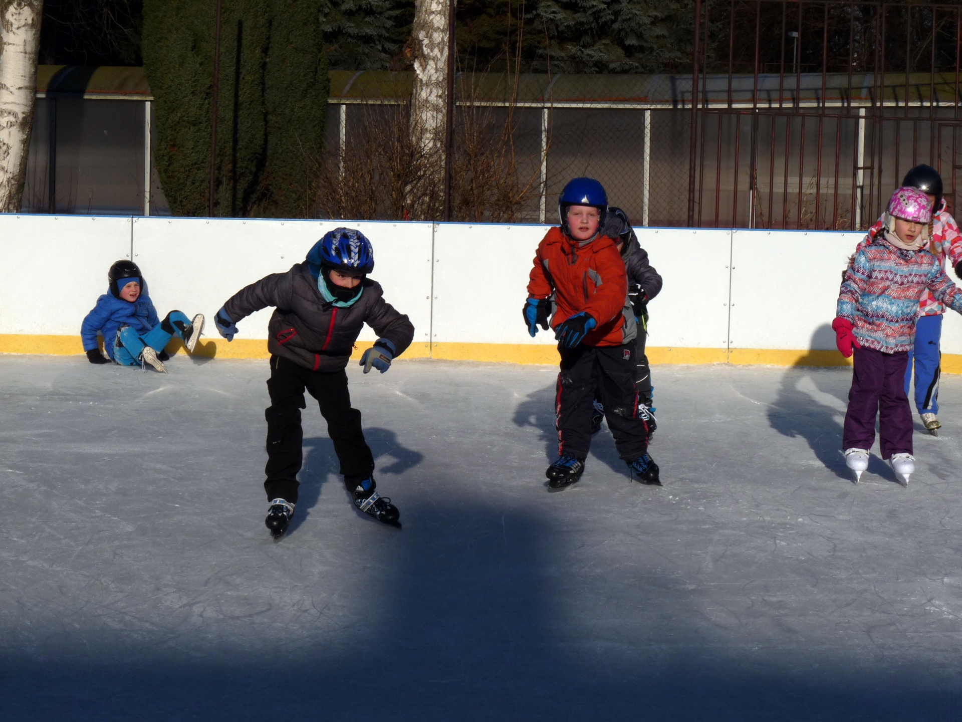 Navíc nám přálo počasí a ohřívalo nás sluníčko. Na ledě si děti zahrály na olympiádu, učily se bruslit a společně si zahrály na vlky a ovečky.