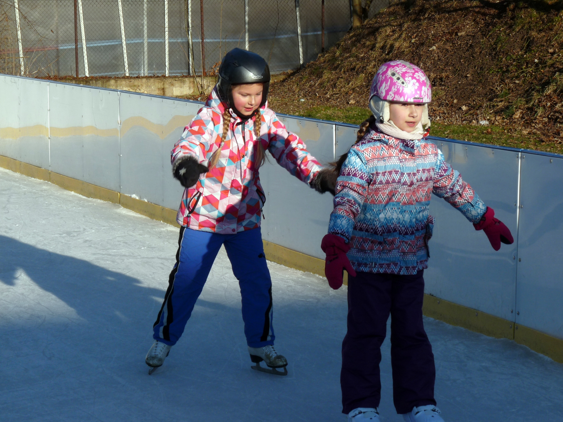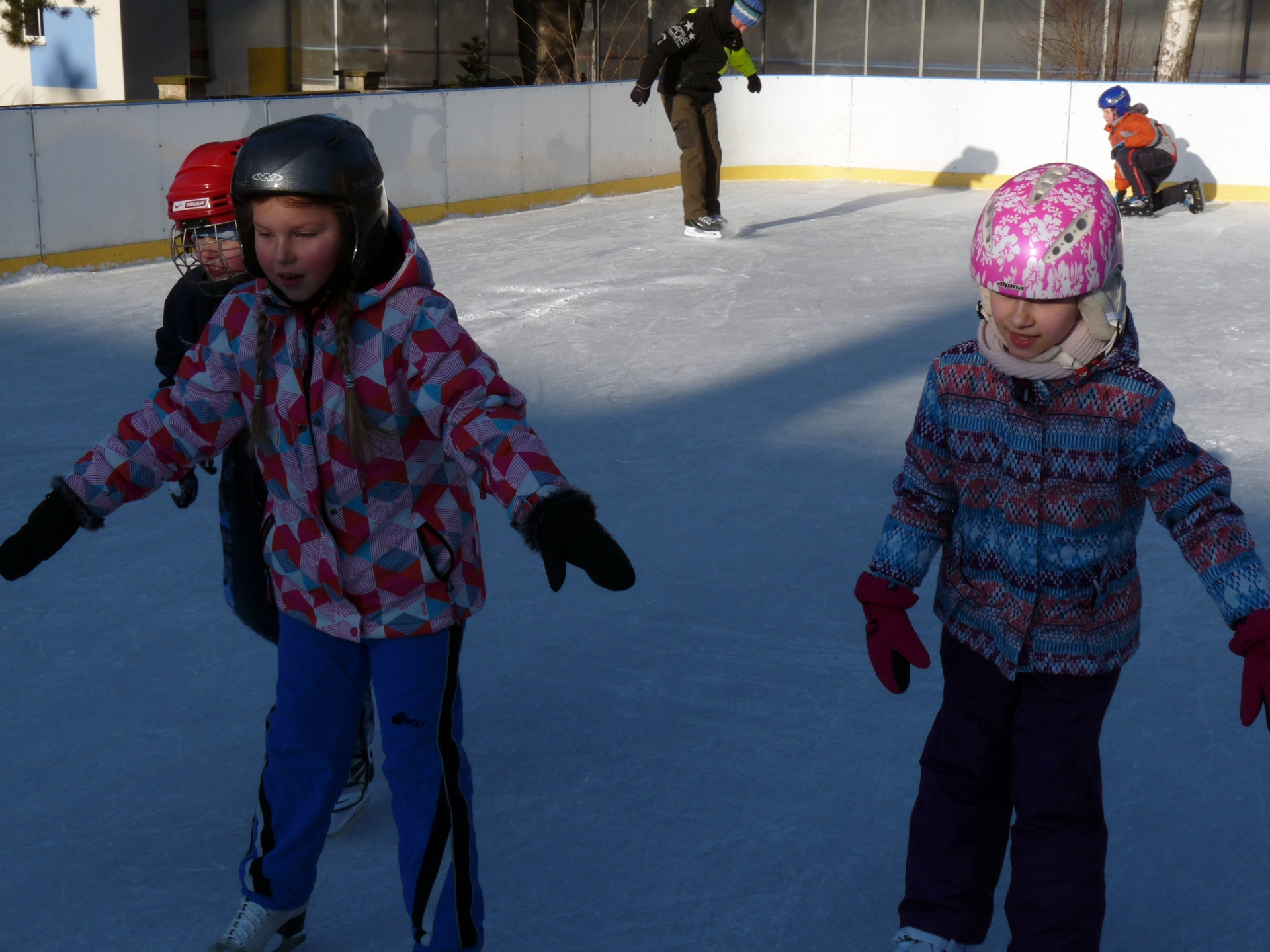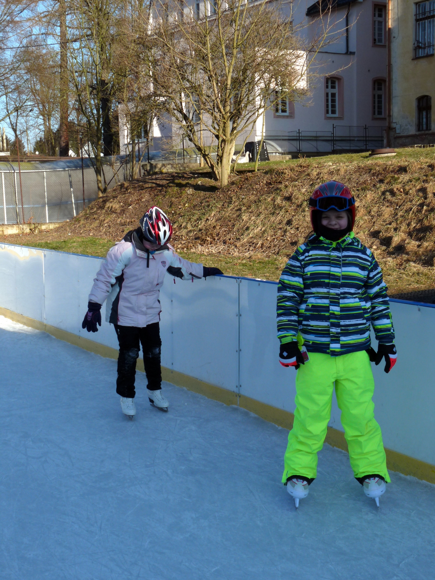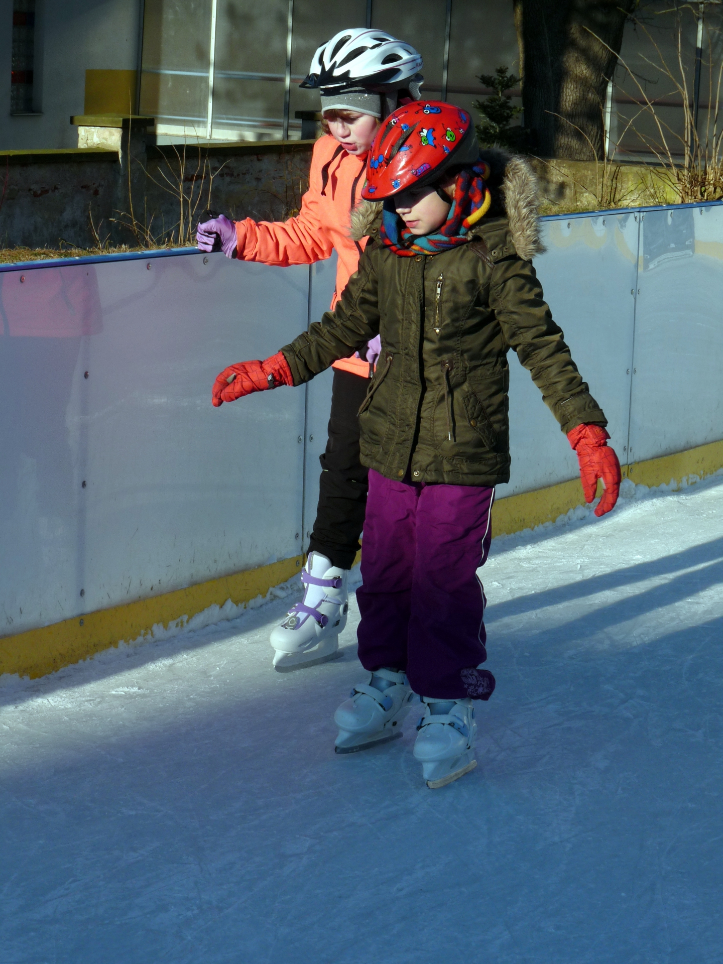 Navíc nám přálo počasí a ohřívalo nás sluníčko. Na ledě si děti zahrály na olympiádu, učily se bruslit a společně si zahrály na vlky a ovečky.