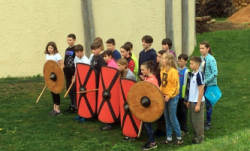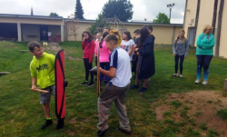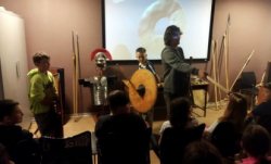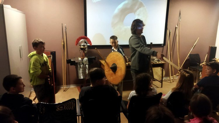 Absolvovali jsme programy Řím - život společenských vrstev ve městech a Řím - vojenský systém - legie. Někteří z nás se na chvíli stali římskými patricii, jiní jejich rodinnými příslušníky nebo dokonce osobními strážci či otroky. Což bylo potvrzeno i dobovým převlekem. Po přestávce jsme zamířili do komorního kinosálu, kde si přišli na své především páni kluci - přehlídka mečů, brnění, přilby, dýky a štíty - doprovázené erudovaným výkladem a posléze i výcvikem římských legií ve zbroji.