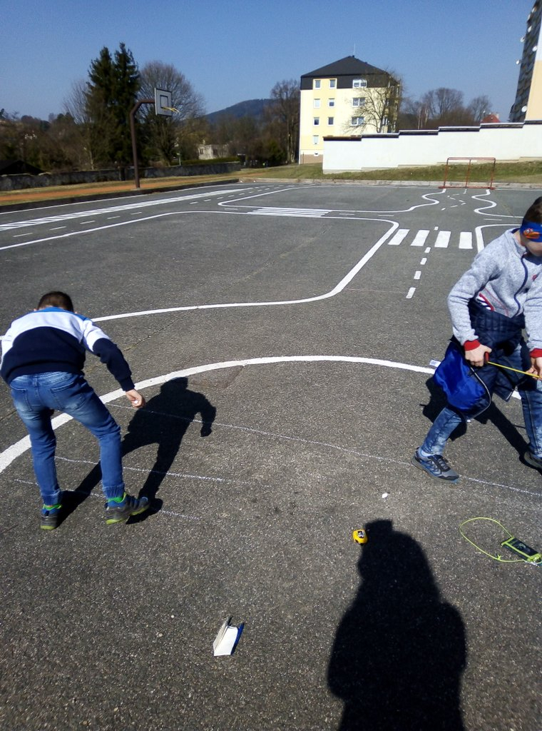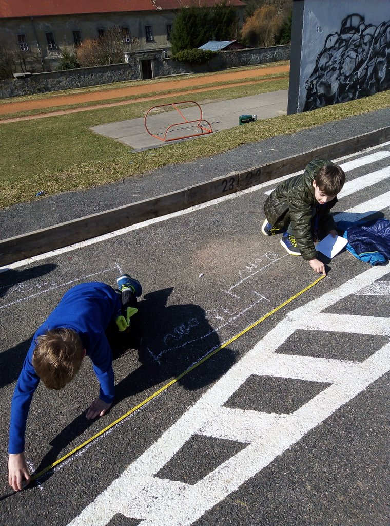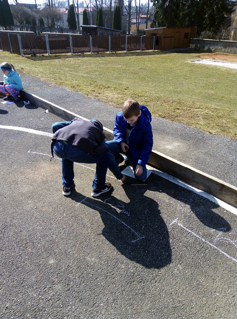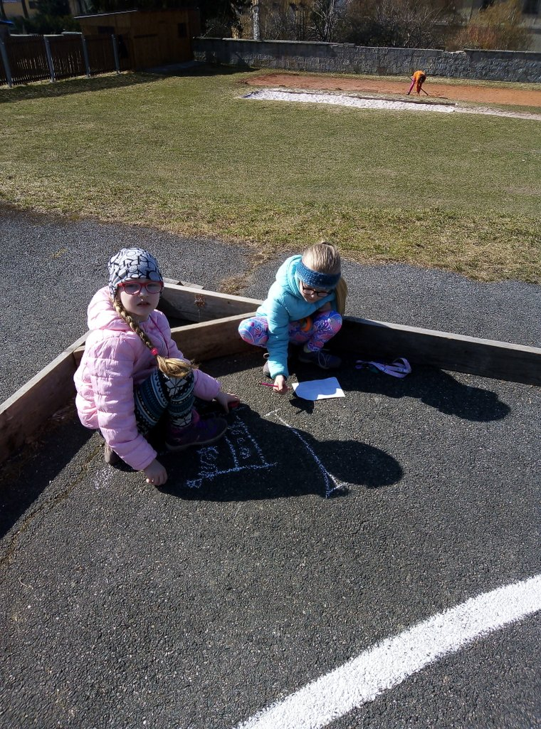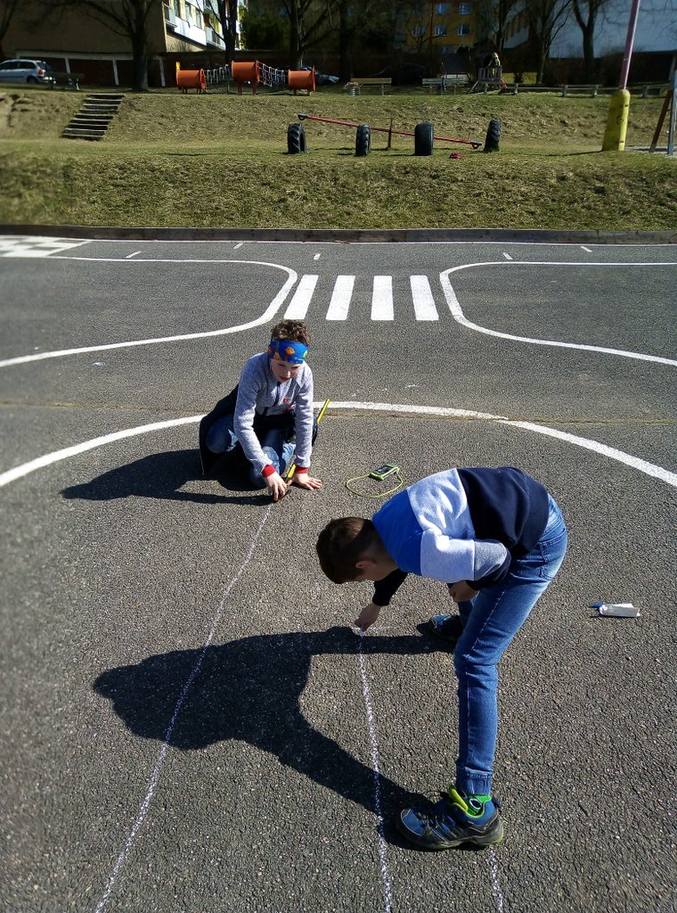 Pak jsme se přesunuli na dětské hřiště. Zde děti „rýsovaly“ úsečky daných délek, měřily úsečky , které byly na hřišti připraveny. Zkoušely měřit délku kroku, skoku. Poslední úkol zněl: zjisti délku a šířku hřiště.