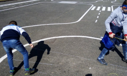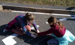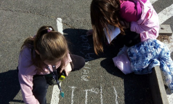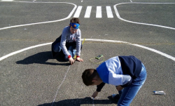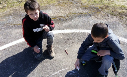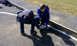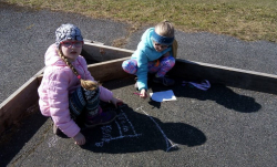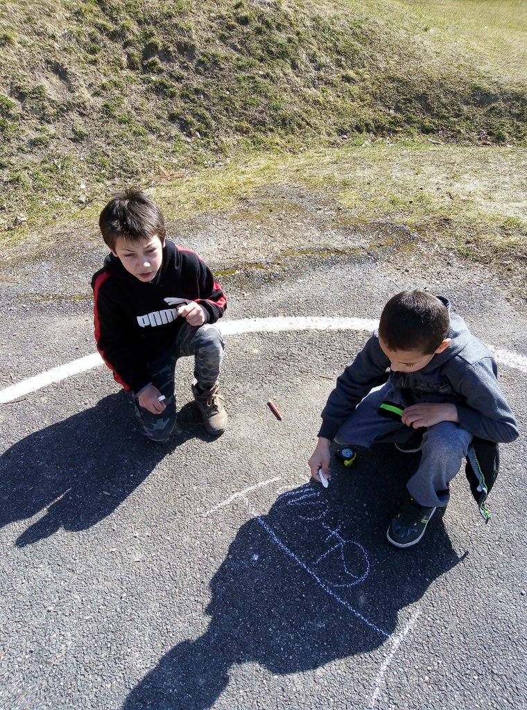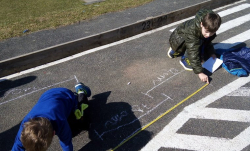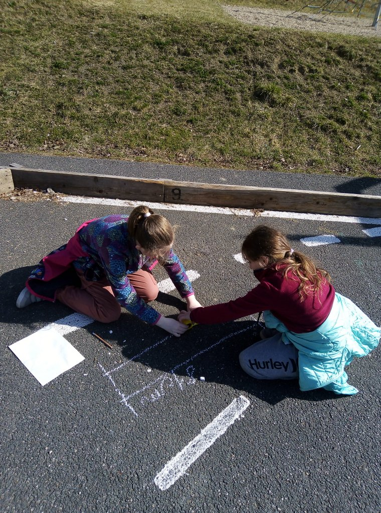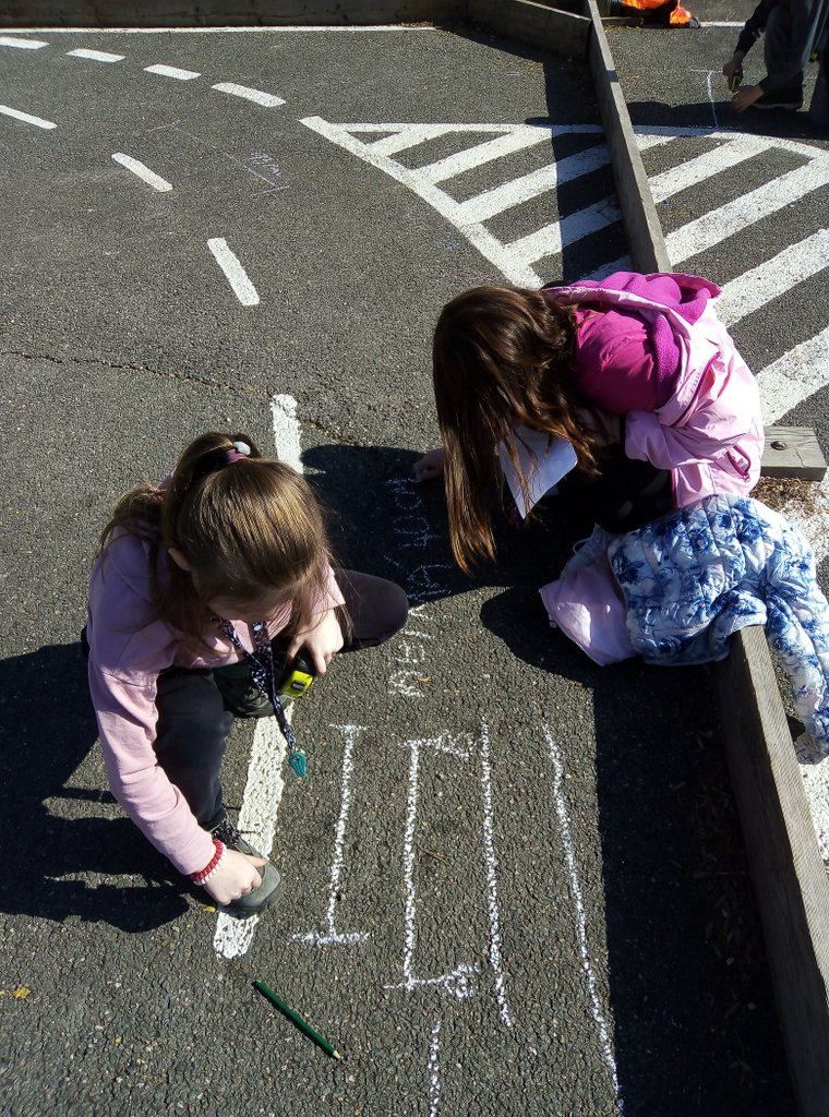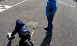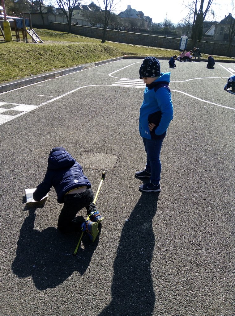 Pak jsme se přesunuli na dětské hřiště. Zde děti „rýsovaly“ úsečky daných délek, měřily úsečky , které byly na hřišti připraveny. Zkoušely měřit délku kroku, skoku. Poslední úkol zněl: zjisti délku a šířku hřiště.