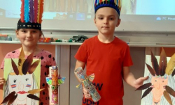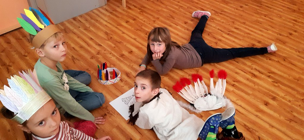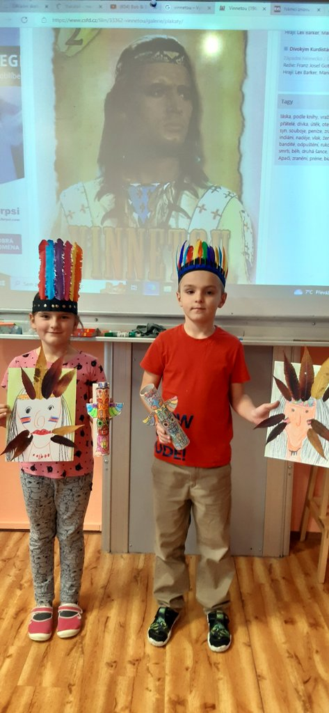 Při Estetice jsme vyráběli indiána s čelenkou lepenou z podzimních listů, každý si také udělal svůj totem a na památku na projektové dny si děti vyrobily indiánskou záložku do knížky.