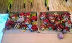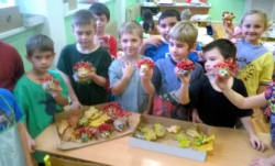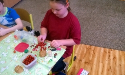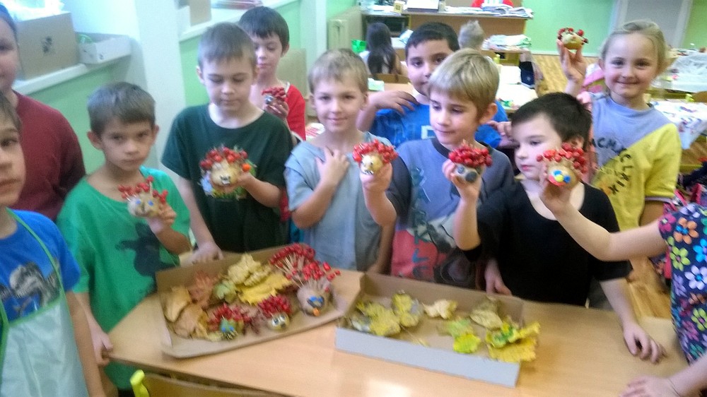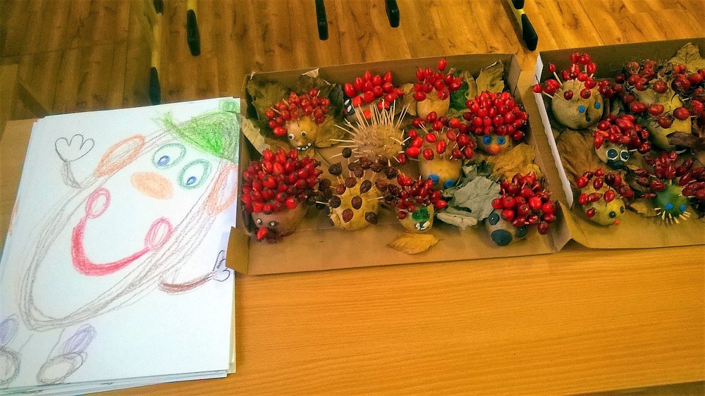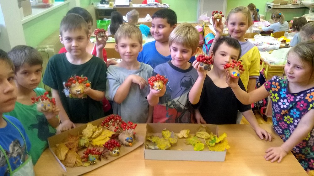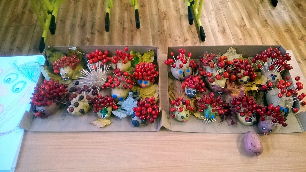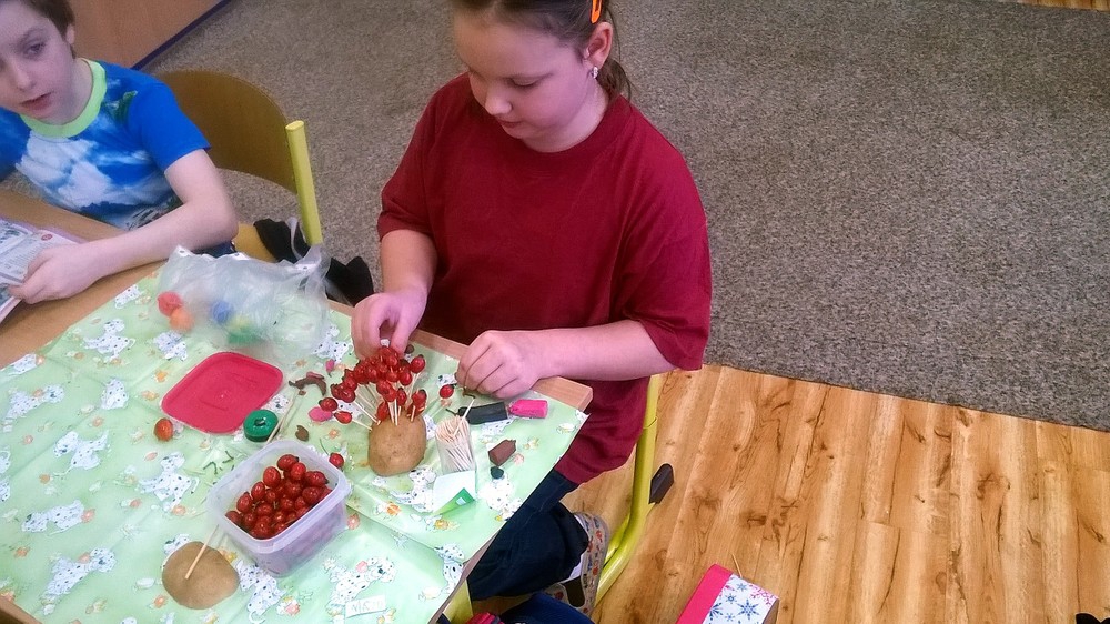 Zatímco v 1. A žáci pracovali podle vylosovaných písmenek ve skupinkách jako Hranolky, Špalíčky, Chipsy a Krokety, v béčku zase v tělocvičně při TV s bramborami soutěžili v „sázení a sklízení“ brambor. Brambory jsme rovnali podle velikosti, počítali jsme je, řešili jsme matematickou Bramboriádu. V Českém jazyce jsme sestavovali různá písmena a pomocí uvolňovacích cviků jsme malovali Veselou bramboru. Podle pohádky o Brambůrkovi a o drakovi, který měl rád brambory, jsme si připravili pokus s bramborou, která zůstane ve třídě na okně – v teple a na světle. Co se s ní asi stane? Při druhé pohádce jsme si zase procvičili jemnou motoriku a každý si oloupal a snědl jednu malou vařenou bramboru. A začalo vyrábění. Nejprve si děti vyrobily podzimního ježečka a poté jsme tiskali brambory do pytle.