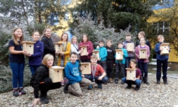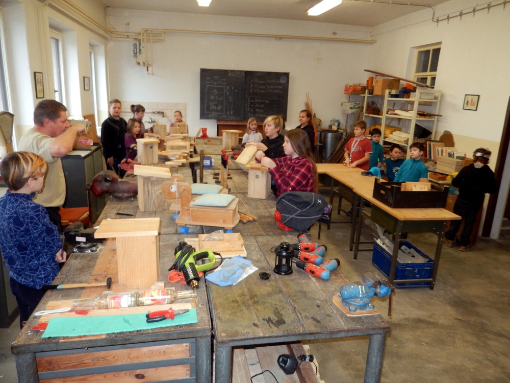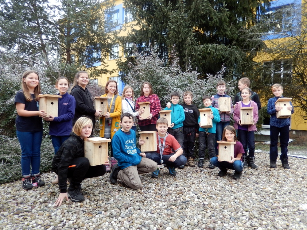 Na záčátku bylo pár prkýnek a dnes už máme hotovo ! Žáci páté třídy dokončili svá díla a mají pro létavé kamarády připraveny bydlíky na jaro... tak se trochu pochlubíme společnou fotkou a budeme se těšit na nájemníky.