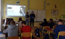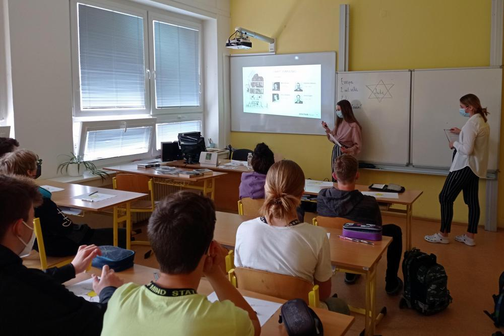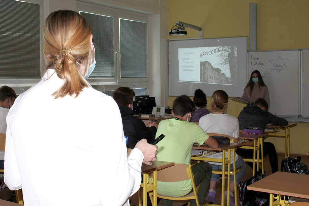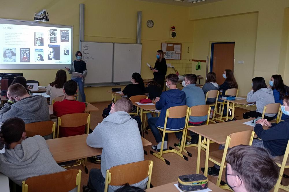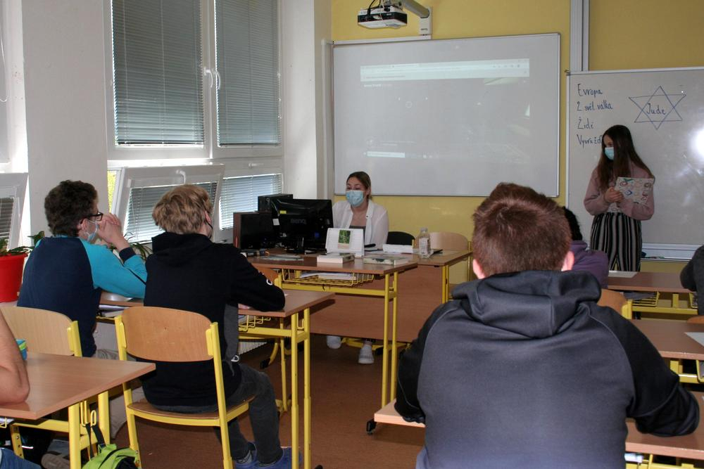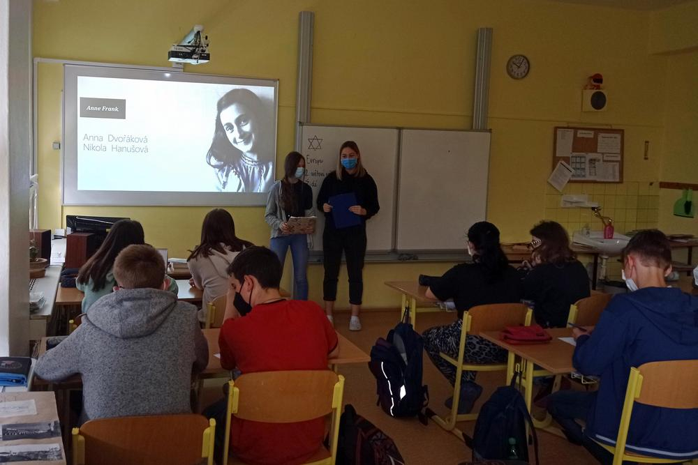 Dlouho jsme přemýšleli, jak výstavu „oživit“. Bylo nám líto, že je výstava uložena v Broumově a žáci s ní nemohou pracovat. V období přechodného uvolnění nás podpořilo oddělení kultury MěÚ Broumov a instalovalo výstavu v Broumově na Staré radnici. Zapojení žáci ji pak po jednom mohli navštívit a seznámit se s ní. Současně jsme zahájili videokonference s lektorkami, ty probíhaly přes Zoom od února do května. Žáci si samostatně a převážně ve svém volném čase prostudovali velké množství materiálů. Ve dvojicích pak navrhli svoje projekty, jak zprostředkovat výstavu spolužákům a veřejnosti. Vzniklo několik prezentací a krátkých videí. Žáci se vrátili do školy. V současné době naše účastnice projektu Nikola Hanušová a Anna Dvořáková z 9.A prezentují výsledky svého bádání svým spolužákům v devátých a osmých třídách.
