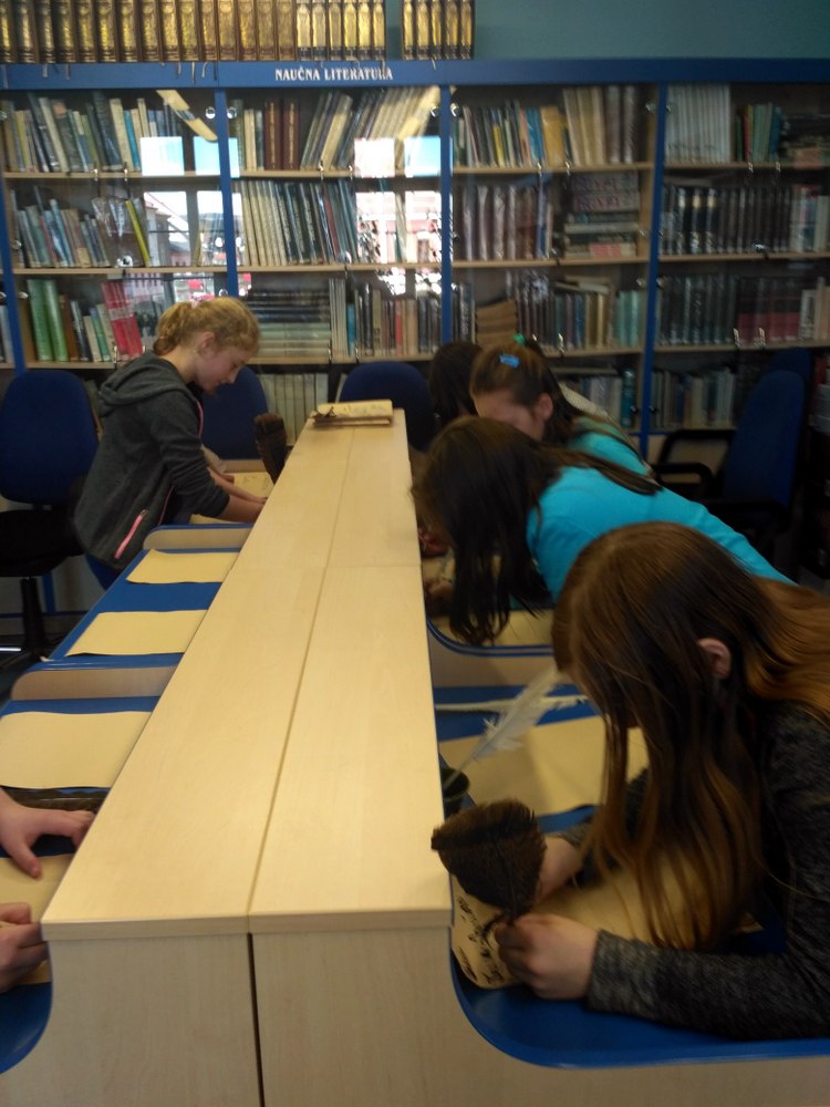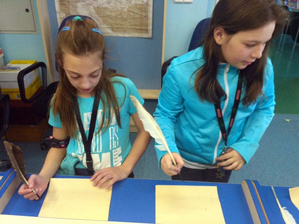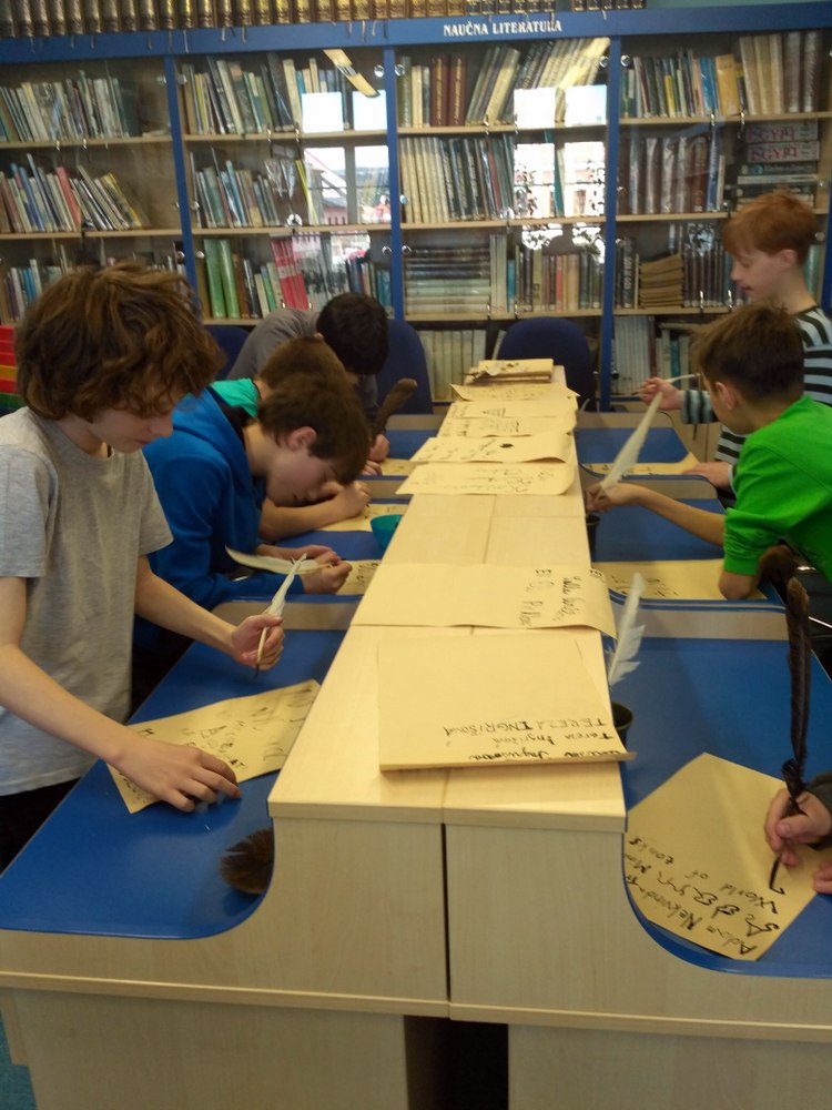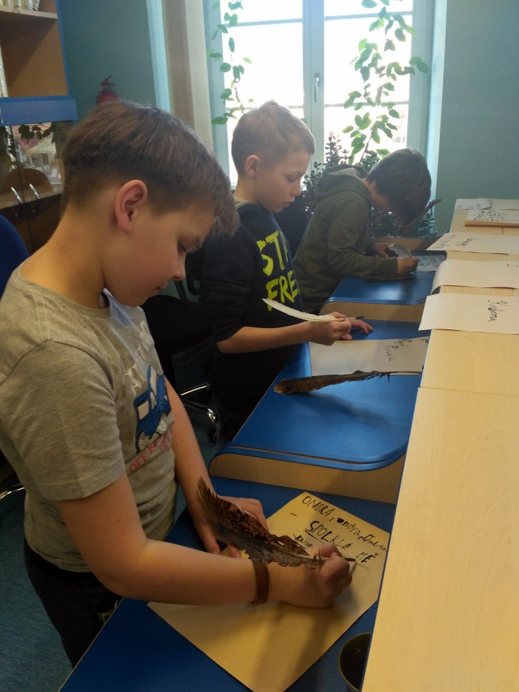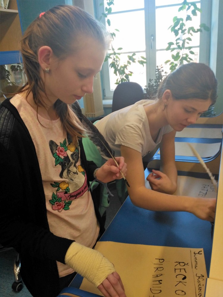 Žáci se spolu s hlavním hrdinou knihy Kláry Smolíkové Davidem vydávají do dob minulých a poznávají a zkoušejí, jak a na co se dříve psalo. Zkusí si psát husím brkem na "pergamen", rýt klínové písmo do hliněných destiček a kreslit hieroglyfy. Děkujeme knihovně a zvlášť Katce Boučkové za další skvělý program.