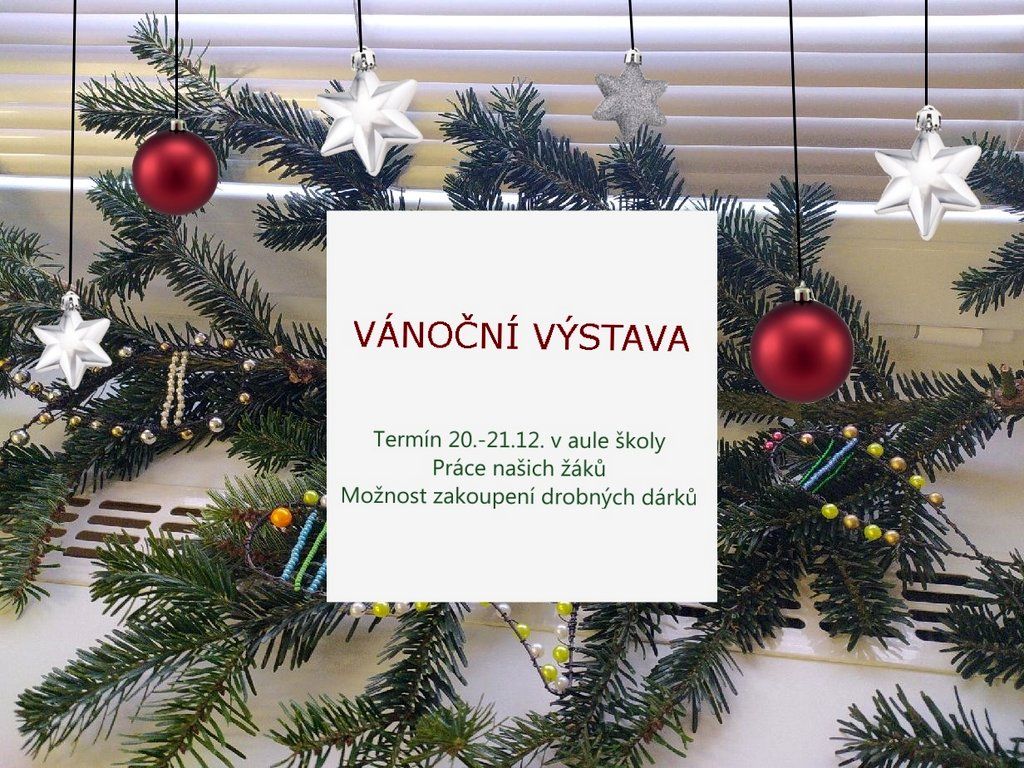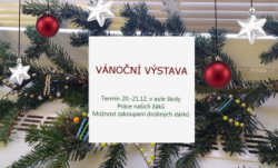 Ve dnech 20.-21.12. probíhá v naší škole výstava žákovských prací. Výstavu žáci mohou navštívit během vyučování v rámci výuky. Mají možnost si též zakoupit drobný dárek.