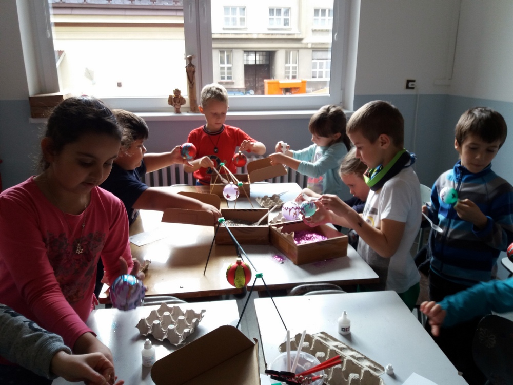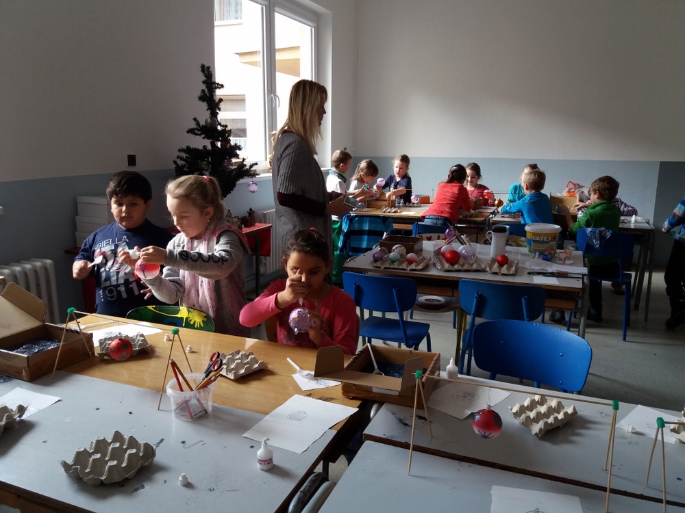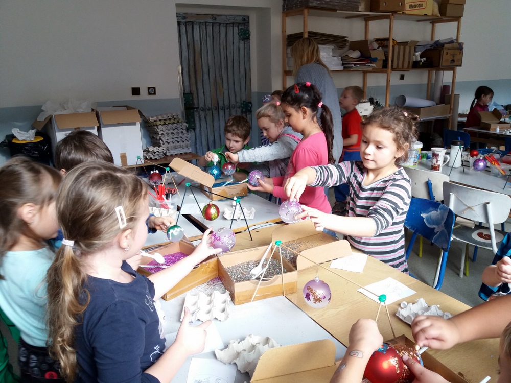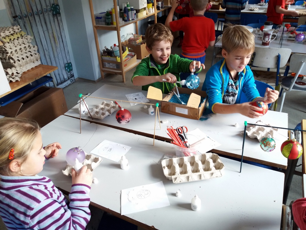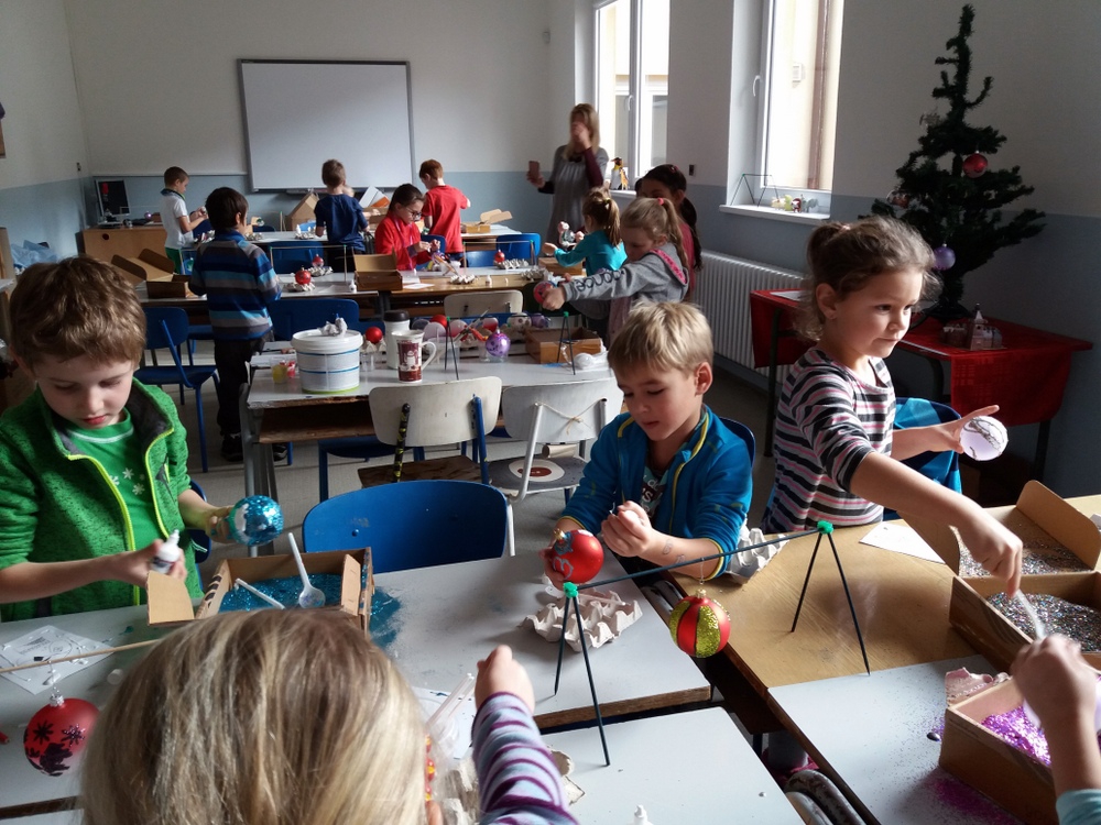 Nejdříve jsme si museli vymyslet motiv, který chceme na kouličce mít. Poté jsme si ho důkladně nakreslili na papír a podle vytvořeného nákresu jsme se při zdobení řídili. Každý si mohl vybrat barvu své ozdoby stejně jako třpytky. Byli jsme pochváleni za trpělivost a pečlivou práci.