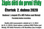 Zápis do 1. třídy pro školní rok 2020/2021 proběhne ve čtvrtek 2. dubna 2020. Všechny potřebné informace jsou v přiložených souborech.
