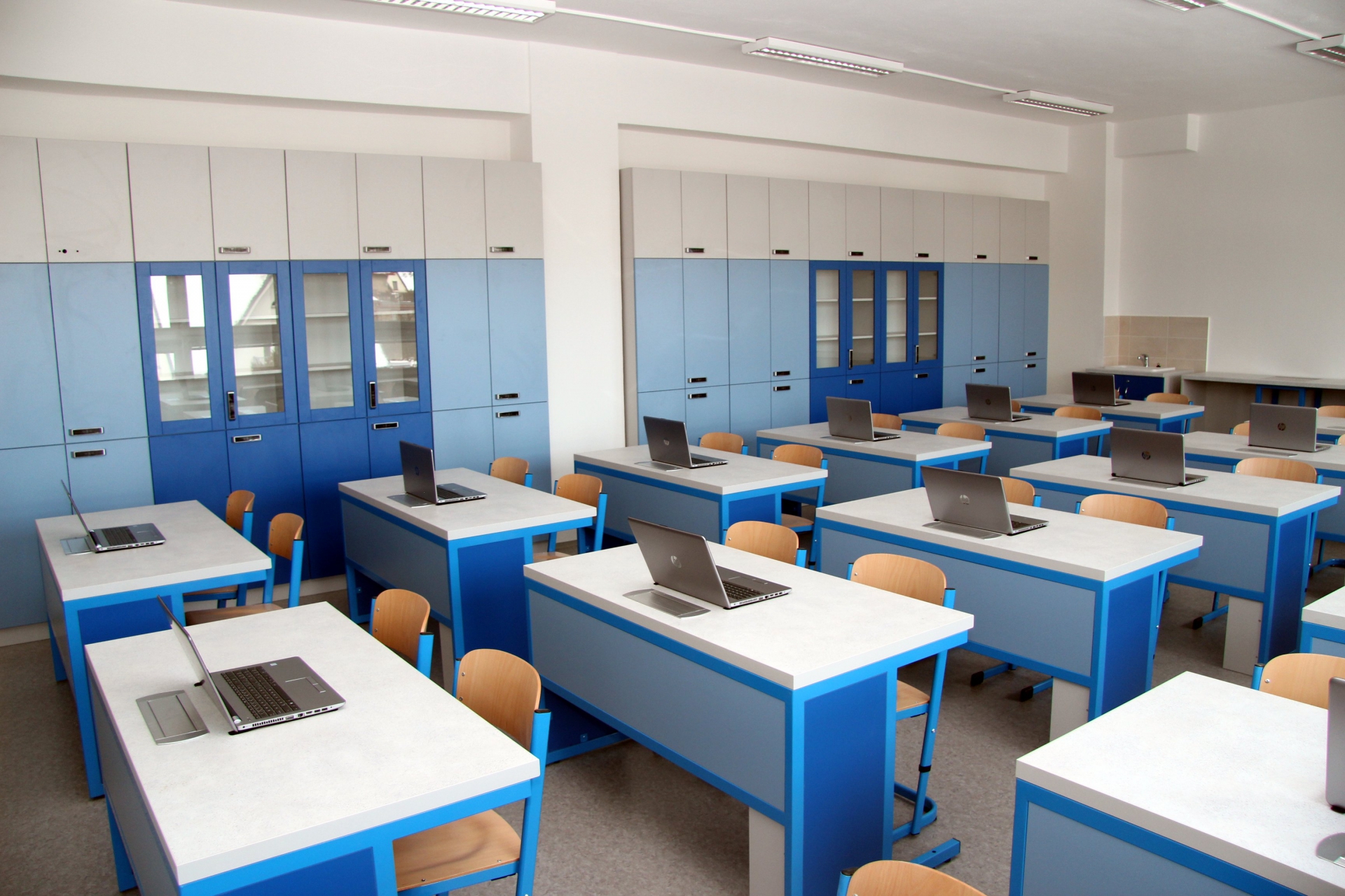 Odstíny modré na nábytku doplňuje šedivá a bílá. Jedná se o odbornou učebnu, proto je v zadu dlouhý stůl na pokusy. V přední části je vyvýšený učitelský stůl, katedra. Učebna je nejen hezká, ale i moderní. Vedle je kabinet fyziky. Přejeme si, aby se v učebně dobře učilo fyzikářům a i nám žákům.
