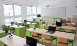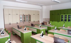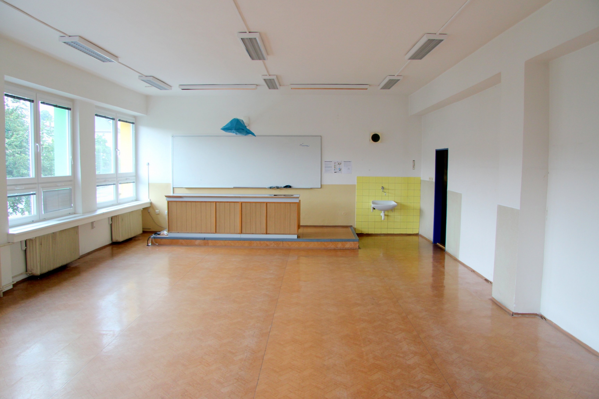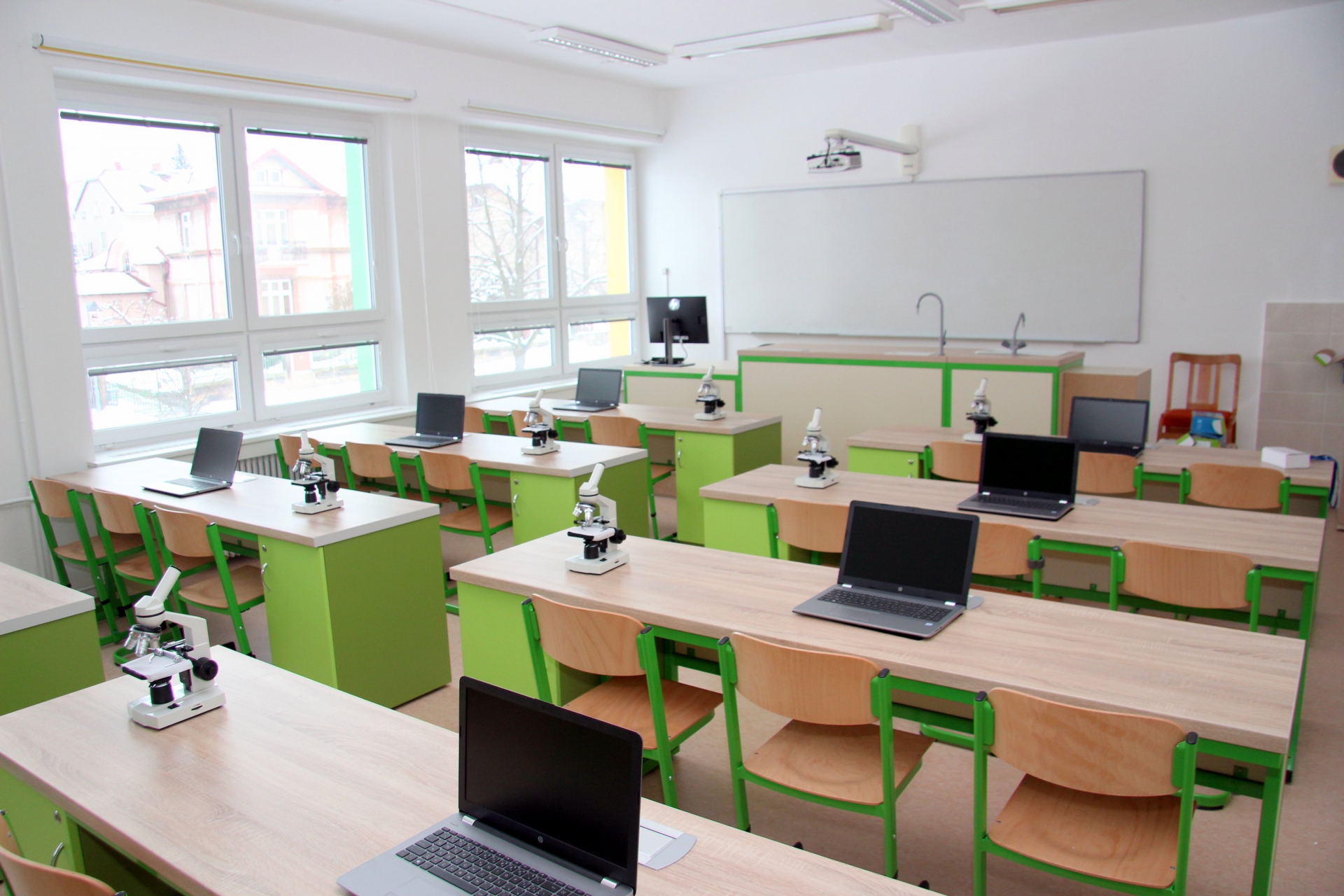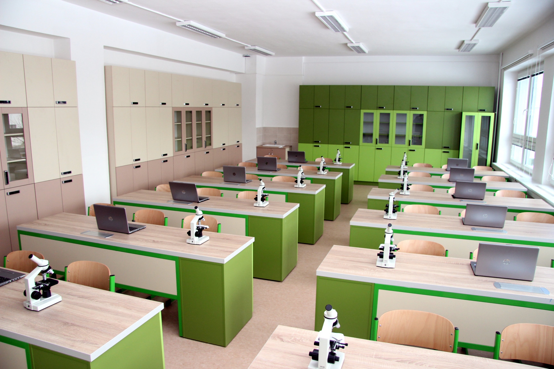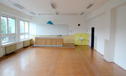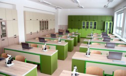 Učebna přírodopisu má jen dvě řady po šesti lavicích a v každé lavici jsou tři židle a jedna skříňka. Je zde 37 židlí včetně učitelského místa.