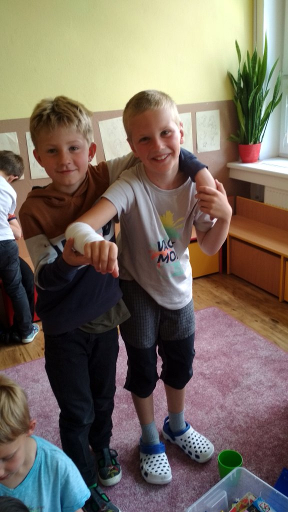 Poslední měsíc si prvňáčkové vyhodnotili lehkoatletický čtyřboj, setkali se s policejním preventistou por. Mgr. M. Mervartem, hráli si, učili se první pomoc, malovali a seznamovali se s přírodou. Odměnu – zmrzlinu si určitě všichni zasloužili. Teď si jen musíme popřát pěkné prázdniny.